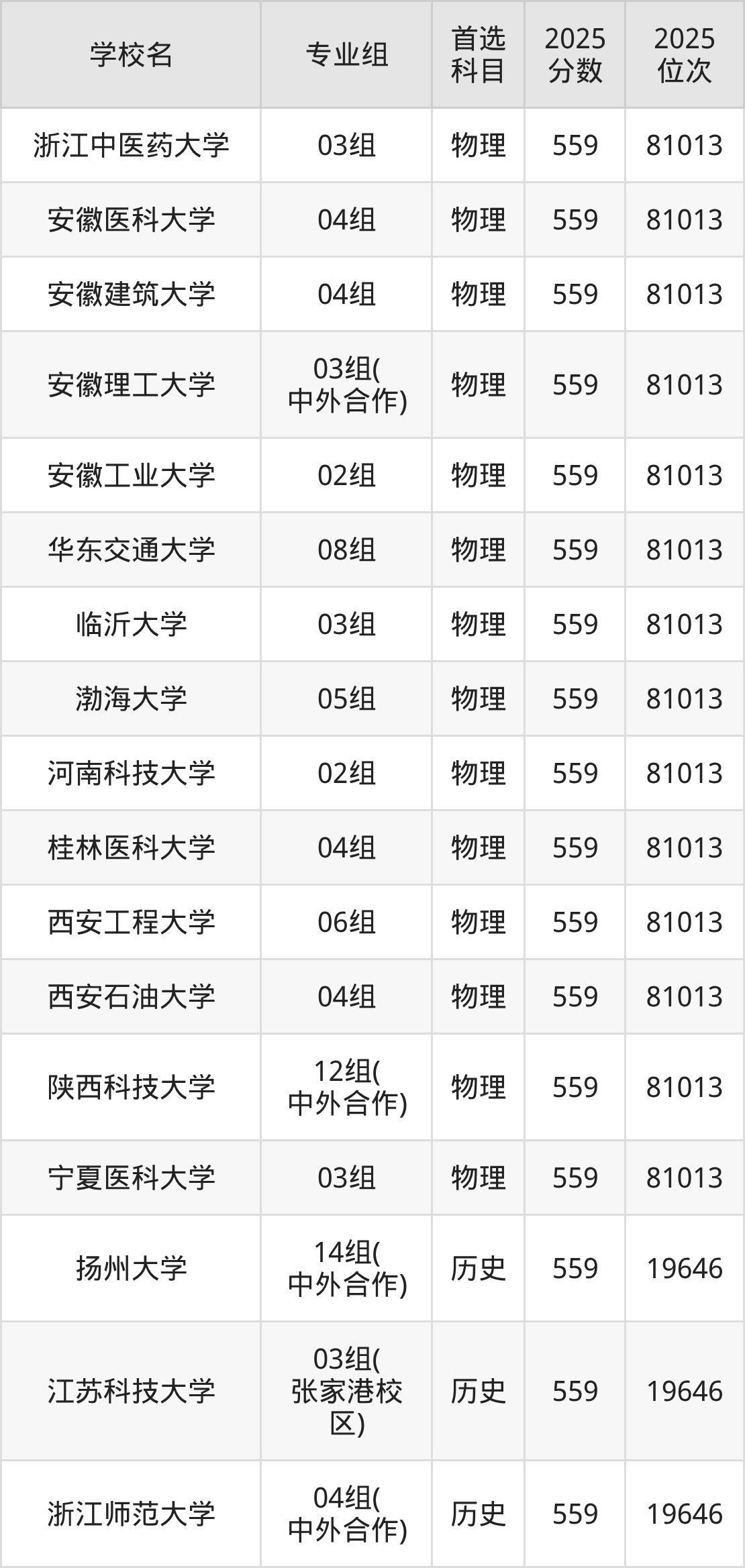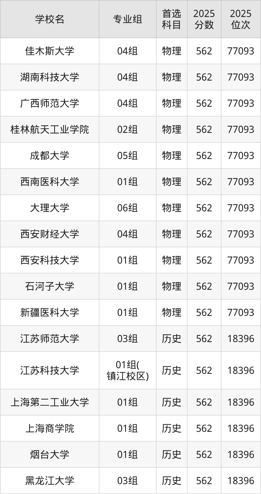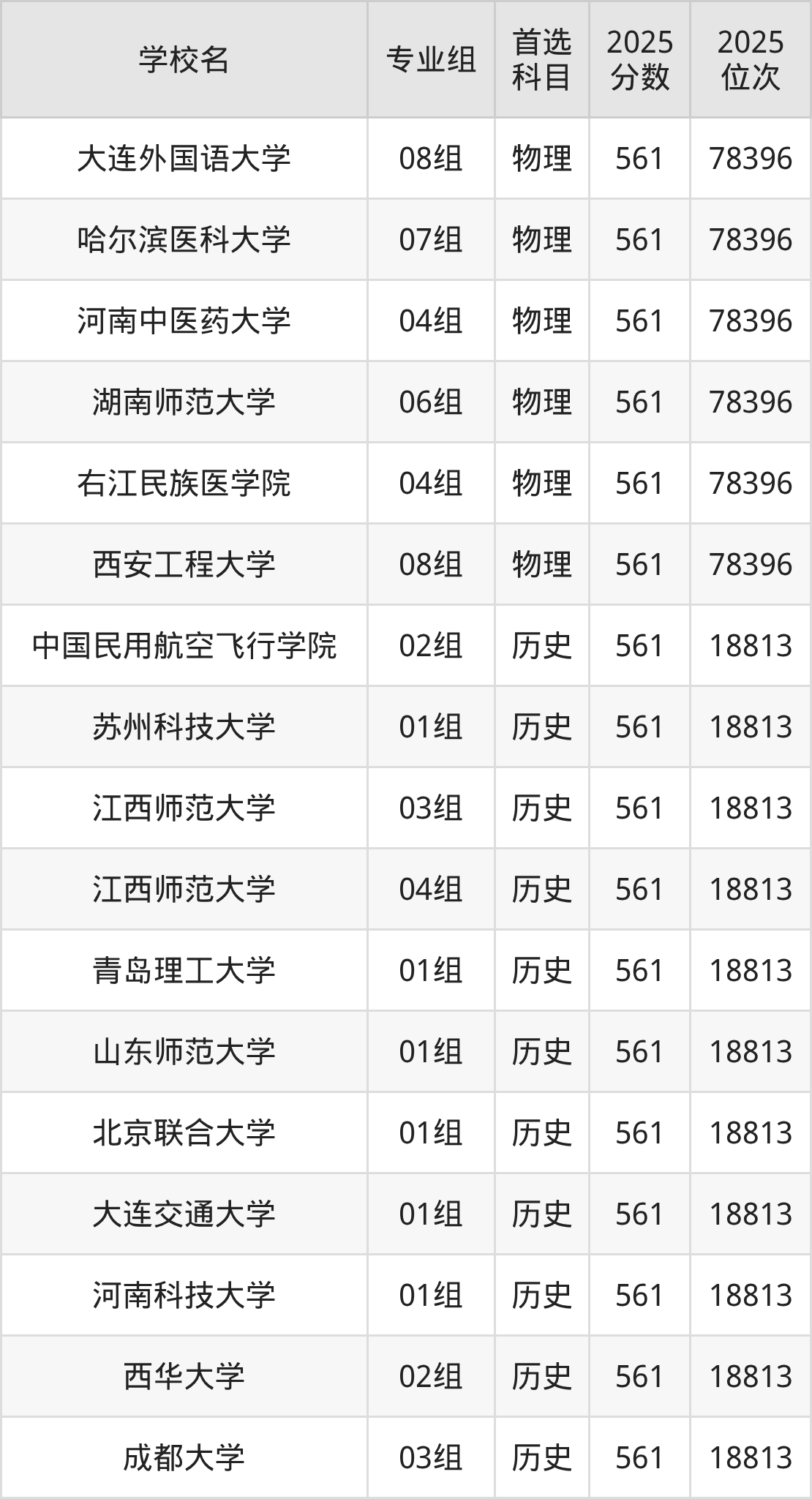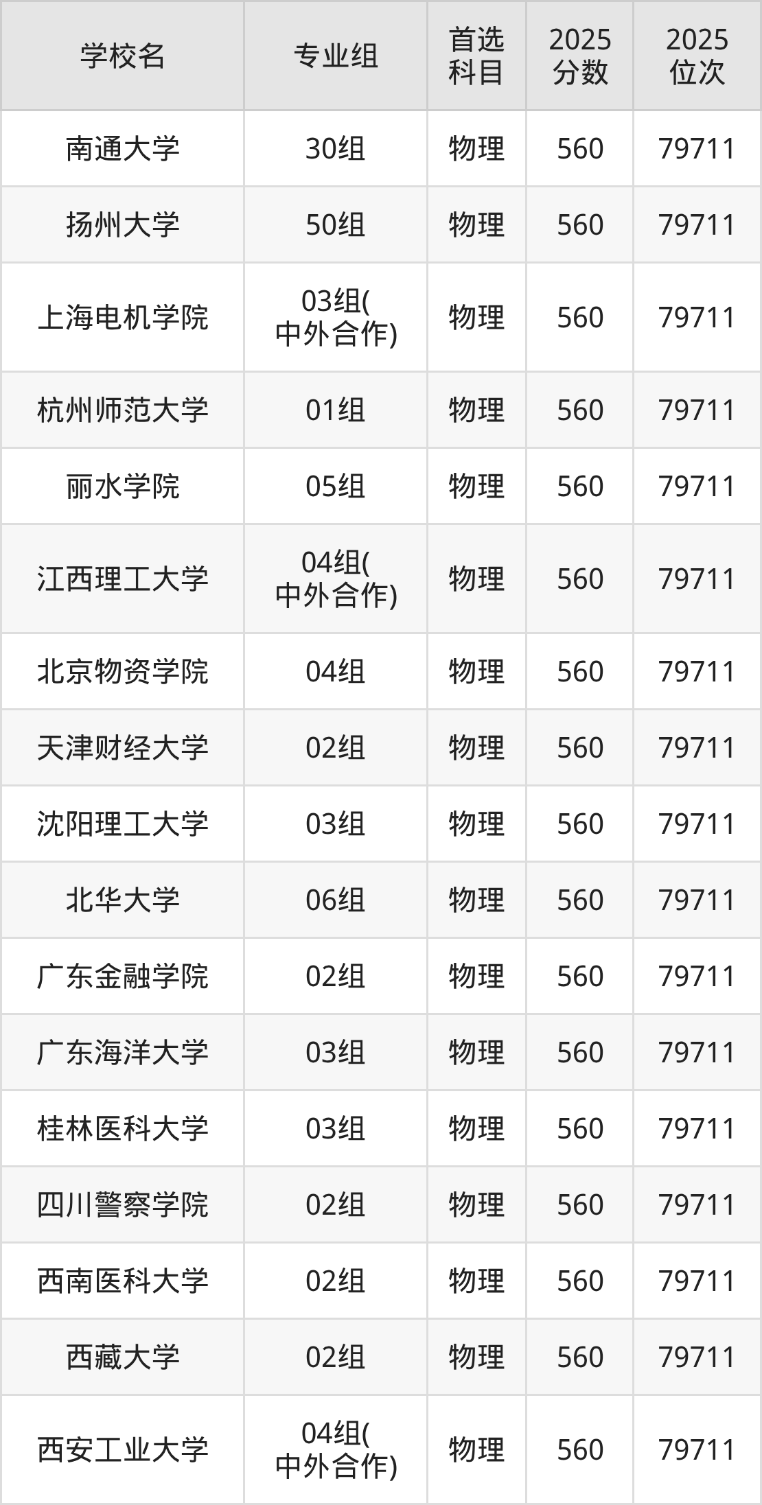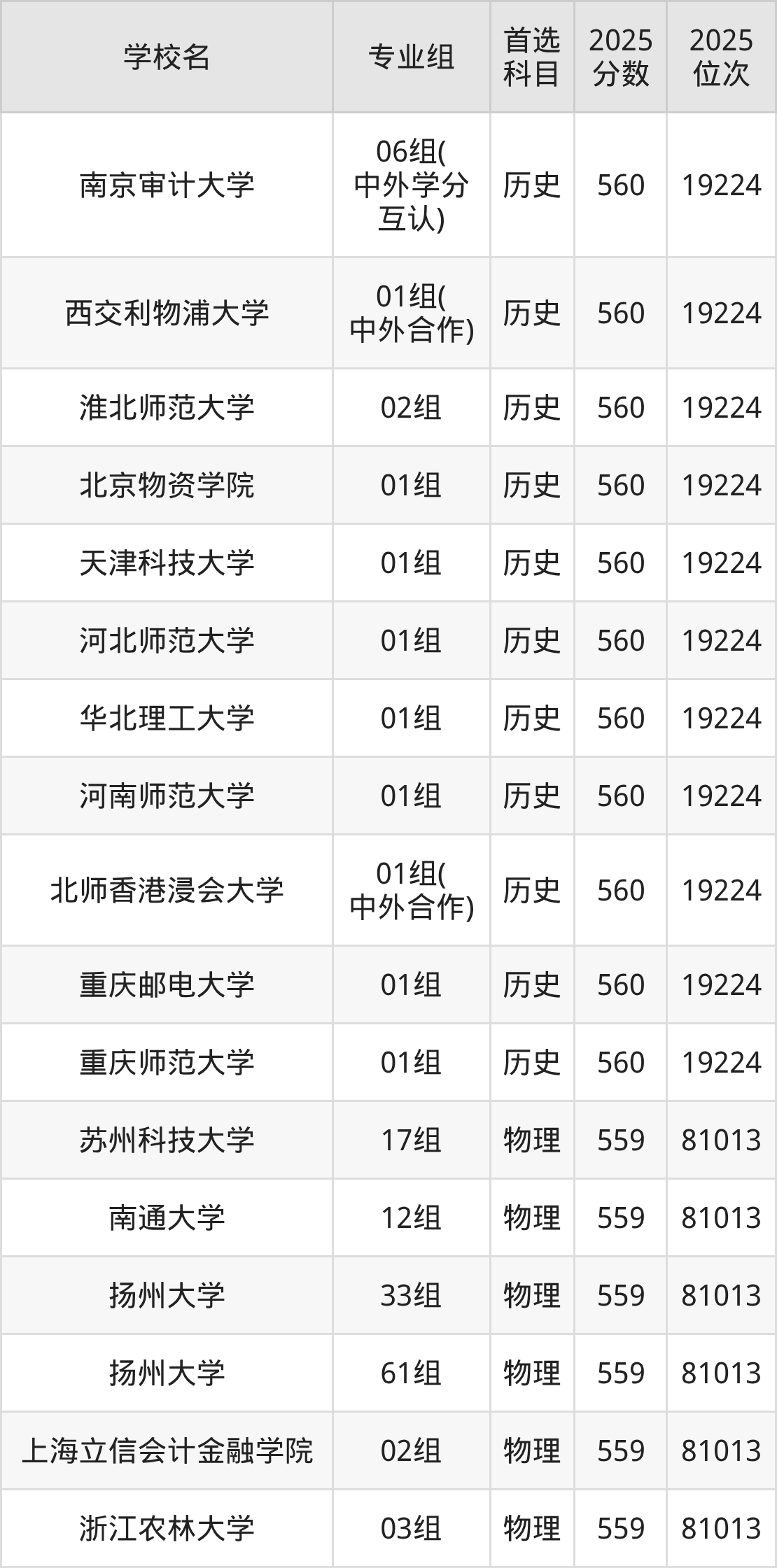 江苏高考物理类560分对应的位次排名是79711名,历史类560分对应的位次排名是19224名,因此建议2026年位次排在这附近的同学考虑这些大学。