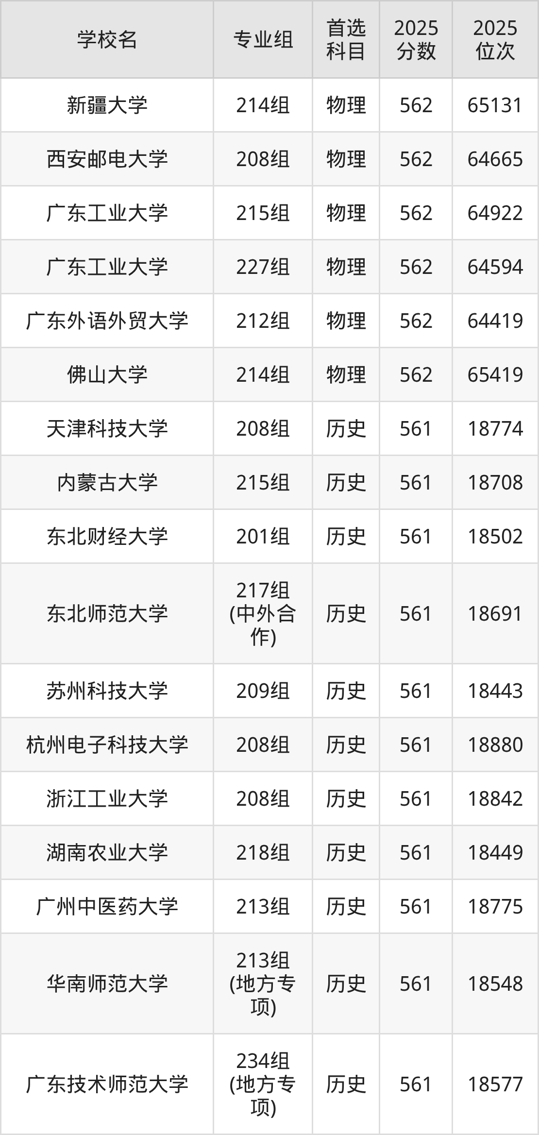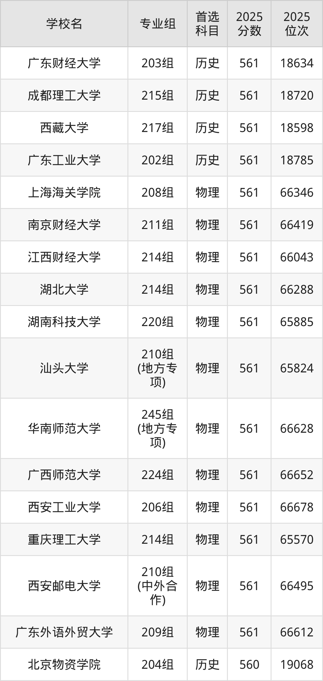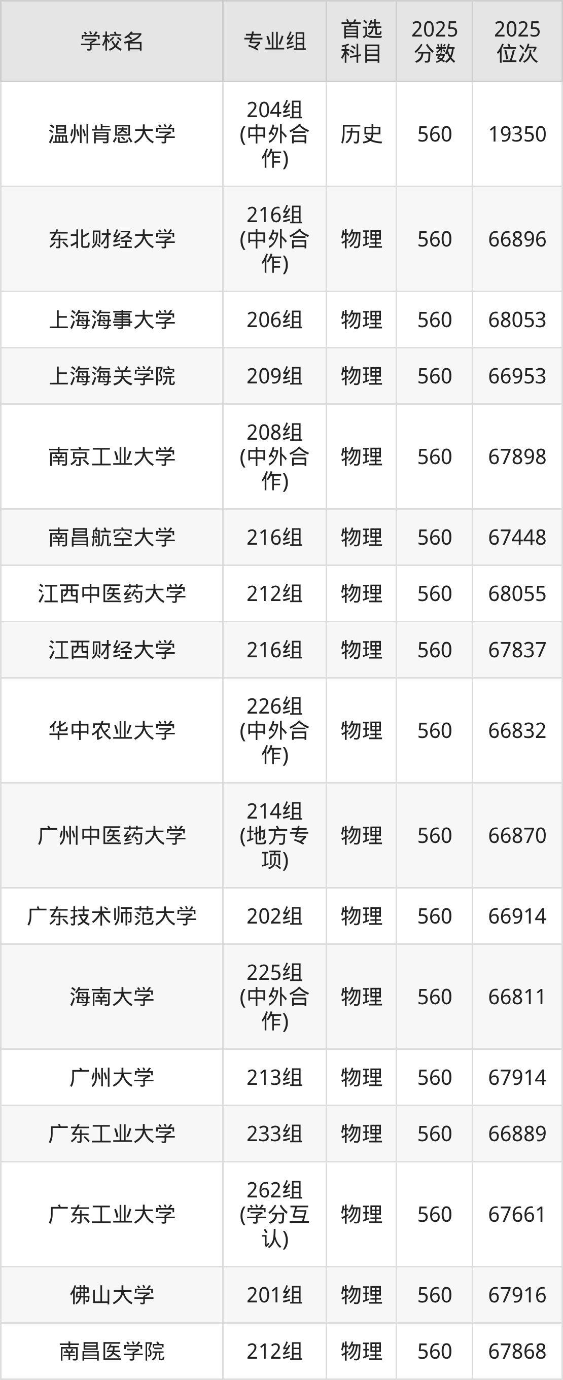 广东高考历史类560分对应的位次排名是18899名-19374名,物理类560分对应的位次排名是66811名-68055名,因此建议2026年位次排在这附近的同学考虑这些大学。