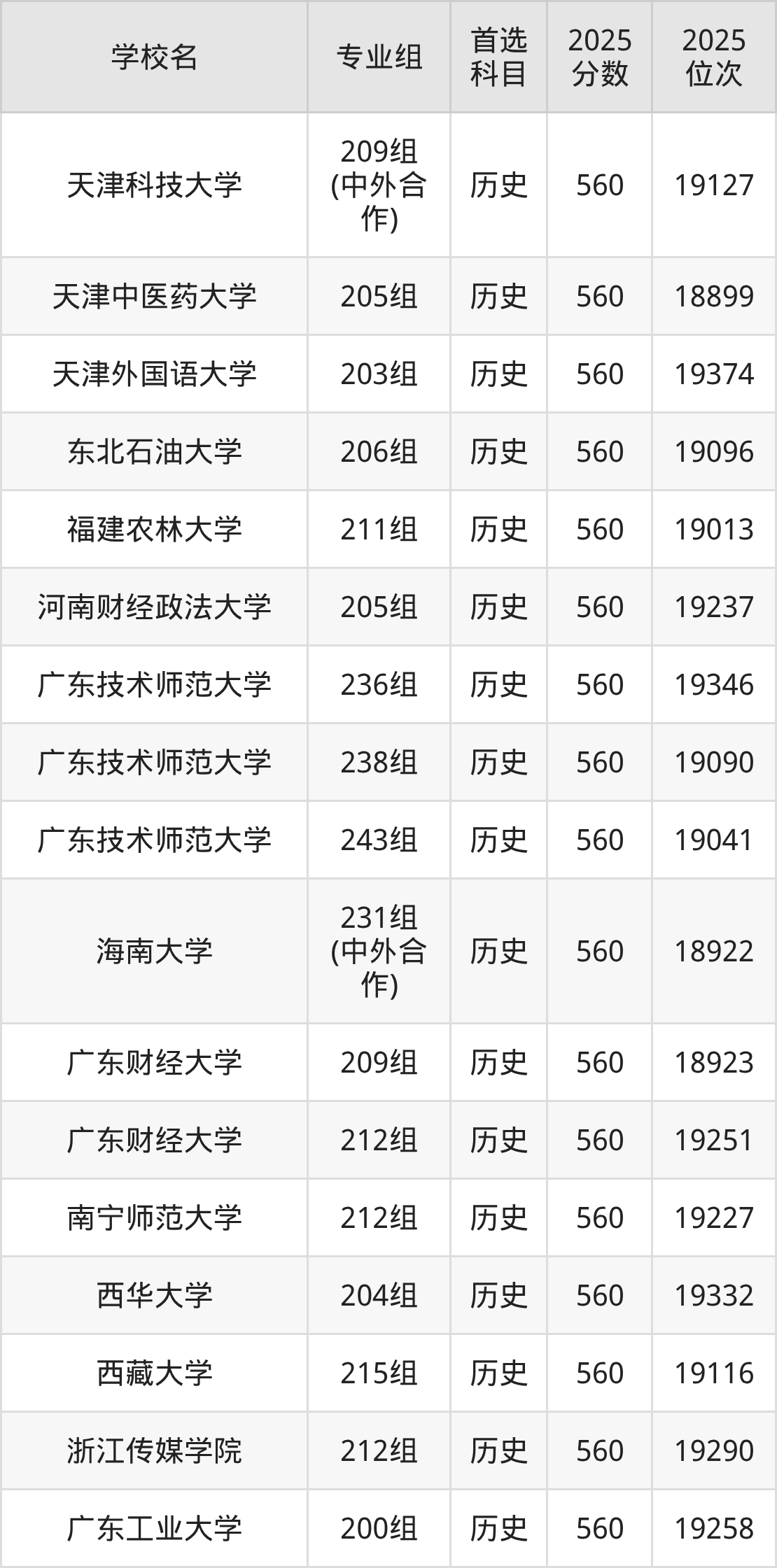 2025年在广东高考历史类录取分数线是560分的大学有北京物资学院、天津科技大学、天津中医药大学、天津外国语大学、东北石油大学、福建农林大学、河南财经政法大学、广东技术师范大学、海南大学、广东财经大学等。物理类录取分数线是560分的大学有东北财经大学、上海海事大学、上海海关学院、南京工业大学、南昌航空大学、江西中医药大学、江西财经大学、华中农业大学、广州中医药大学、广东技术师范大学等。