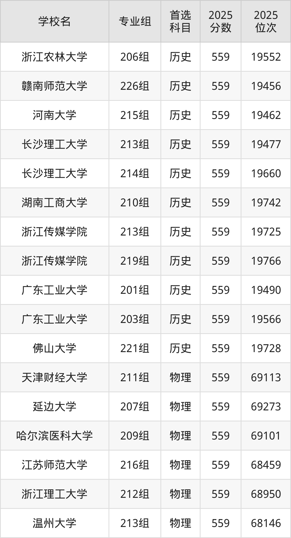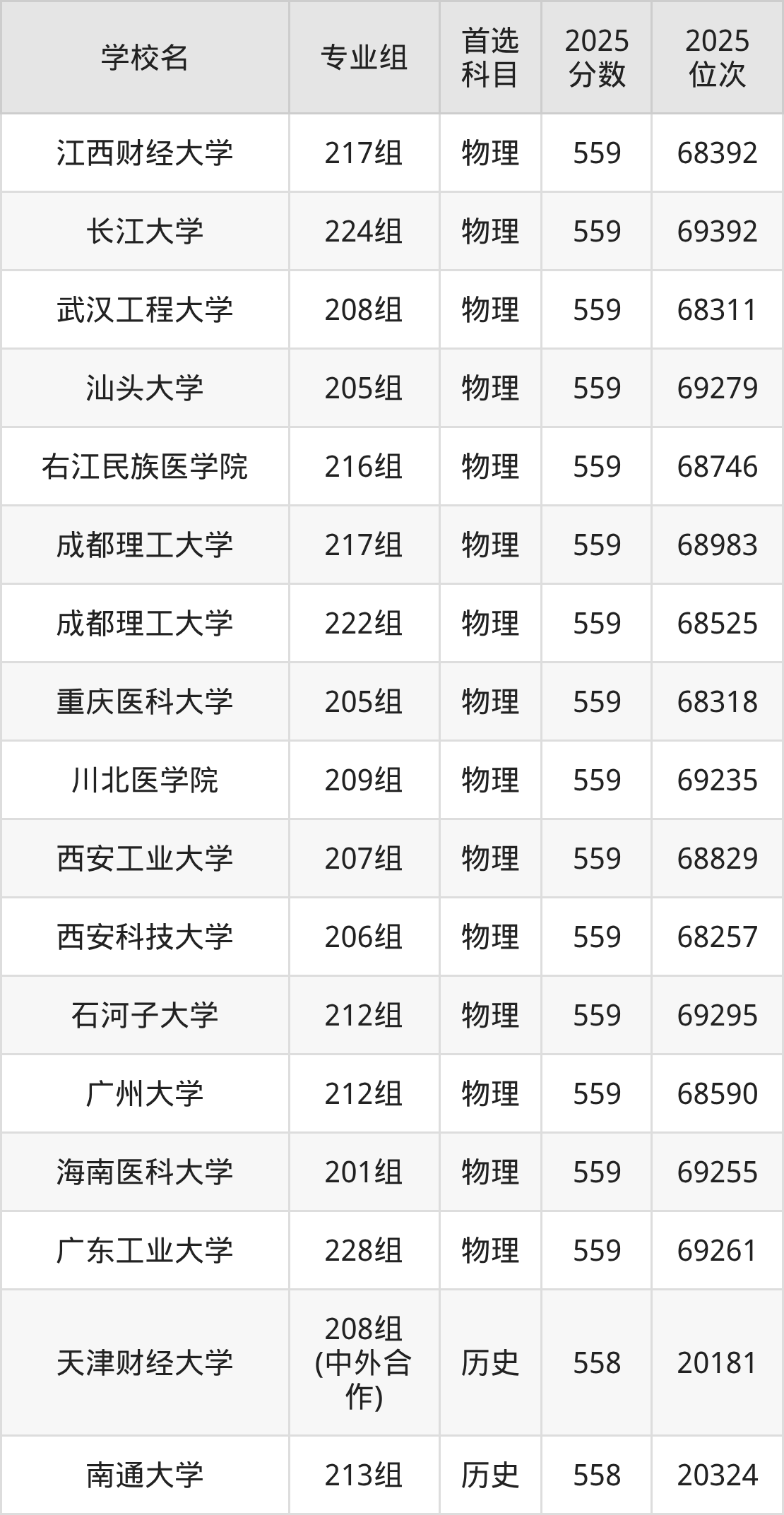 物理类560分可以冲的大学:天津工业大学562分、天津理工大学562分、辽宁大学562分、东北农业大学562分等;较稳妥的大学:天津财经大学559分、延边大学559分、哈尔滨医科大学559分、江苏师范大学559分等。