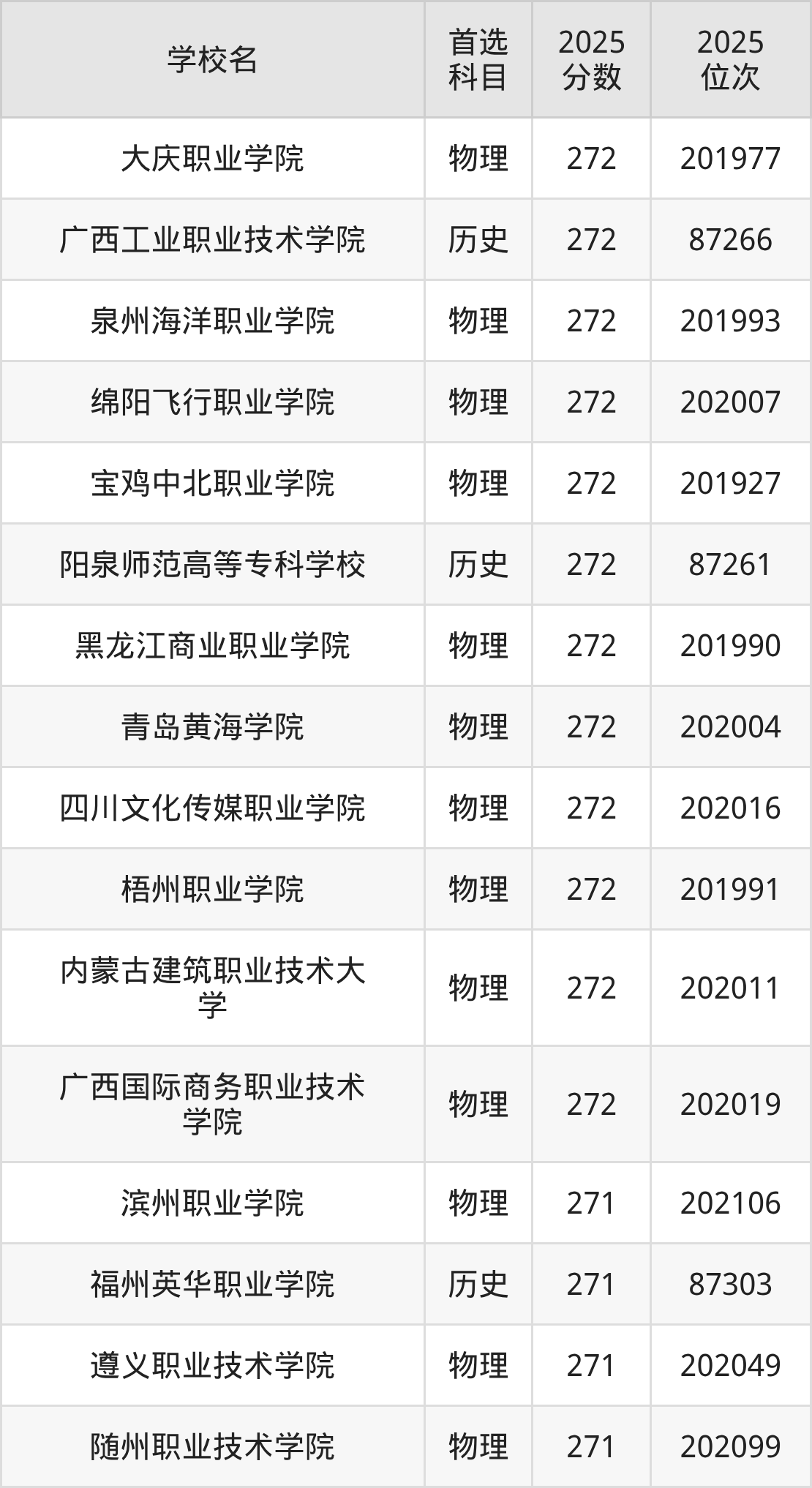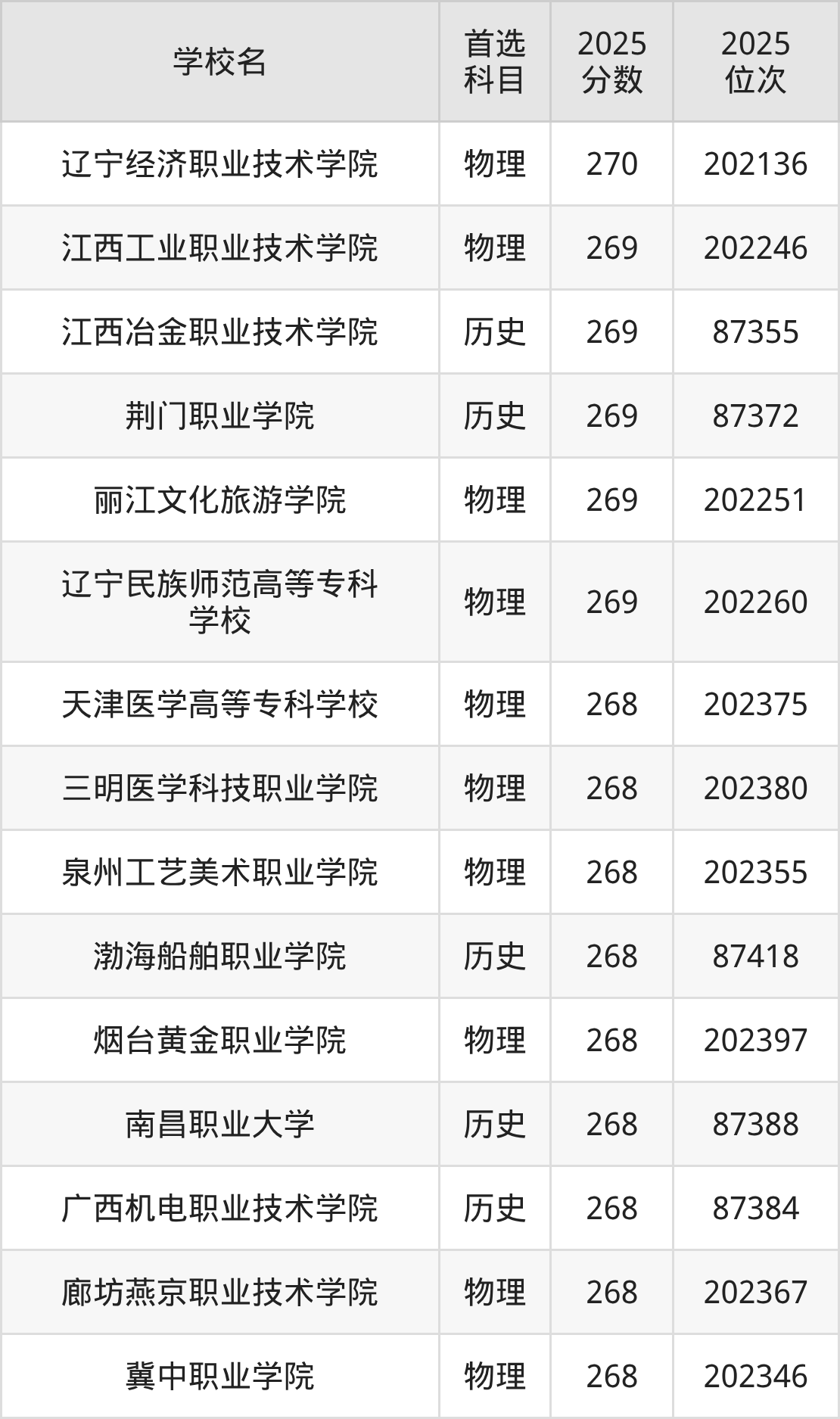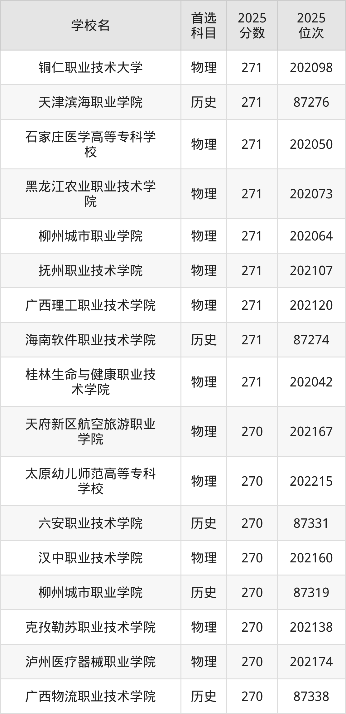 贵州高考物理类270分对应的位次排名是202136名-202215名,历史类270分对应的位次排名是87319名-87338名,因此建议2026年位次排在这附近的同学考虑这些大学。