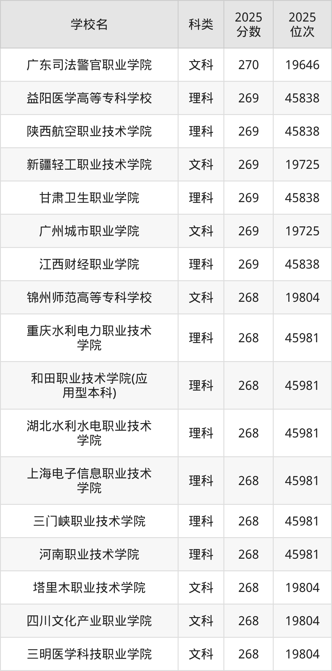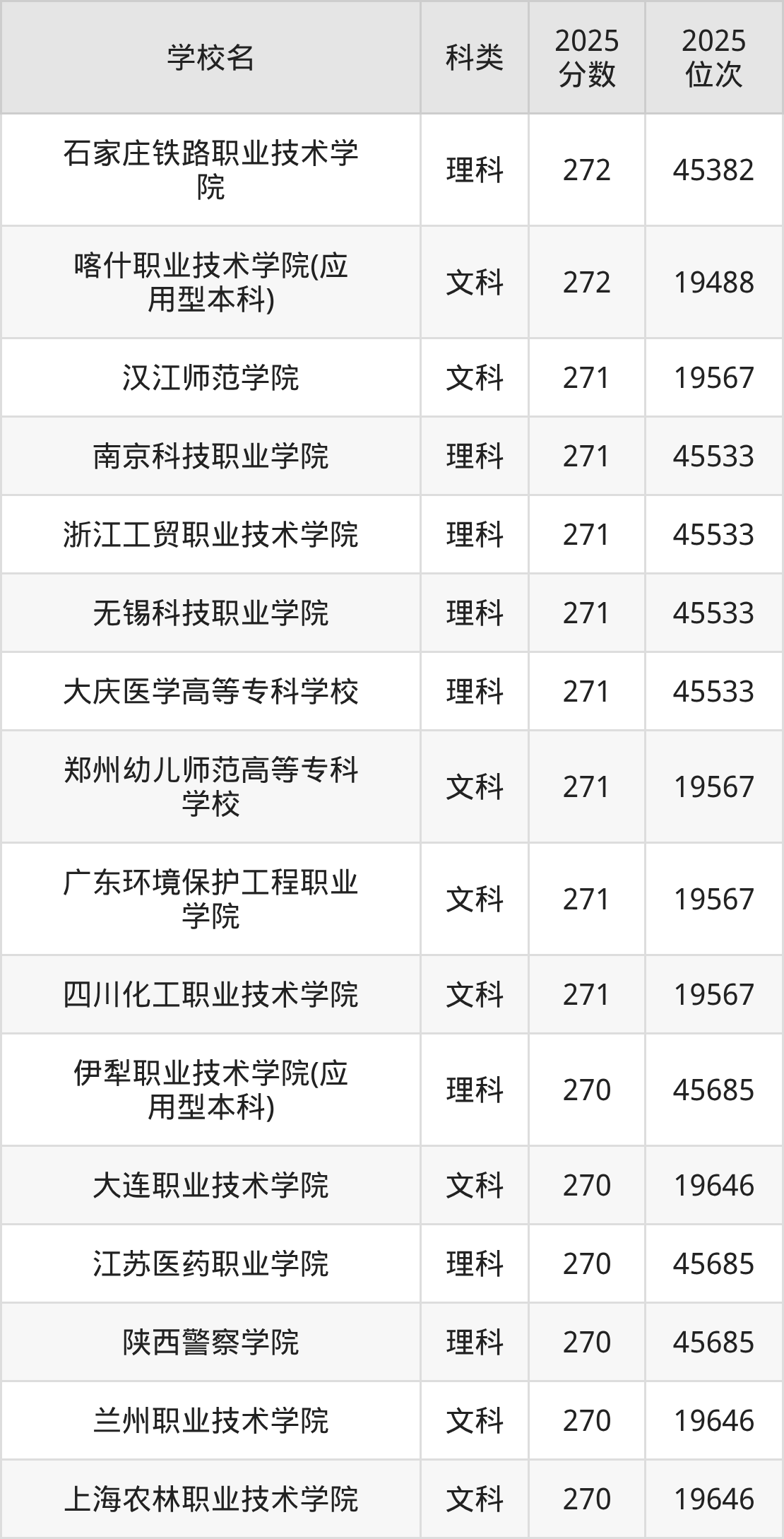 二、270分左右的专科大学排名