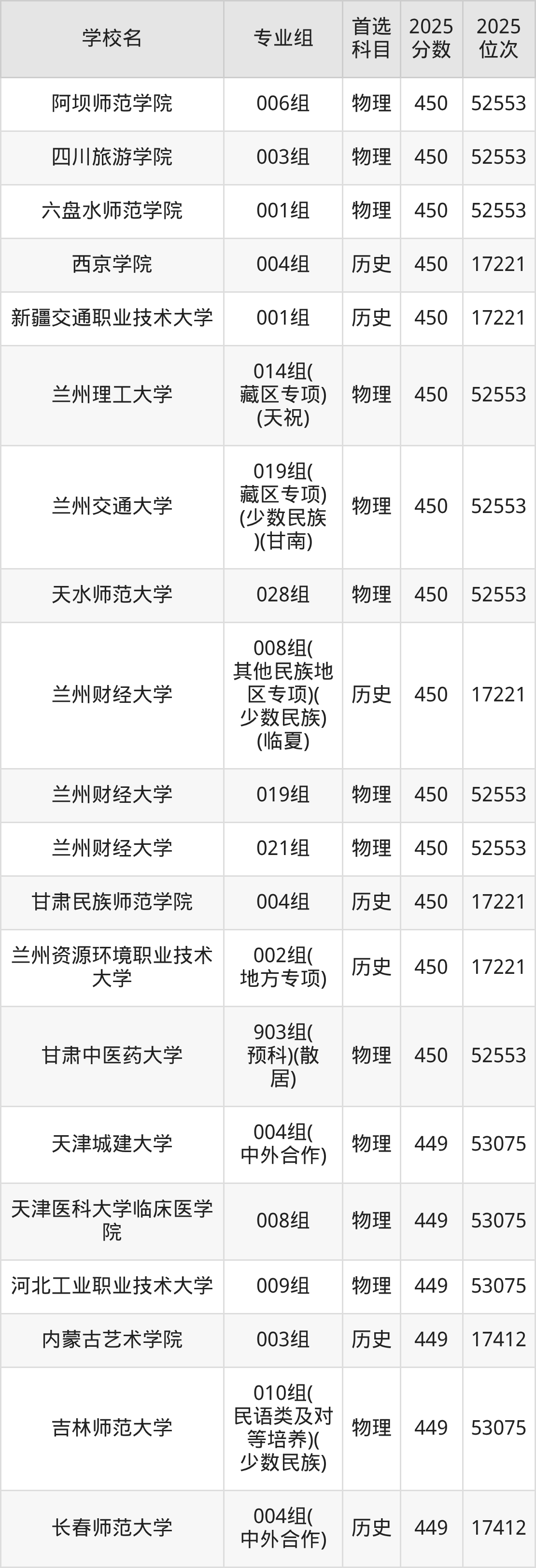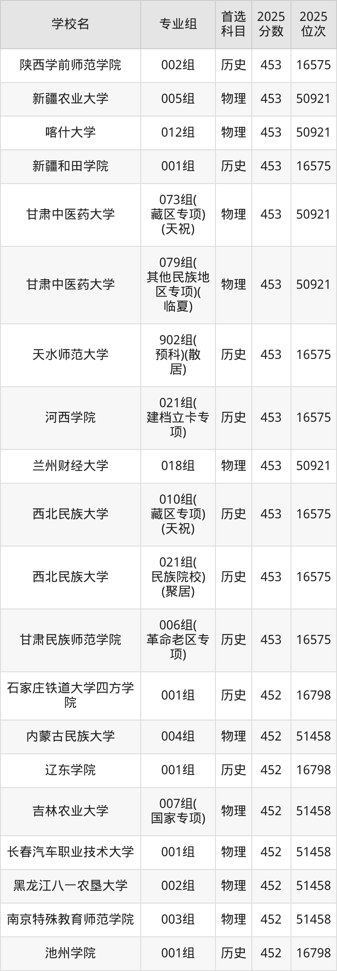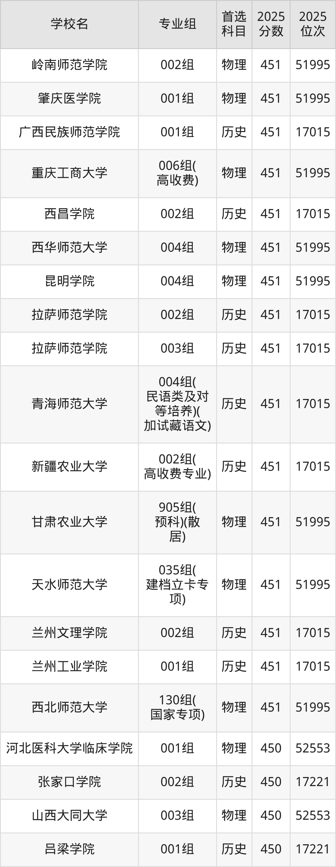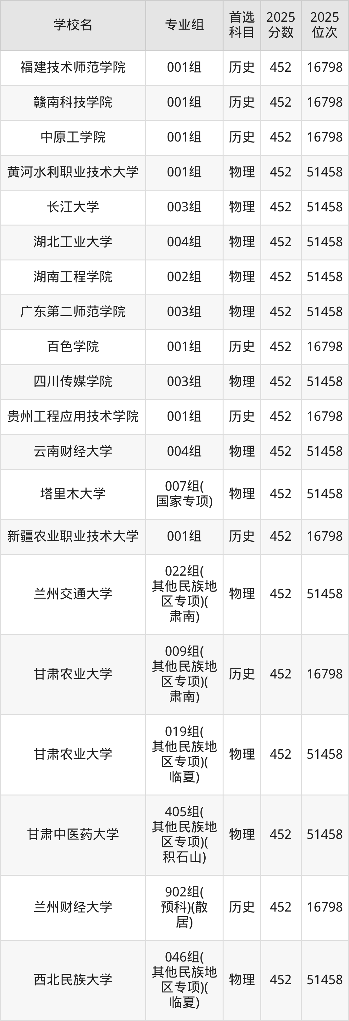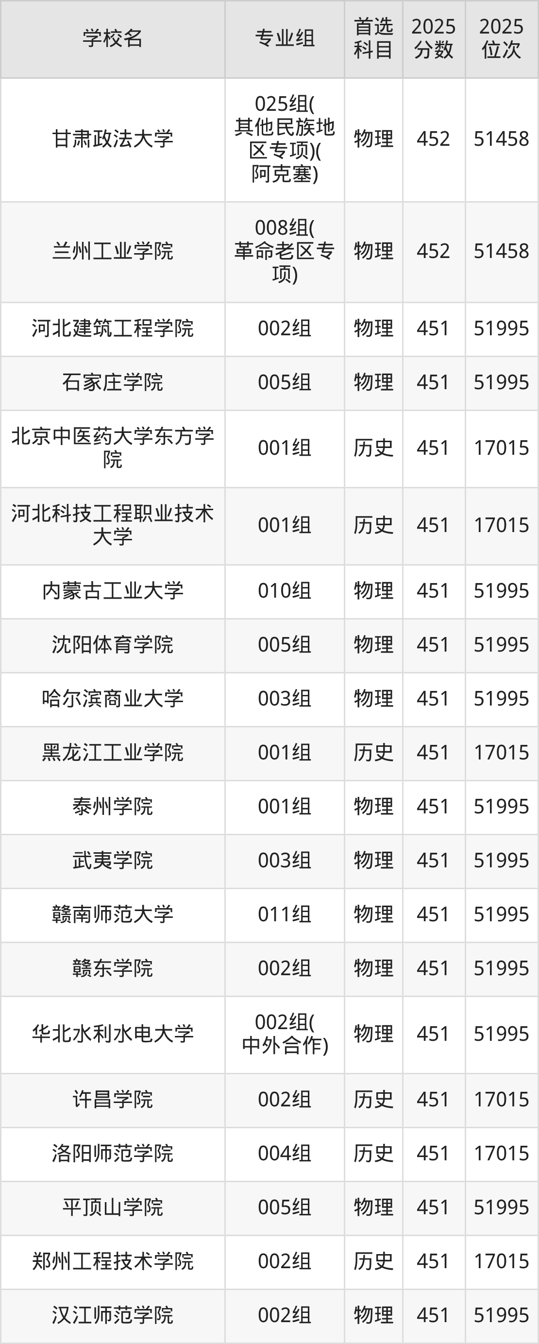 甘肃高考物理类451分对应的位次排名是51995名,历史类451分对应的位次排名是17015名,因此建议2026年位次排在这附近的同学考虑这些大学。