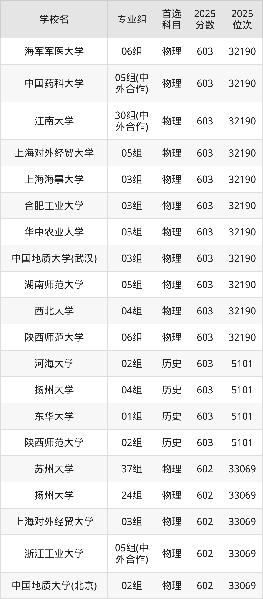 物理类601分可以冲的大学:海军军医大学603分、中国药科大学603分、江南大学603分、上海对外经贸大学603分等;较稳妥的大学:南京工程学院600分、苏州大学600分、上海理工大学600分、福州大学600分等。