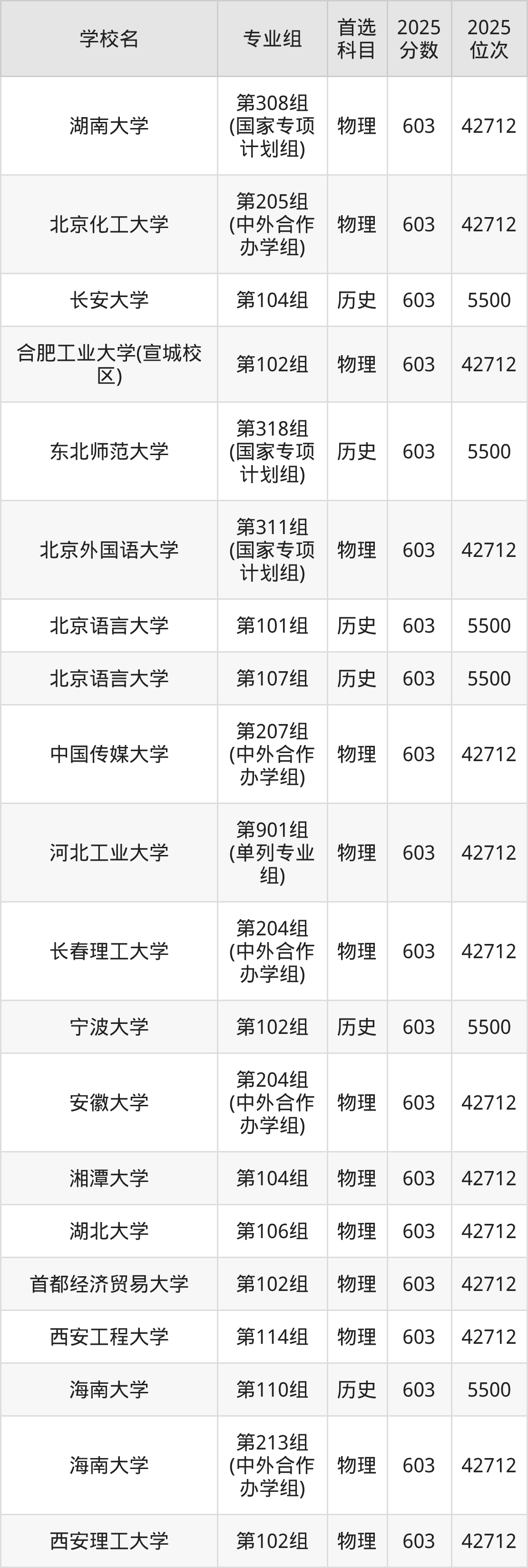 物理类601分可以冲的大学:湖南大学603分、北京化工大学603分、合肥工业大学(宣城校区)603分、北京外国语大学603分等;较稳妥的大学:东华大学600分、合肥工业大学(宣城校区)600分、大连海事大学600分、中国矿业大学(北京)600分等。