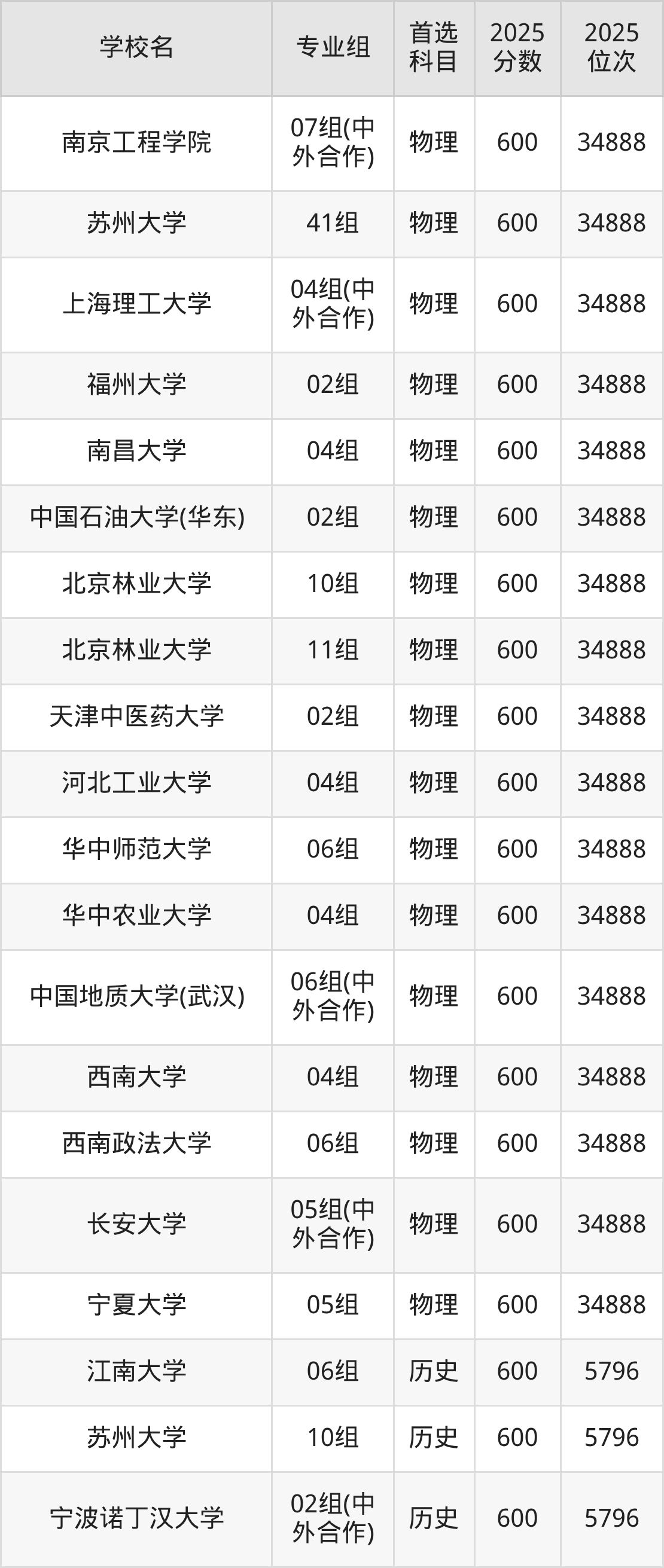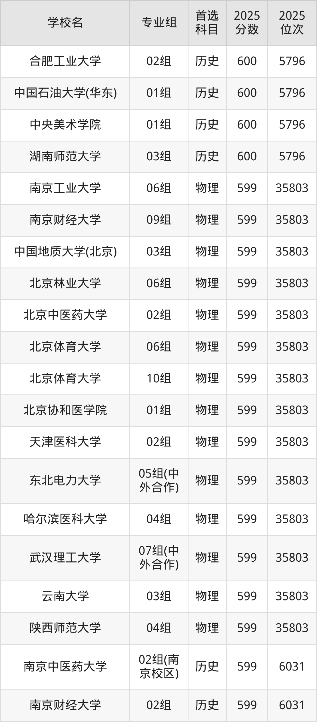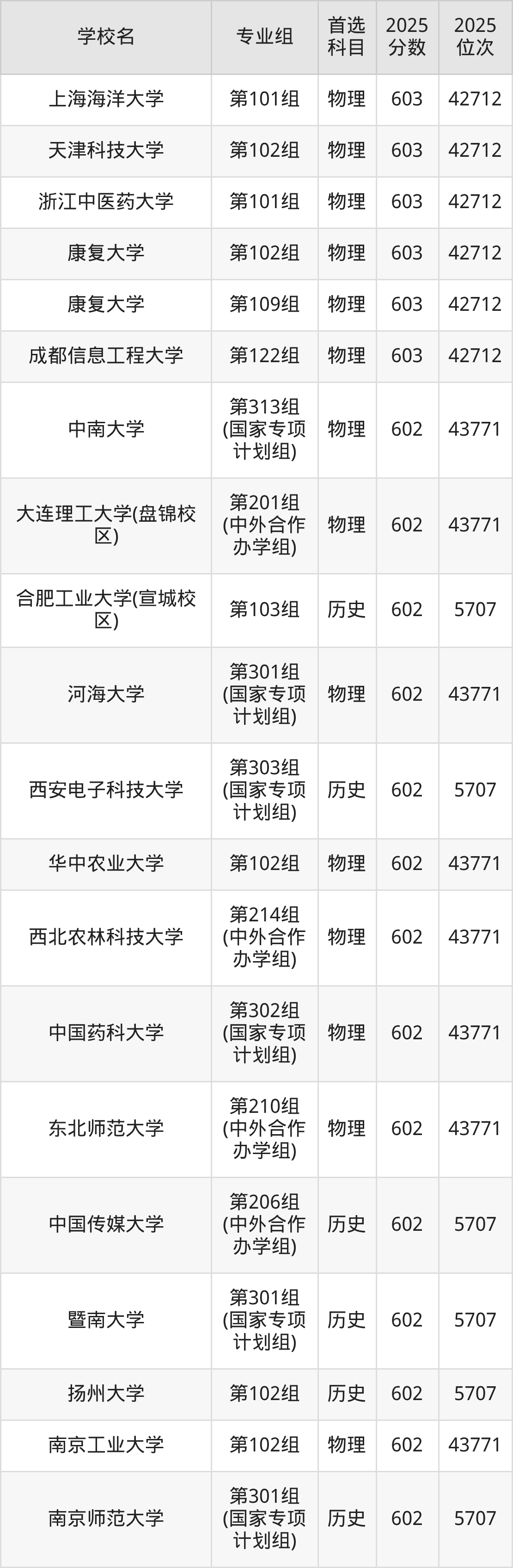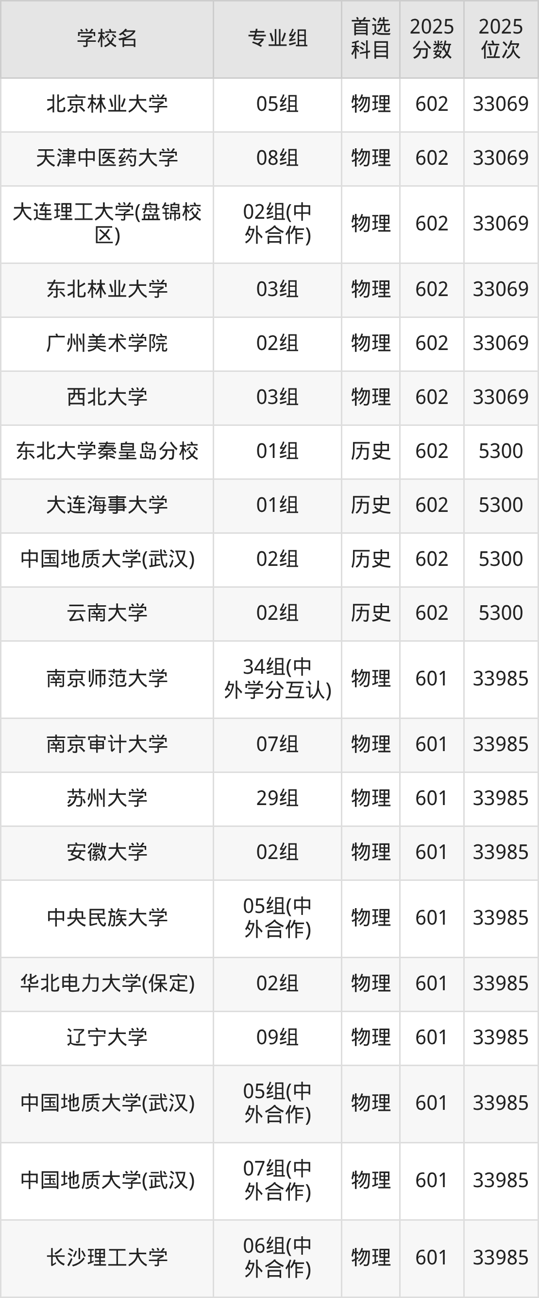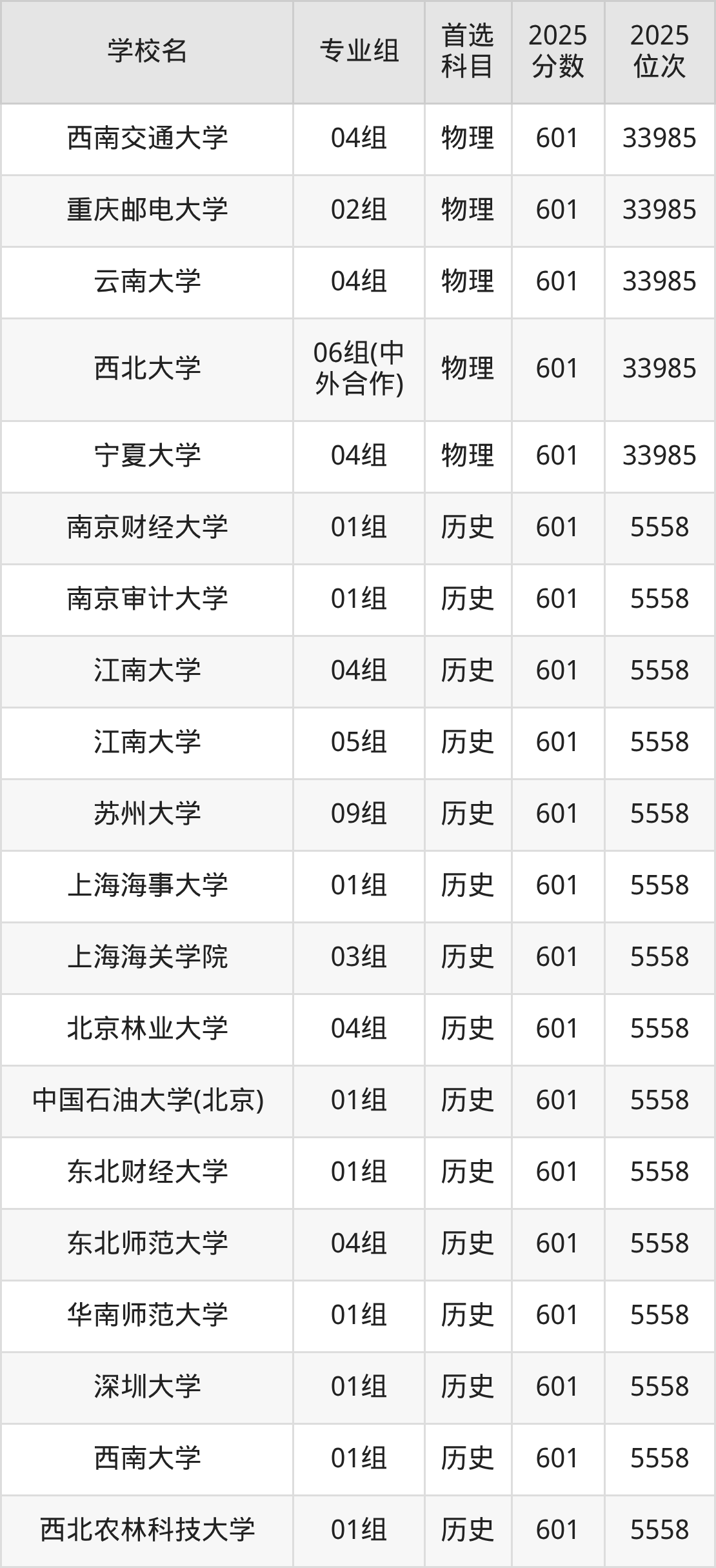江苏高考历史类601分对应的位次排名是5558名,物理类601分对应的位次排名是33985名,因此建议2026年位次排在这附近的同学考虑这些大学。