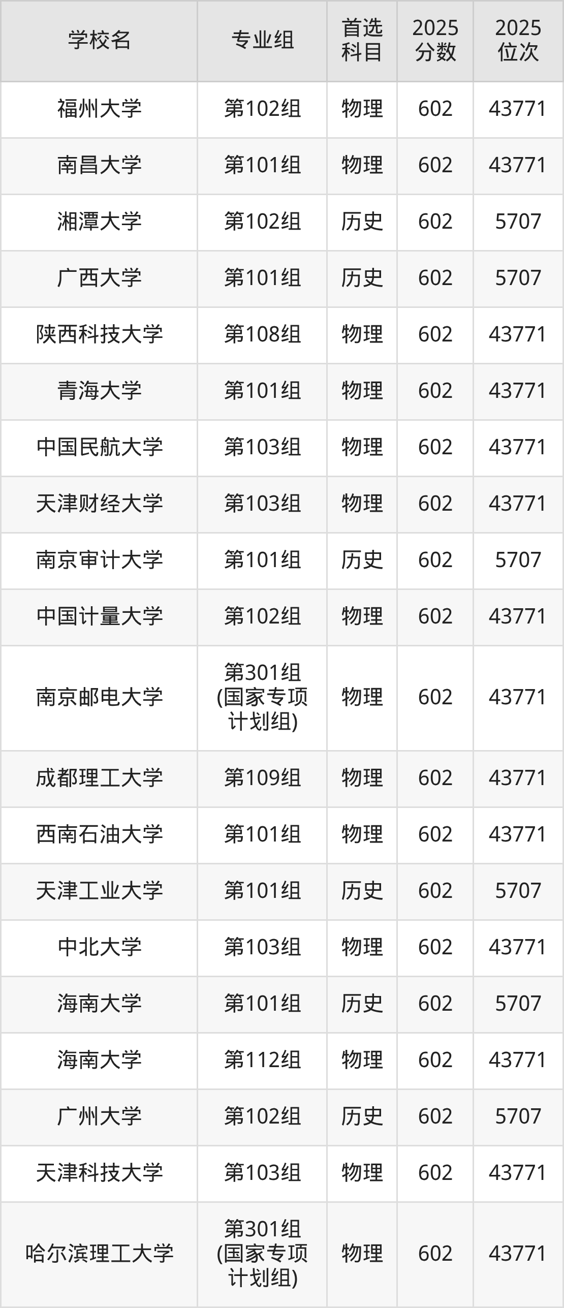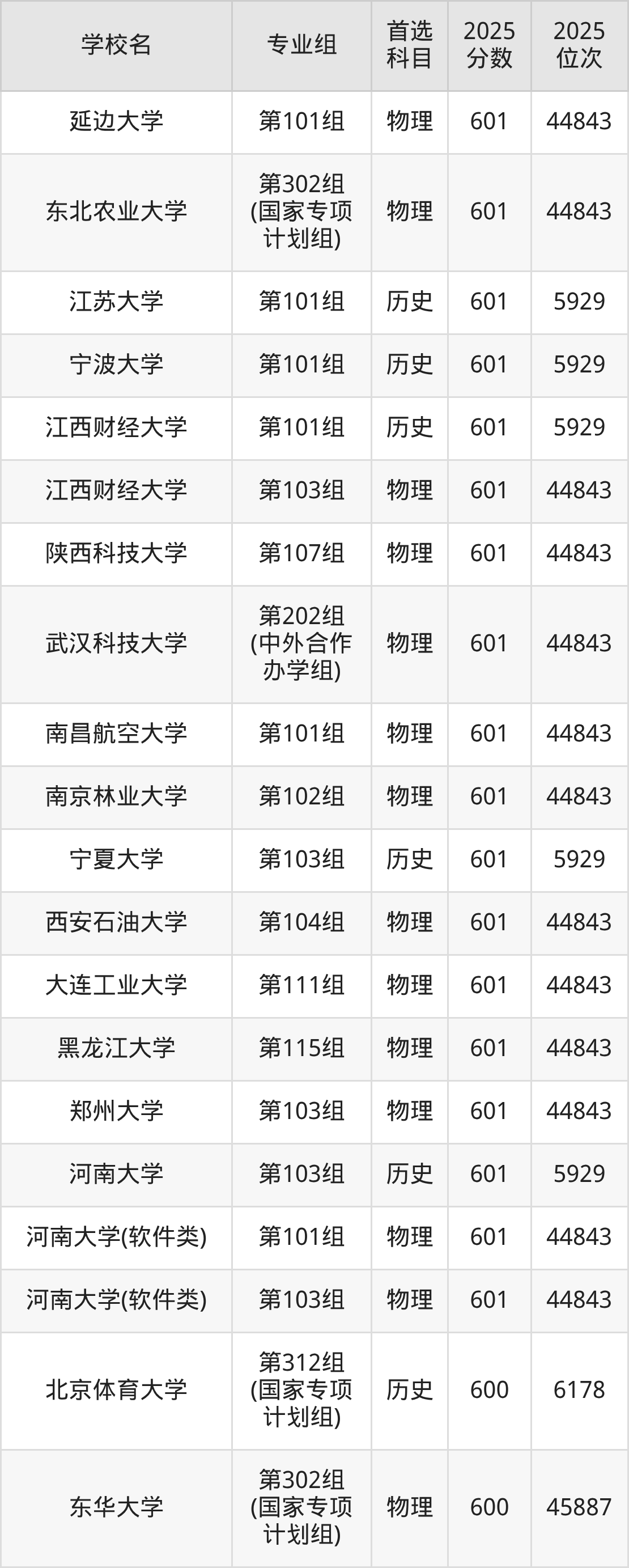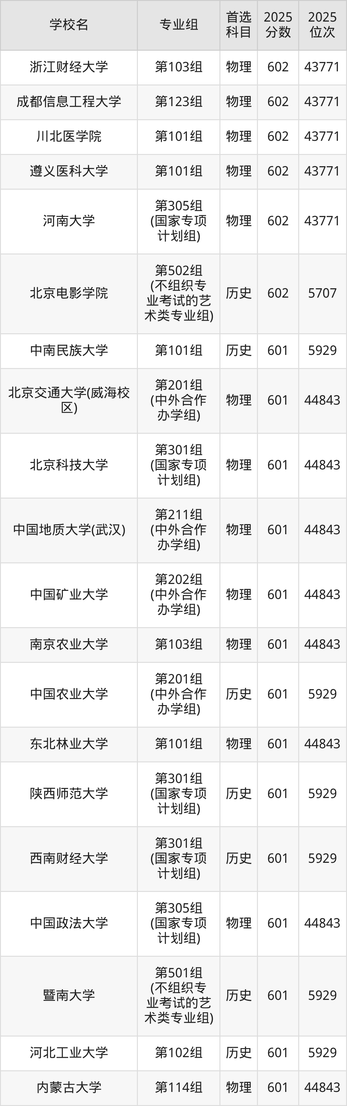 河南高考历史类601分对应的位次排名是5929名,物理类601分对应的位次排名是44843名,因此建议2026年位次排在这附近的同学考虑这些大学。