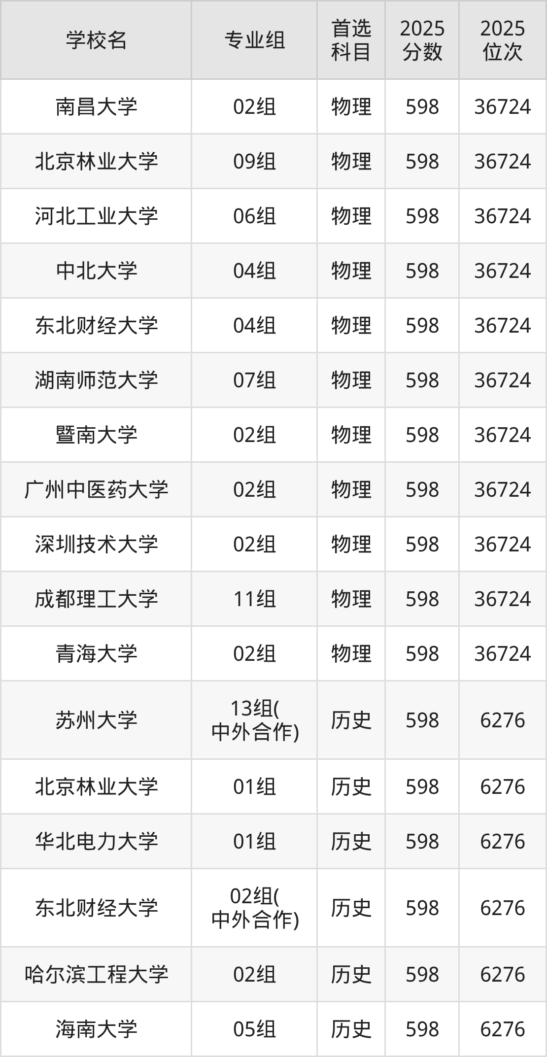 江苏高考物理类599分对应的位次排名是35803名,历史类599分对应的位次排名是6031名,因此建议2026年位次排在这附近的同学考虑这些大学。