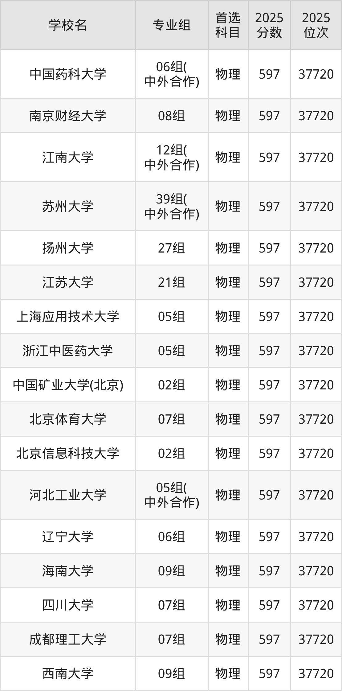 2025年在江苏高考物理类录取分数线是599分的大学有南京工业大学、南京财经大学、中国地质大学(北京)、北京林业大学、北京中医药大学、北京体育大学、北京协和医学院、天津医科大学、东北电力大学、哈尔滨医科大学等。历史类录取分数线是599分的大学有南京中医药大学、南京财经大学、江南大学、浙江工业大学、安徽中医药大学、北京林业大学、湖南师范大学、暨南大学、陕西师范大学。