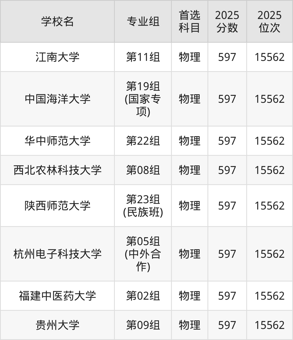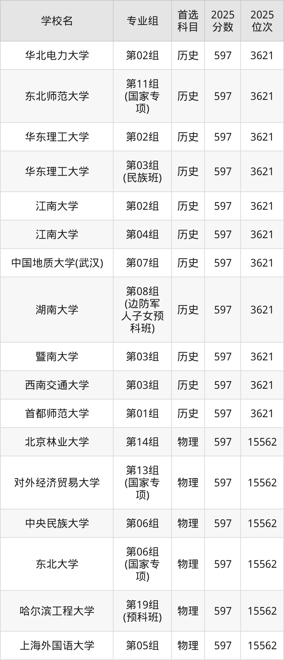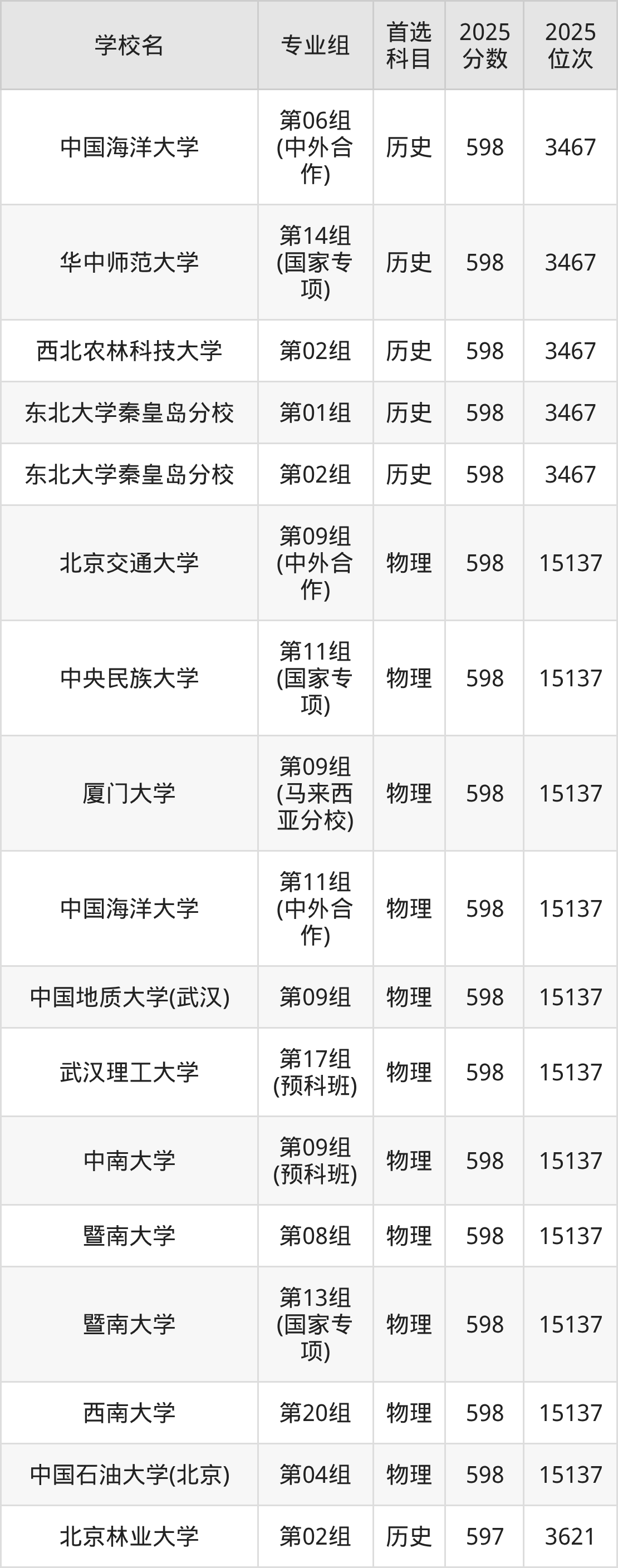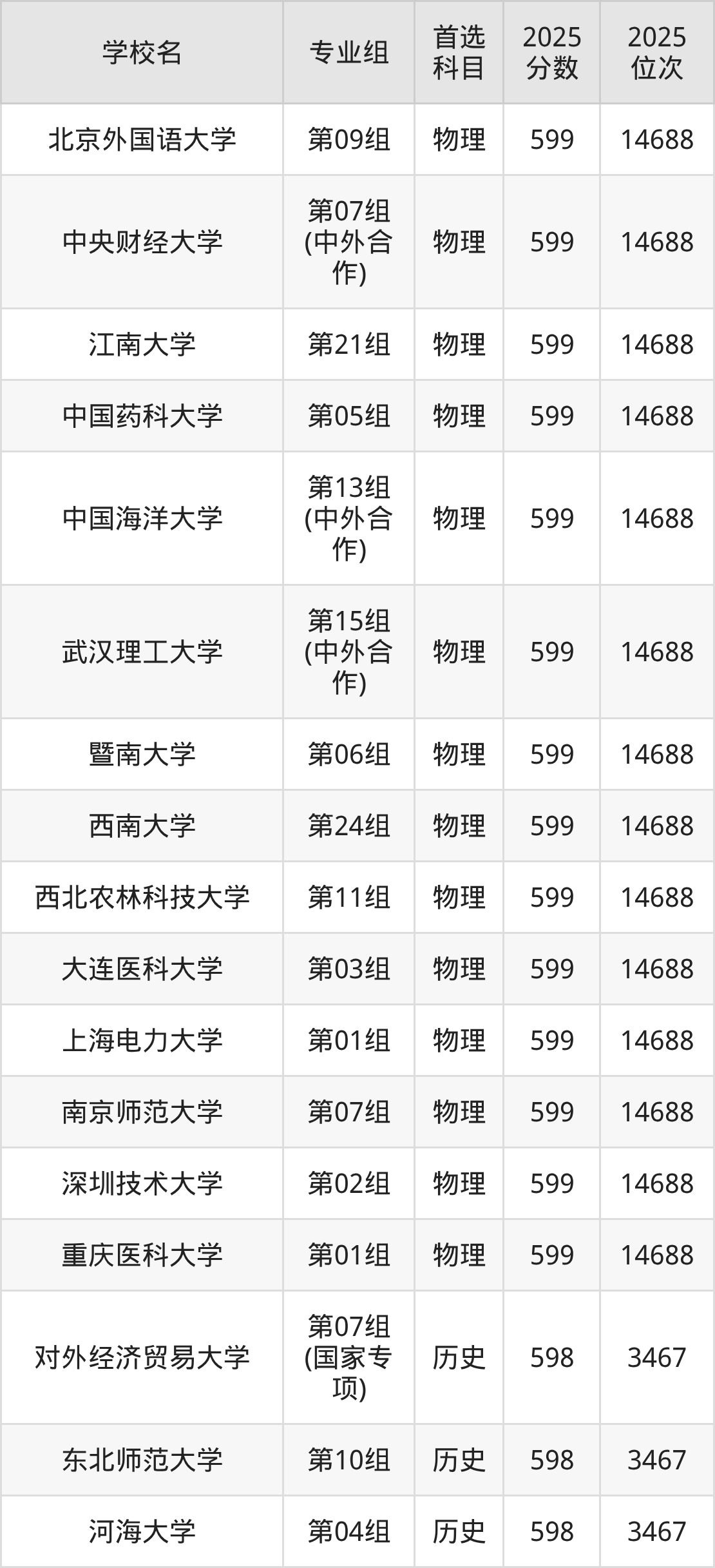 2025年在湖北高考历史类录取分数线是599分的大学有中国农业大学、北京林业大学、东华大学、南京航空航天大学、武汉理工大学、华中师范大学、中南财经政法大学、暨南大学、陕西师范大学、兰州大学等。物理类录取分数线是599分的大学有北京林业大学、北京外国语大学、中央财经大学、江南大学、中国药科大学、中国海洋大学、武汉理工大学、暨南大学、西南大学、西北农林科技大学等。