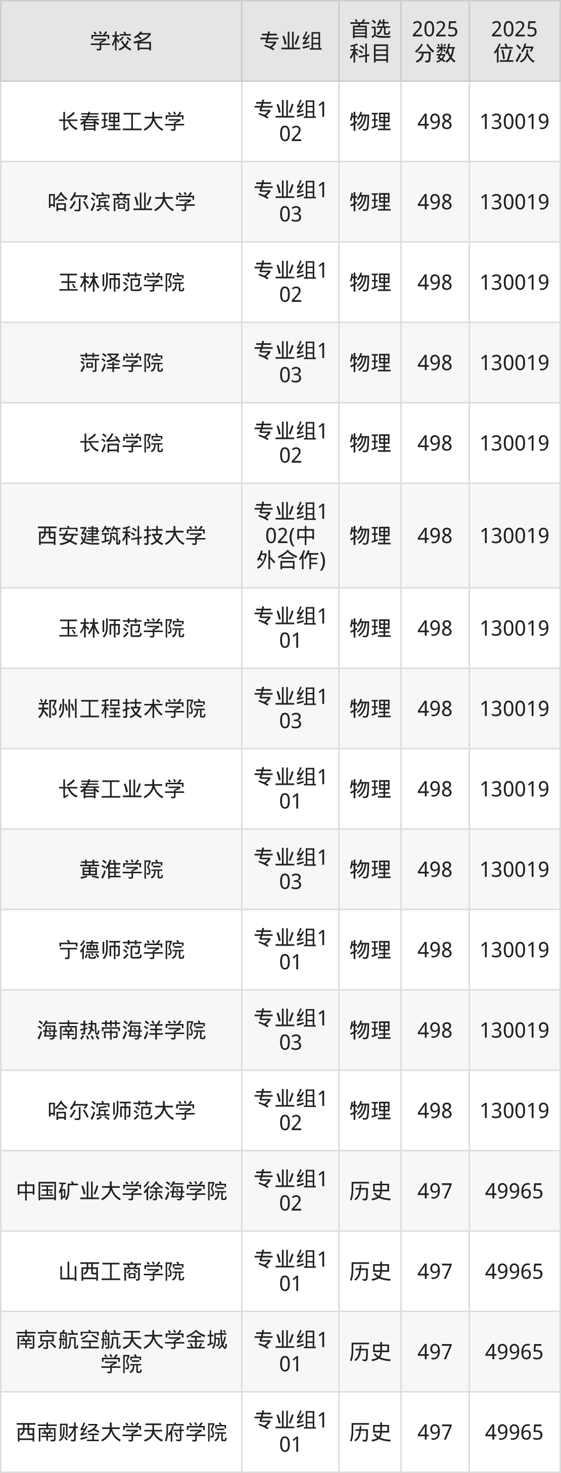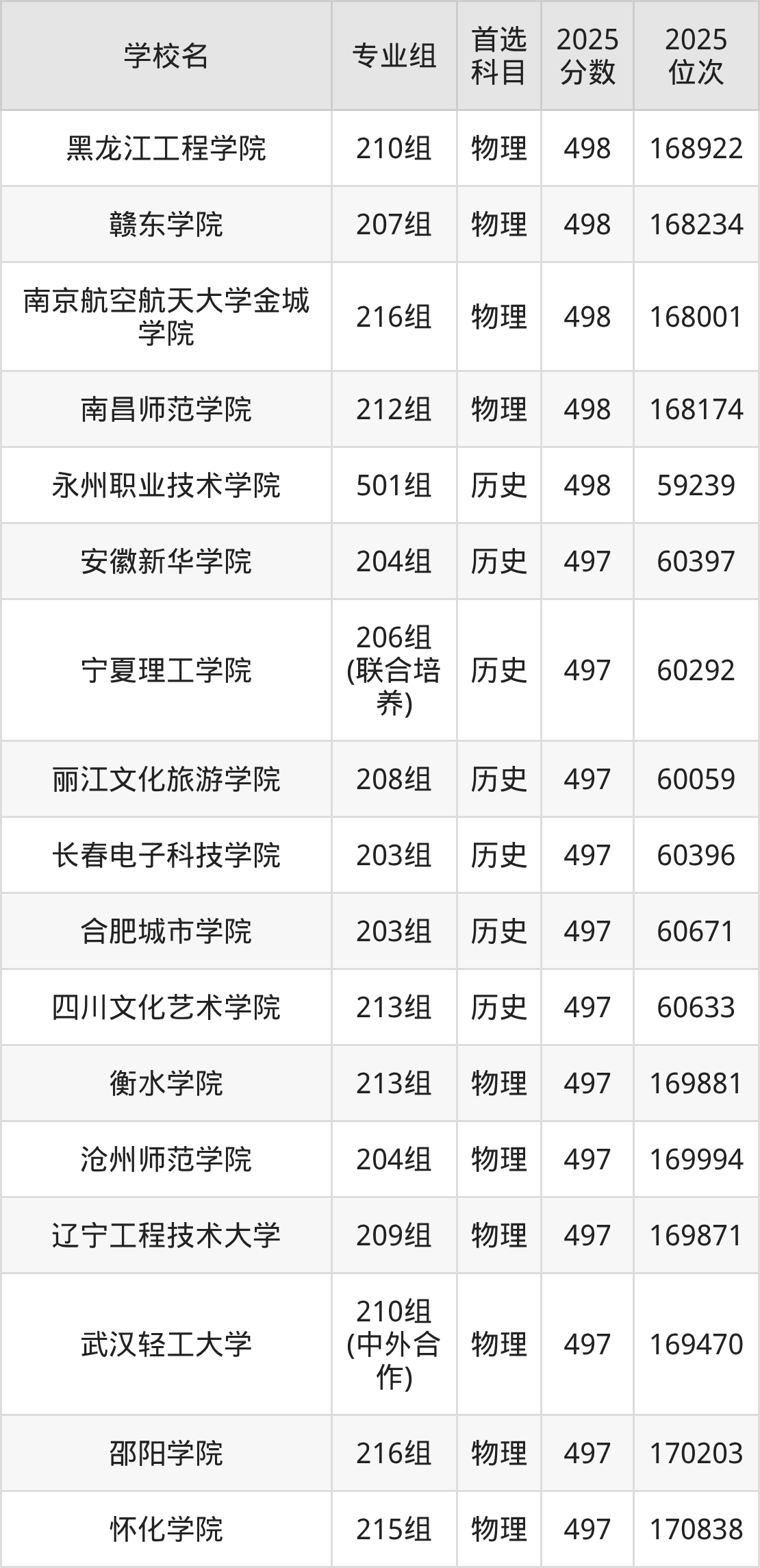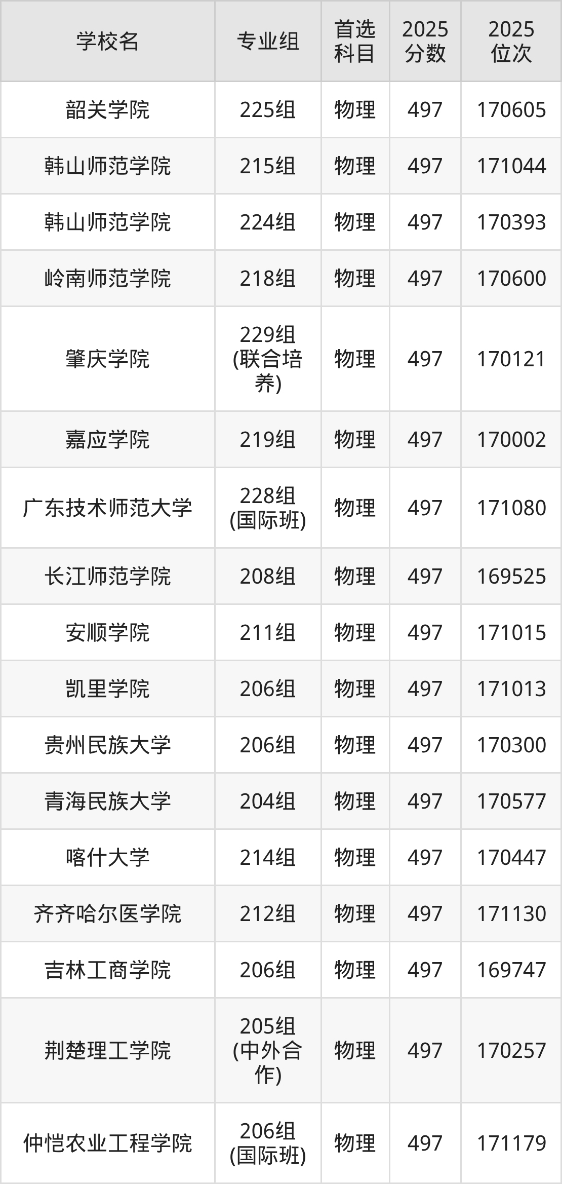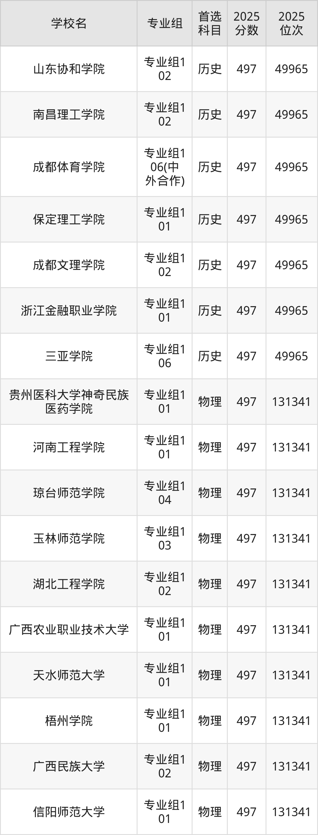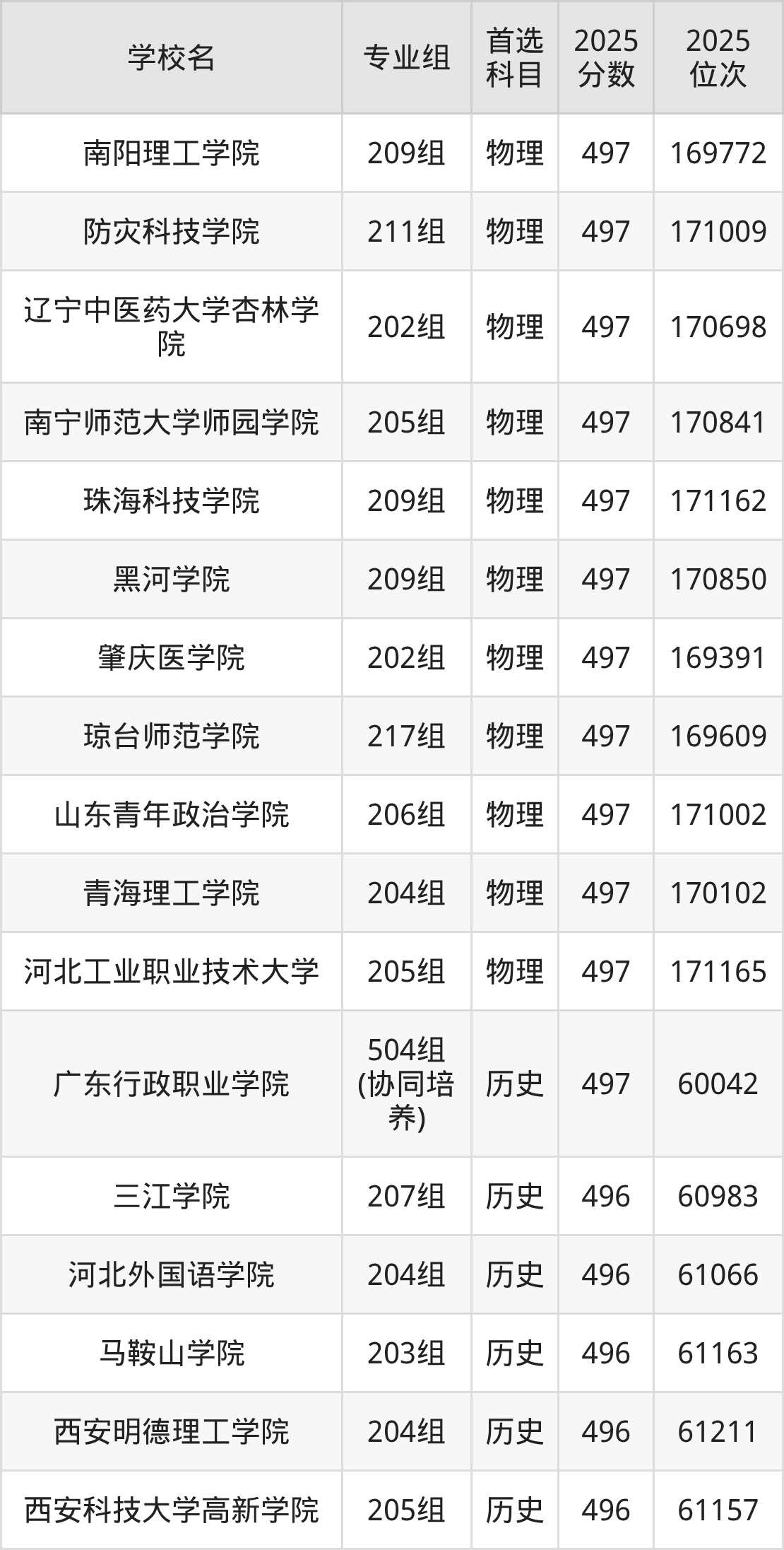 2025年在广东高考历史类录取分数线是497分的大学有安徽新华学院、宁夏理工学院、丽江文化旅游学院、长春电子科技学院、合肥城市学院、四川文化艺术学院、广东行政职业学院。物理类录取分数线是497分的大学有衡水学院、沧州师范学院、辽宁工程技术大学、武汉轻工大学、邵阳学院、怀化学院、韶关学院、韩山师范学院、岭南师范学院、肇庆学院等。