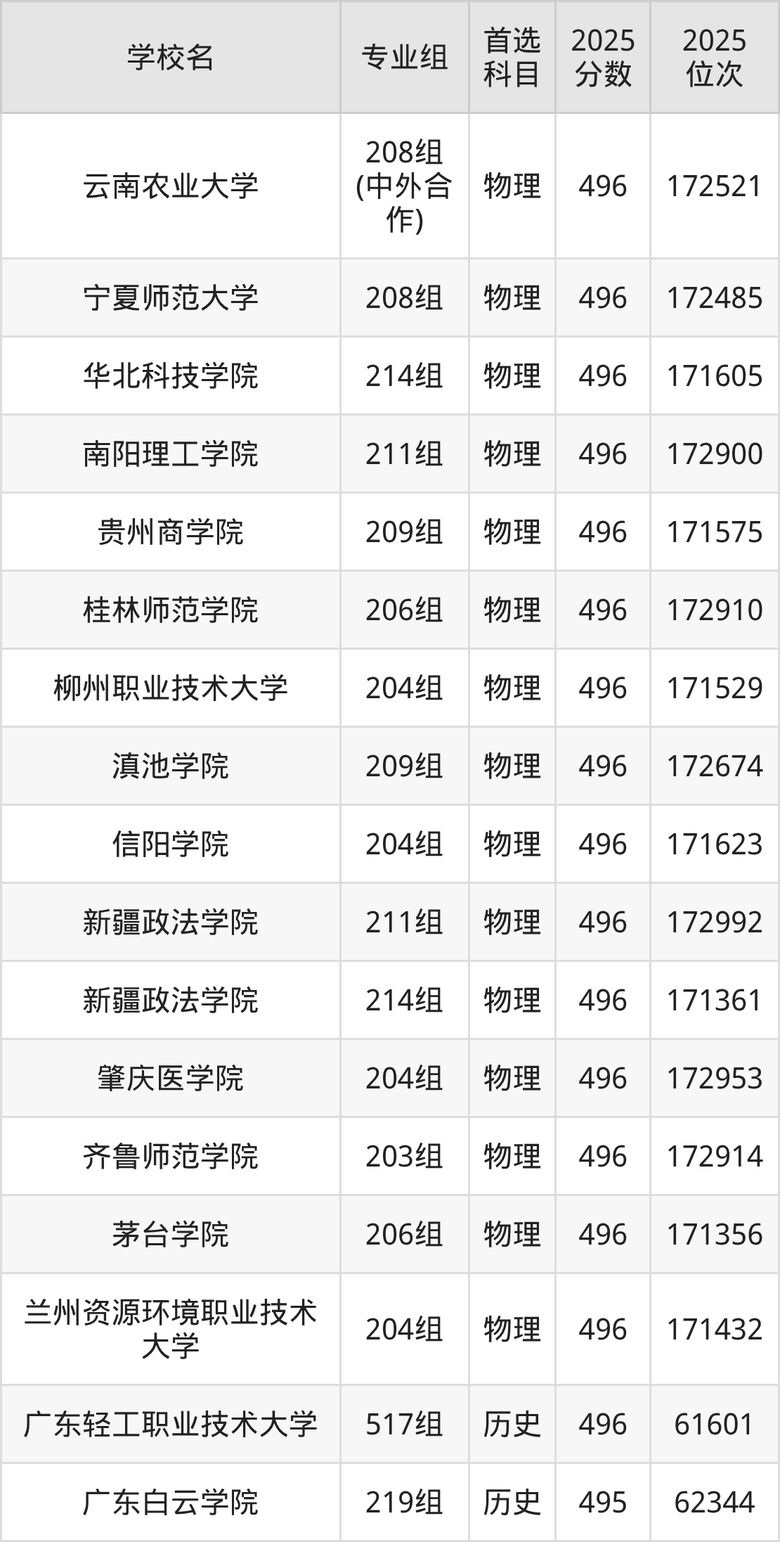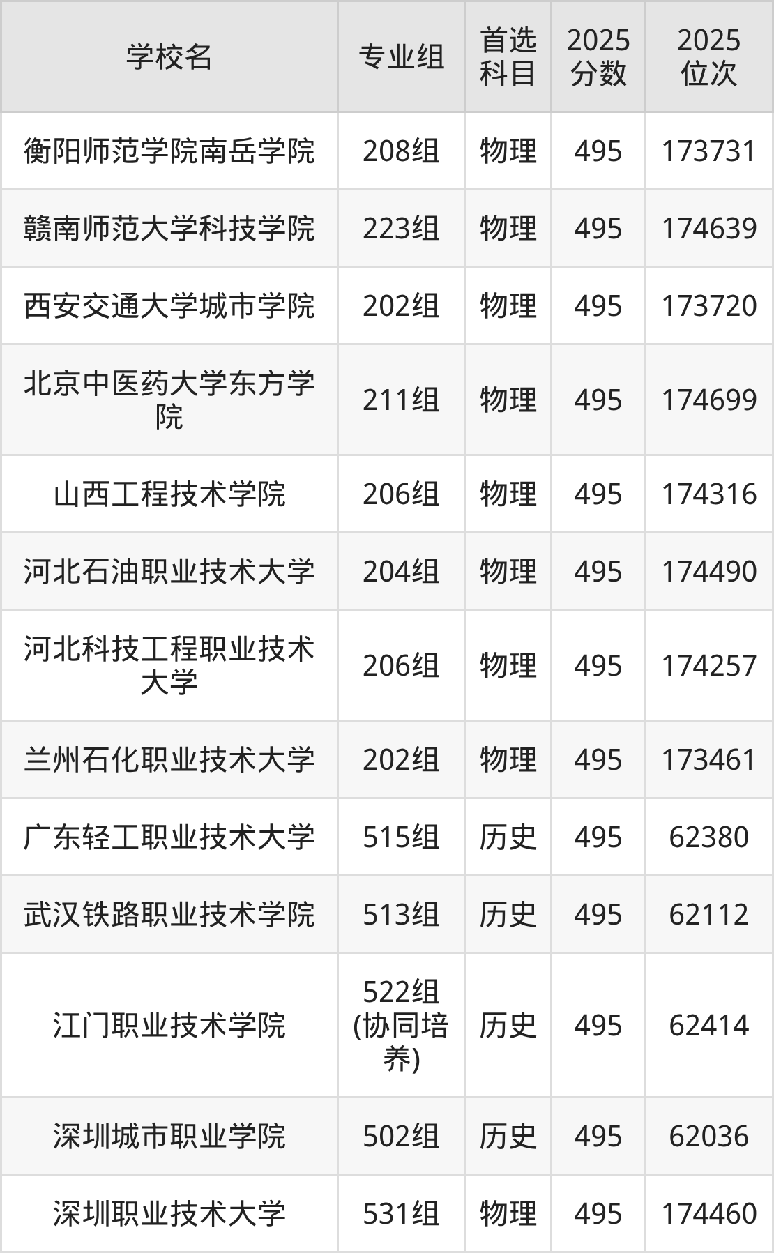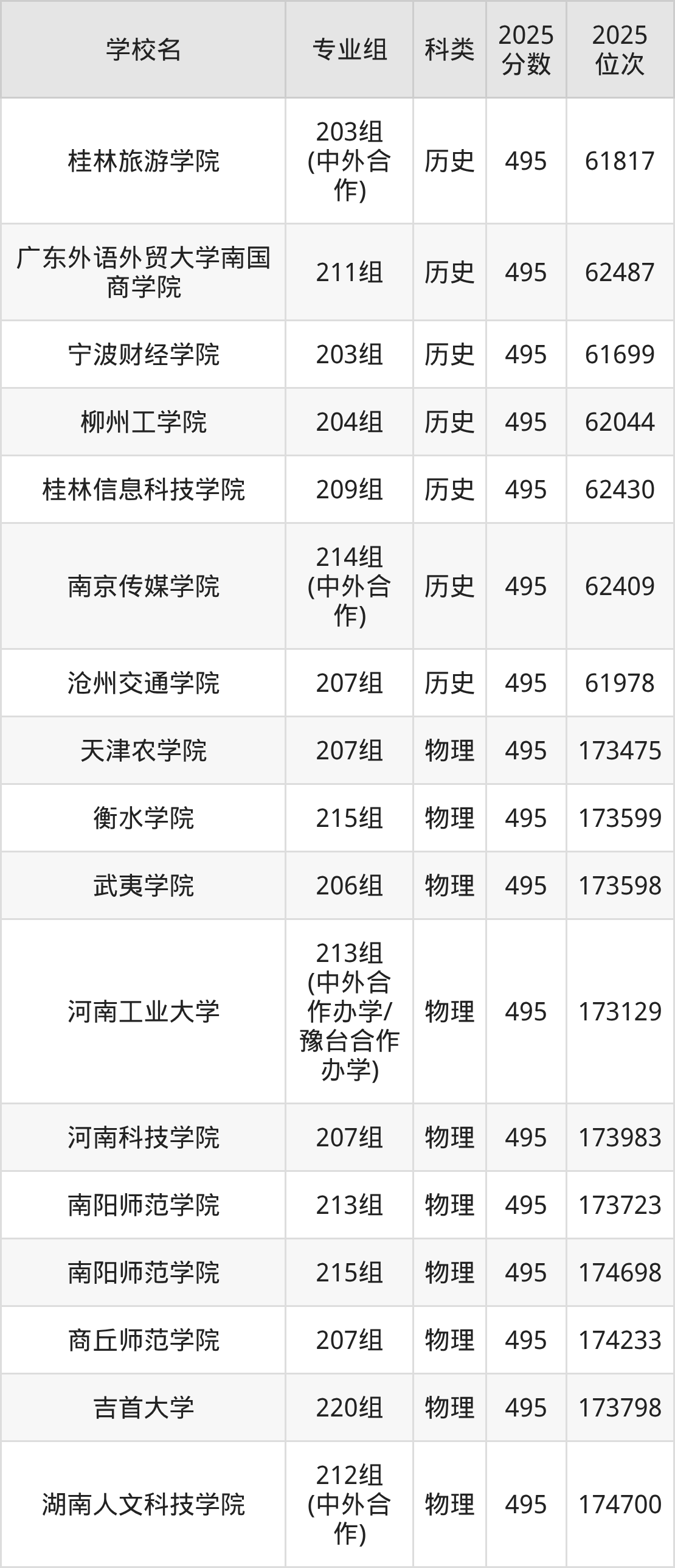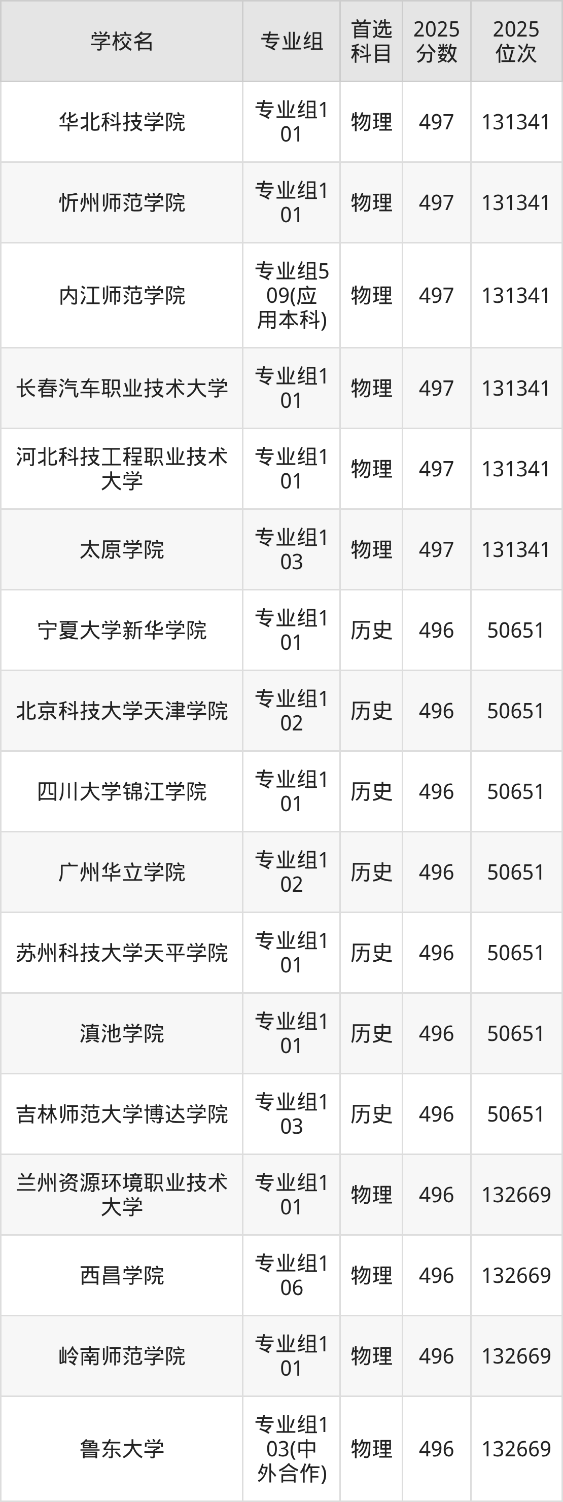 2025年在广东高考历史类录取分数线是497分的大学有安徽新华学院、宁夏理工学院、丽江文化旅游学院、长春电子科技学院、合肥城市学院、四川文化艺术学院、广东行政职业学院。物理类录取分数线是497分的大学有衡水学院、沧州师范学院、辽宁工程技术大学、武汉轻工大学、邵阳学院、怀化学院、韶关学院、韩山师范学院、岭南师范学院、肇庆学院等。