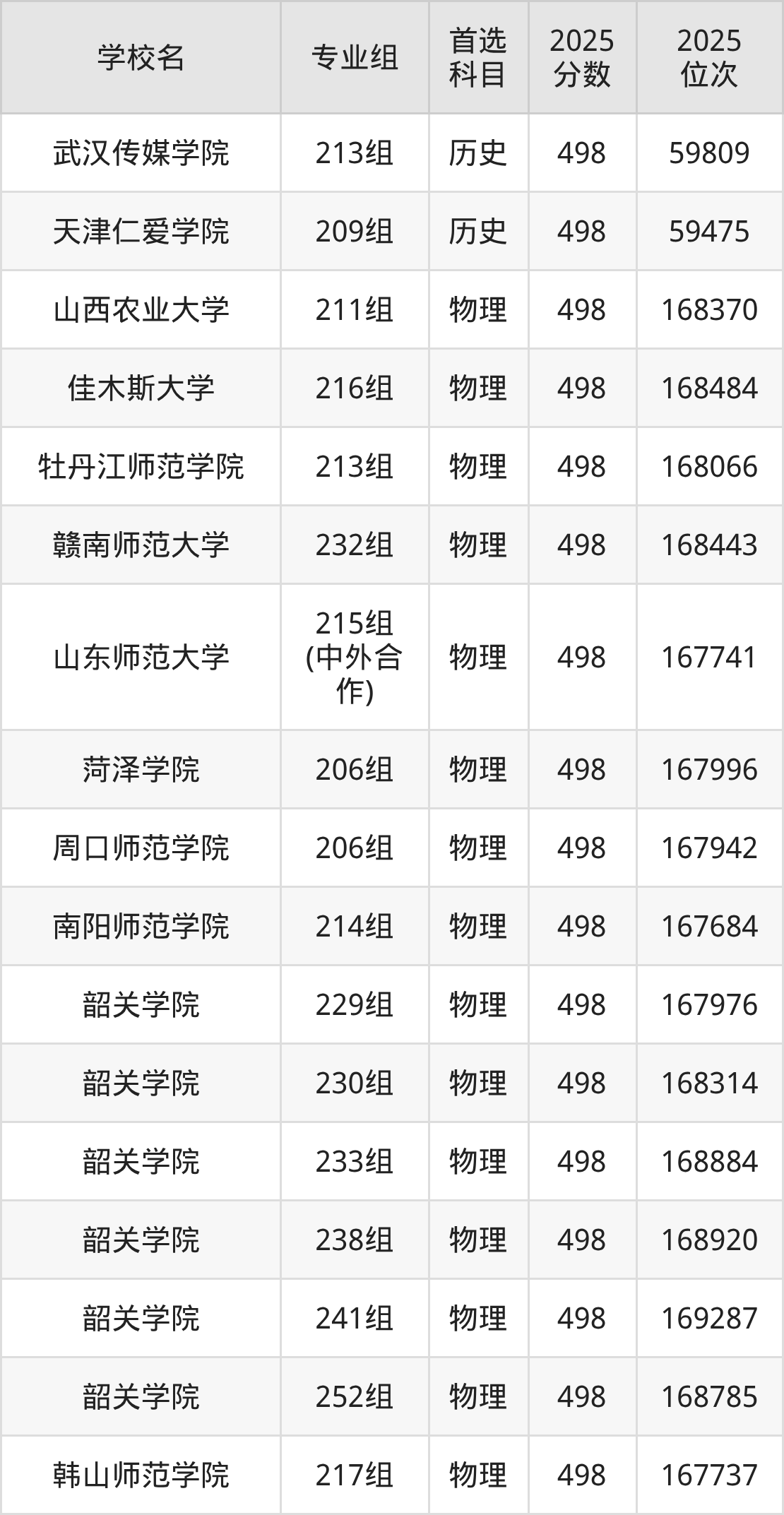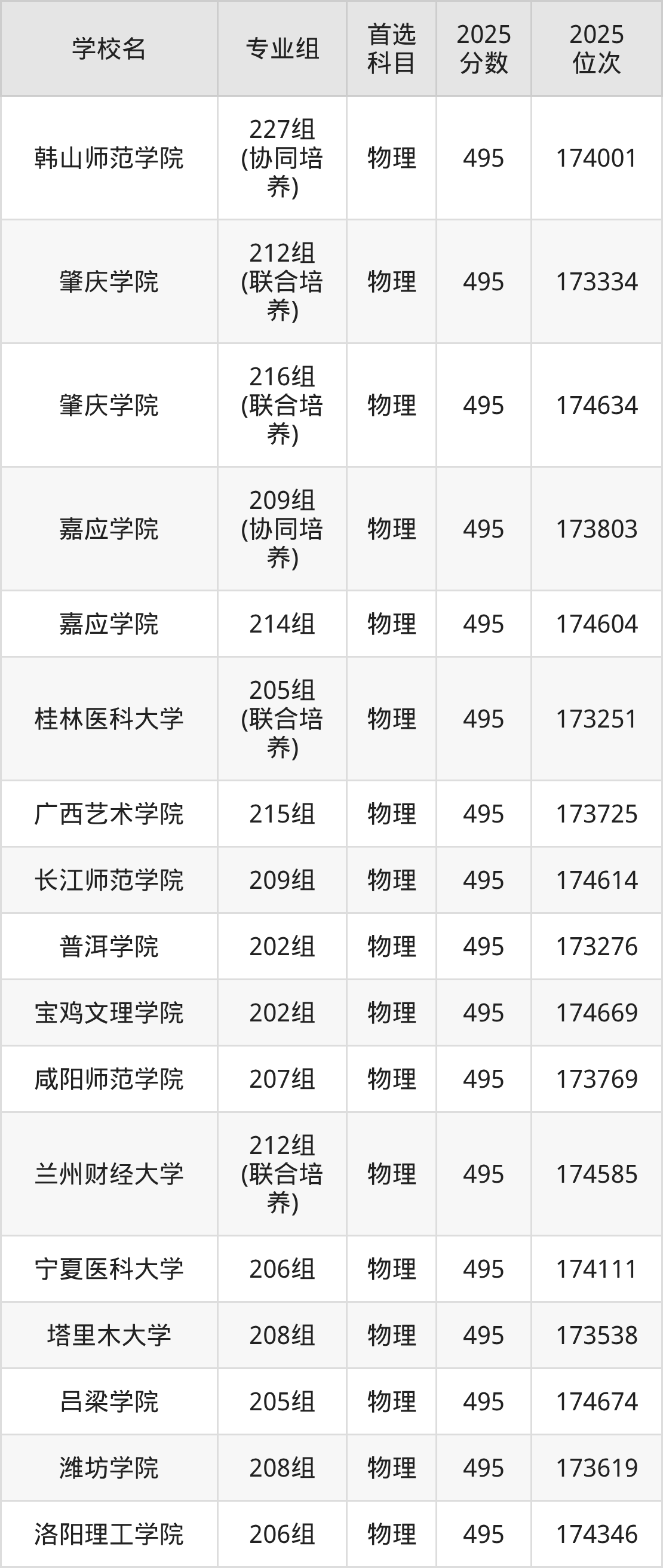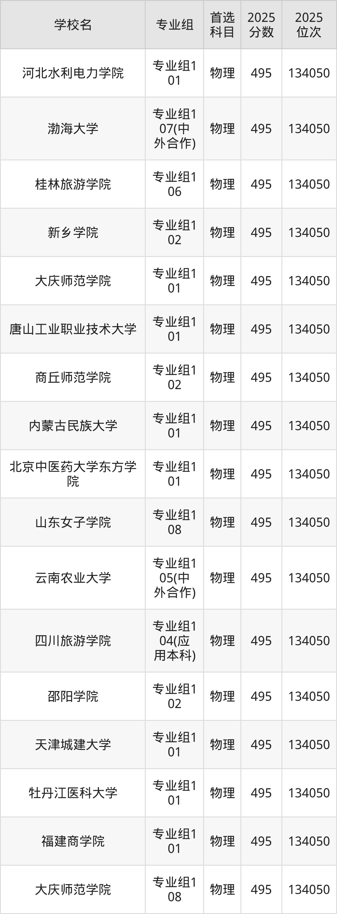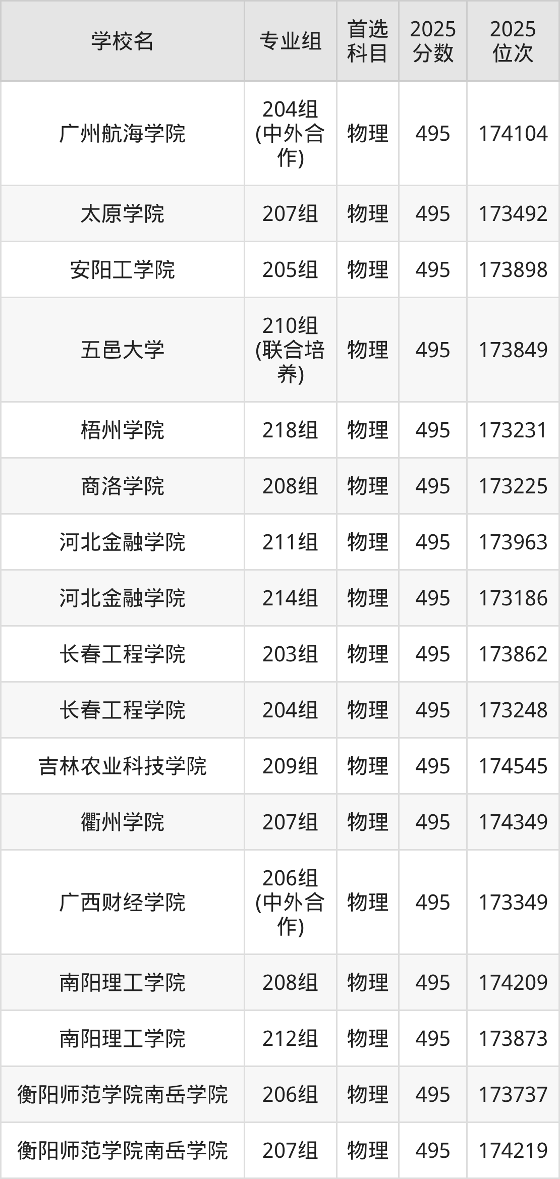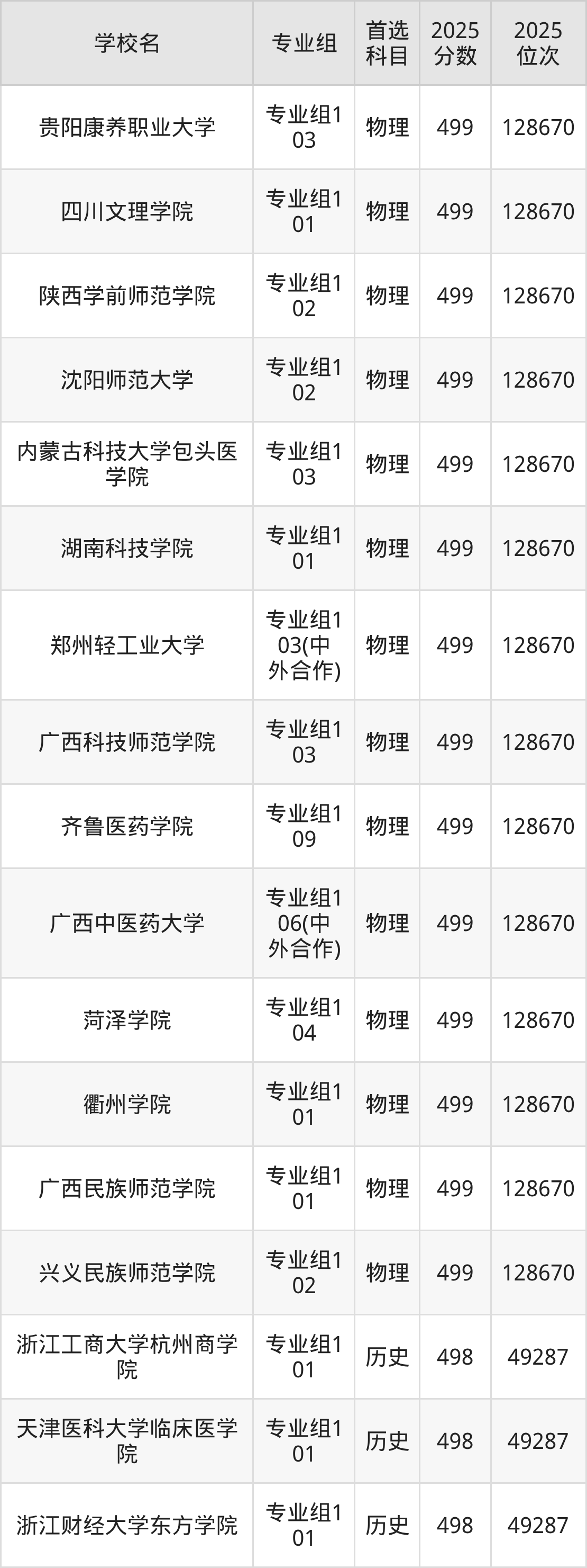 2025年在广东高考历史类录取分数线是497分的大学有安徽新华学院、宁夏理工学院、丽江文化旅游学院、长春电子科技学院、合肥城市学院、四川文化艺术学院、广东行政职业学院。物理类录取分数线是497分的大学有衡水学院、沧州师范学院、辽宁工程技术大学、武汉轻工大学、邵阳学院、怀化学院、韶关学院、韩山师范学院、岭南师范学院、肇庆学院等。