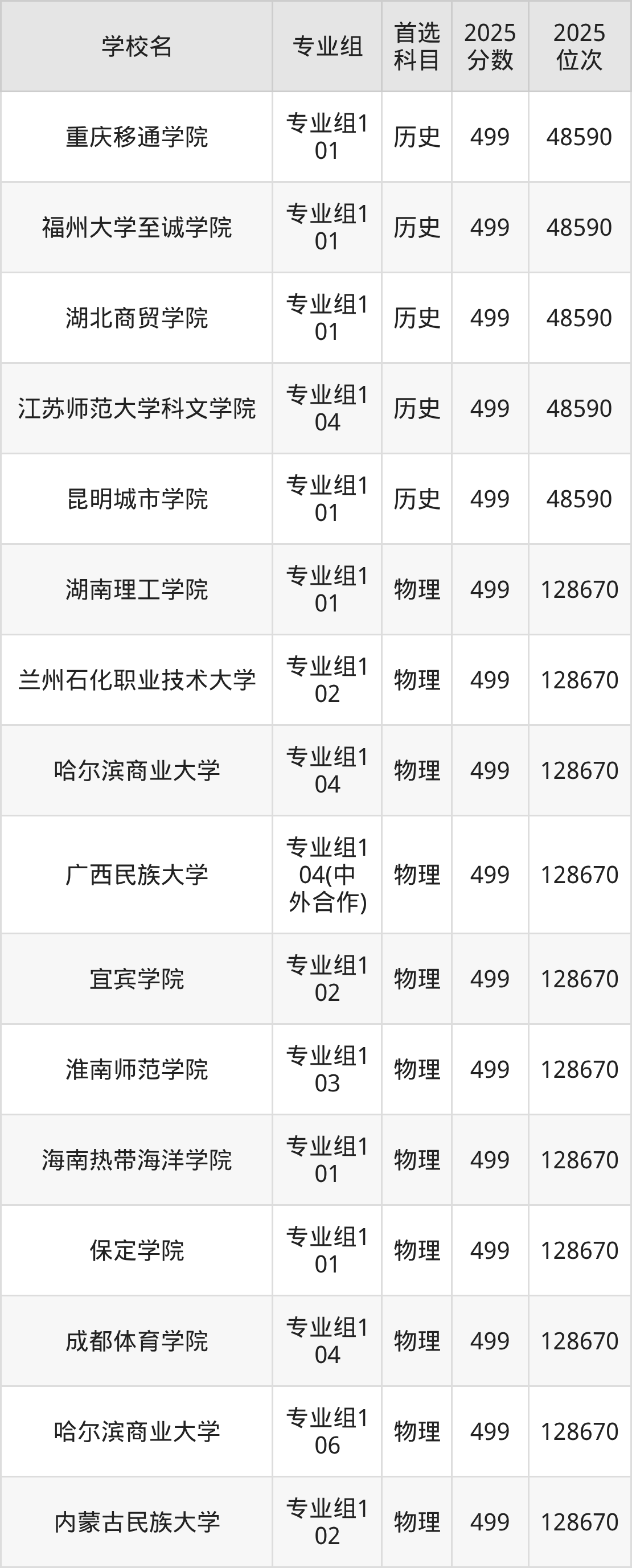 物理类497分可以冲的大学:湖南理工学院499分、兰州石化职业技术大学499分、哈尔滨商业大学499分、广西民族大学499分等;较稳妥的大学:兰州资源环境职业技术大学496分、西昌学院496分、岭南师范学院496分、鲁东大学496分等。