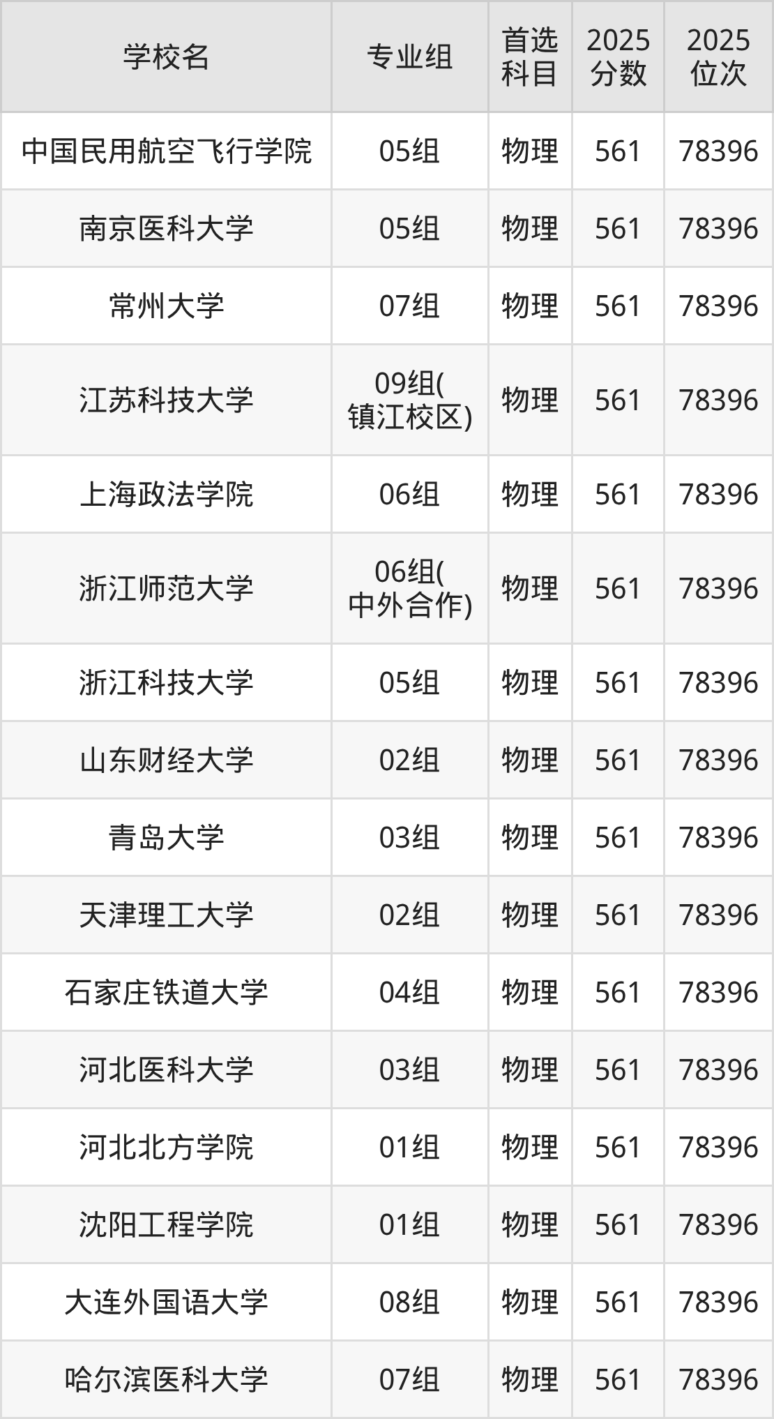 物理类559分可以冲的大学:中国民用航空飞行学院561分、南京医科大学561分、常州大学561分、江苏科技大学561分等;较稳妥的大学:徐州医科大学558分、上海电机学院558分、浙江科技大学558分、浙江财经大学558分等。