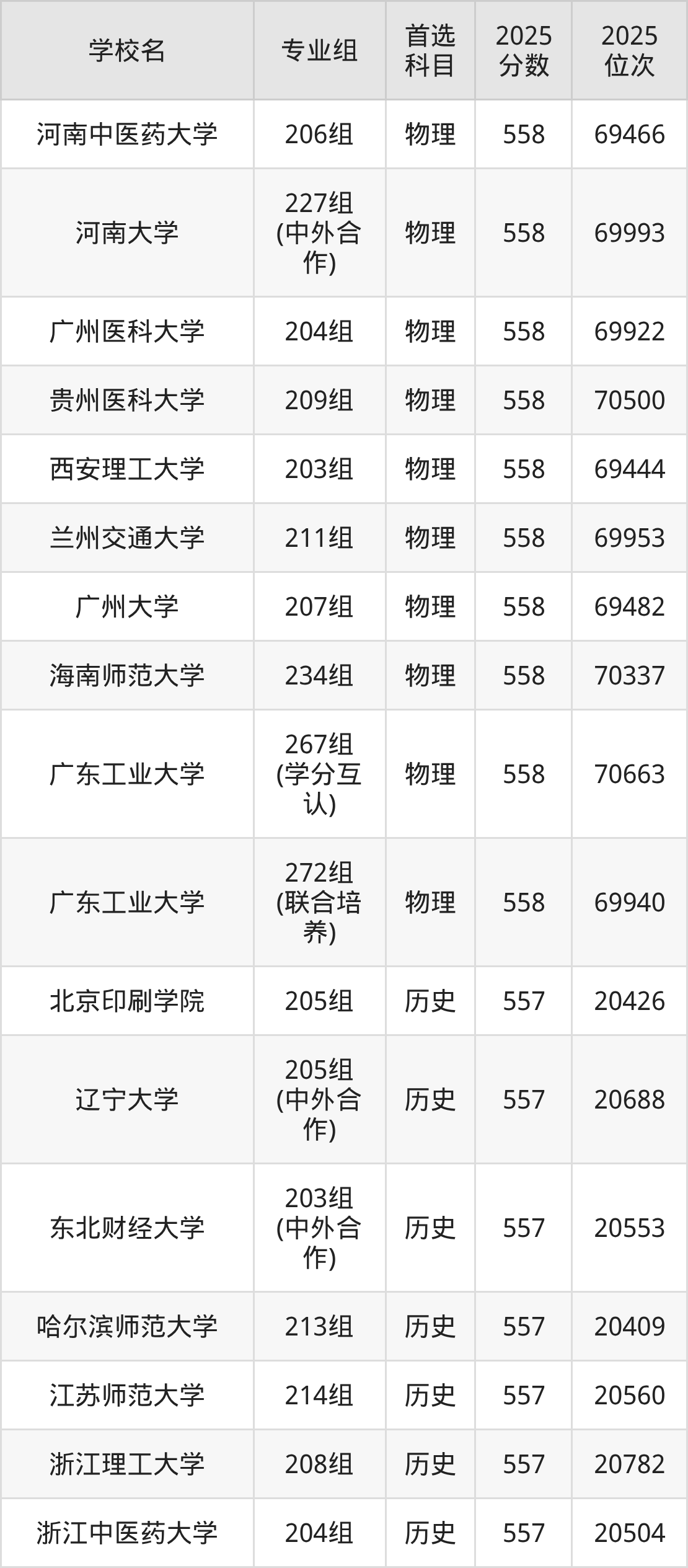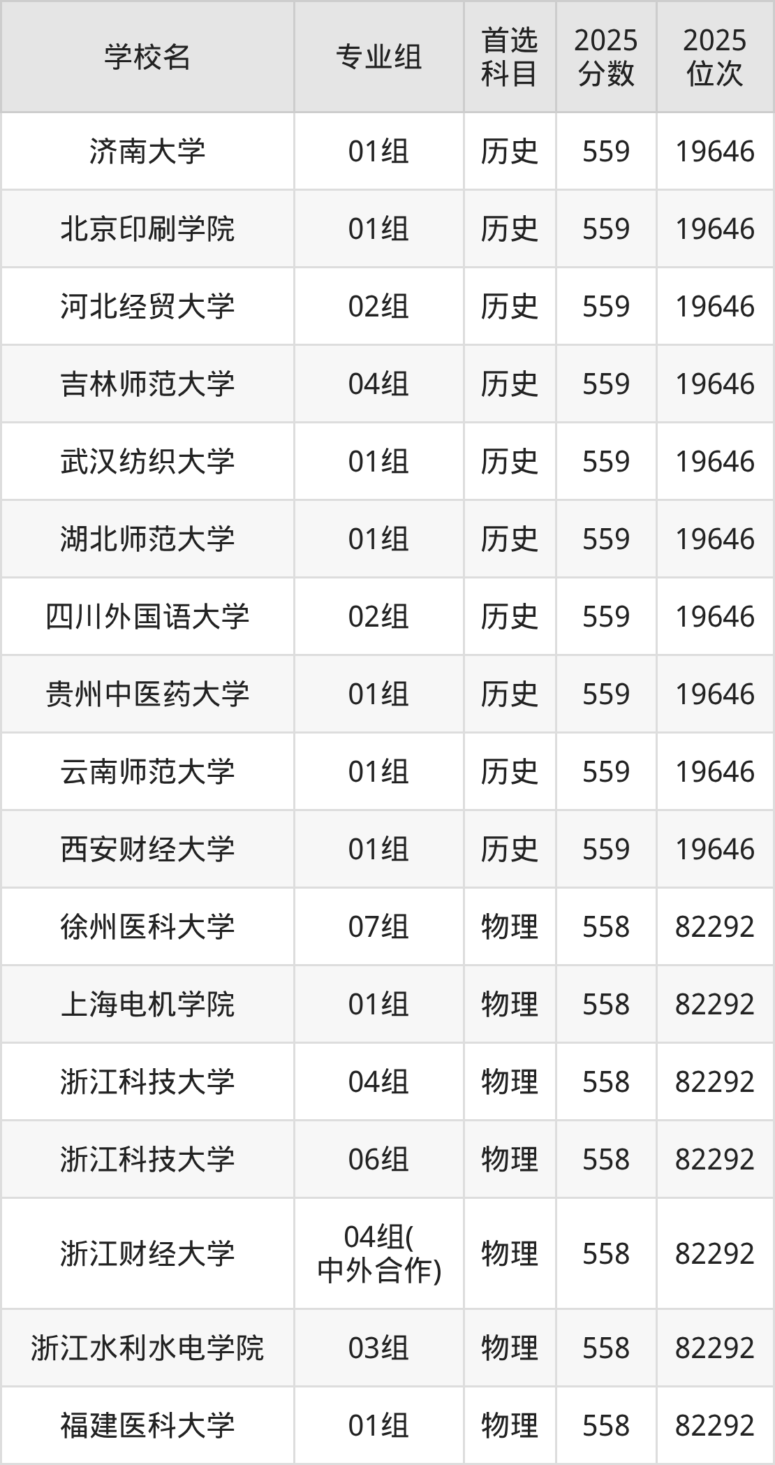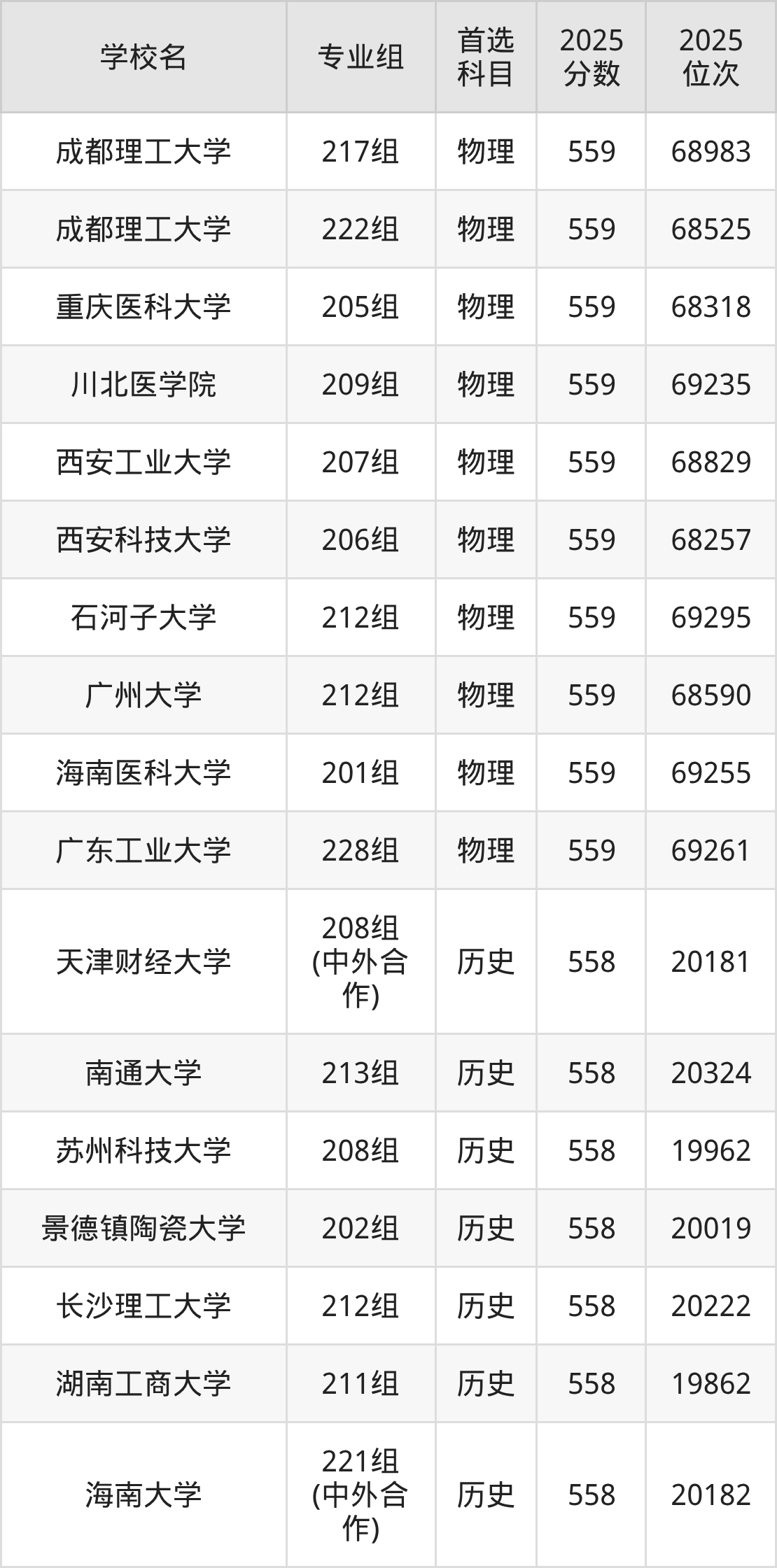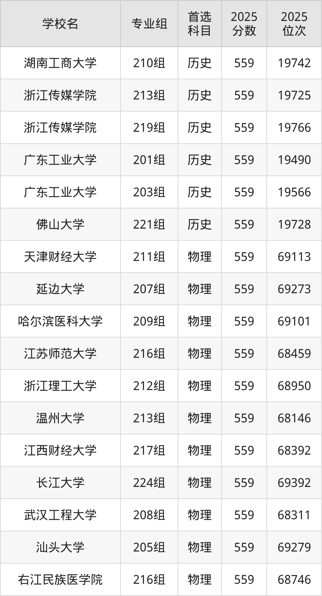 广东高考历史类559分对应的位次排名是19456名-19766名,物理类559分对应的位次排名是68146名-69392名,因此建议2026年位次排在这附近的同学考虑这些大学。
