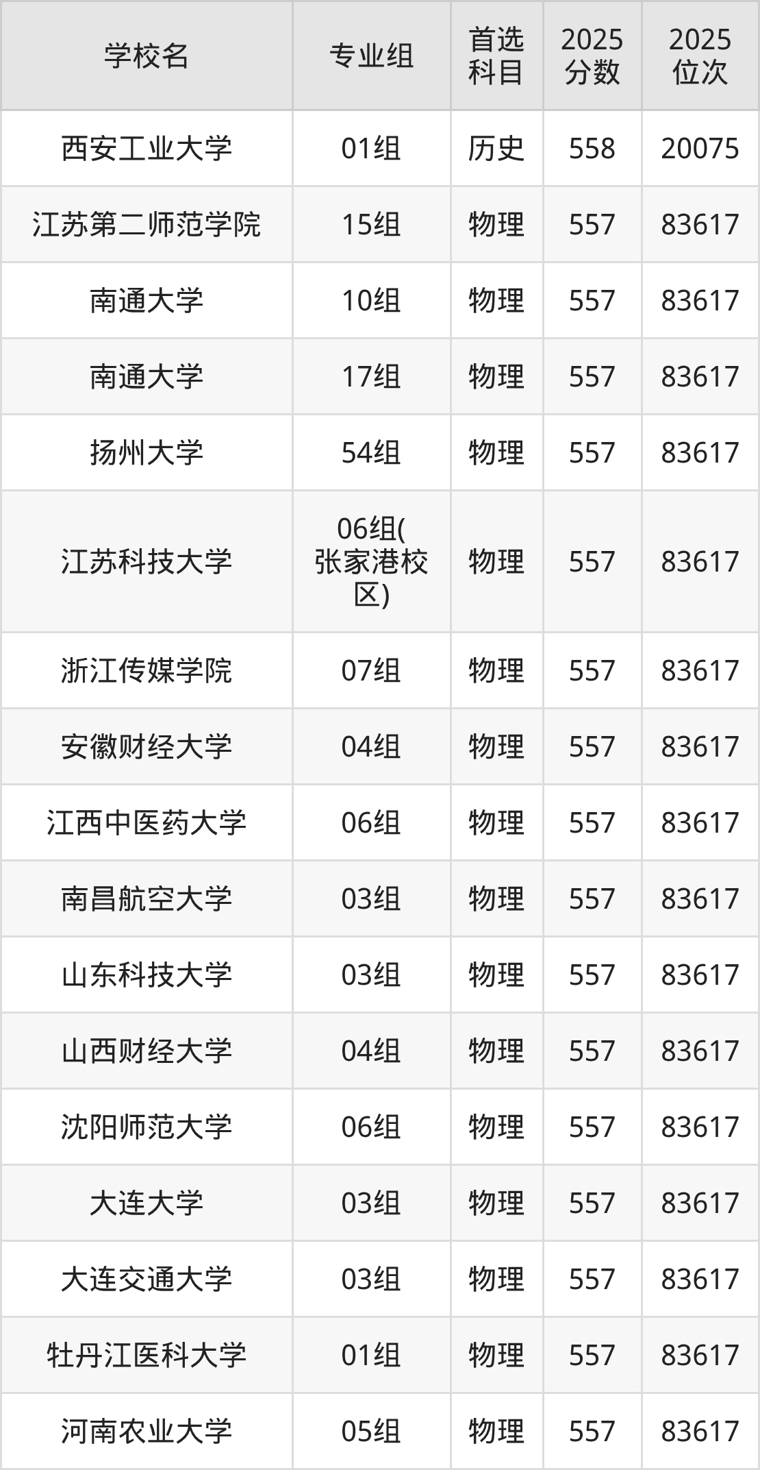 2025年在江苏高考物理类录取分数线是559分的大学有苏州科技大学、南通大学、扬州大学、上海立信会计金融学院、浙江农林大学、浙江中医药大学、安徽医科大学、安徽建筑大学、安徽理工大学、安徽工业大学等。历史类录取分数线是559分的大学有扬州大学、江苏科技大学、浙江师范大学、浙江科技大学、江西师范大学、济南大学、北京印刷学院、河北经贸大学、吉林师范大学、武汉纺织大学等。