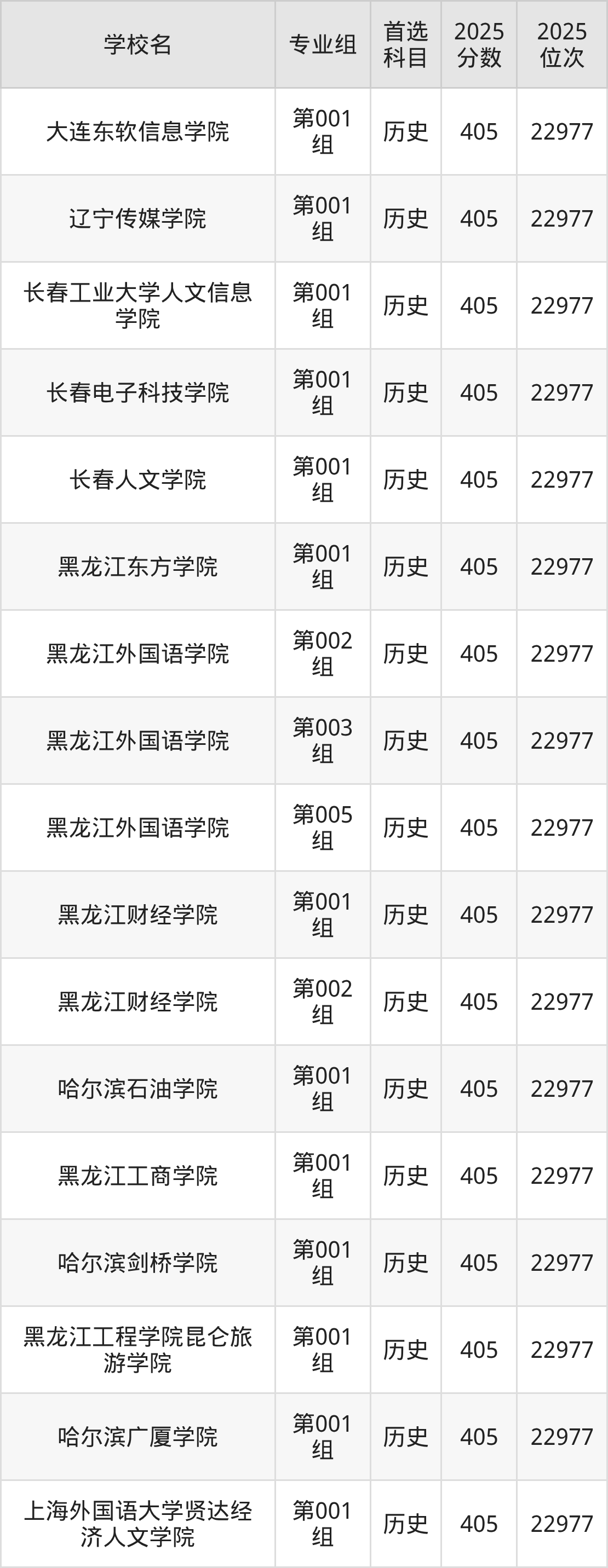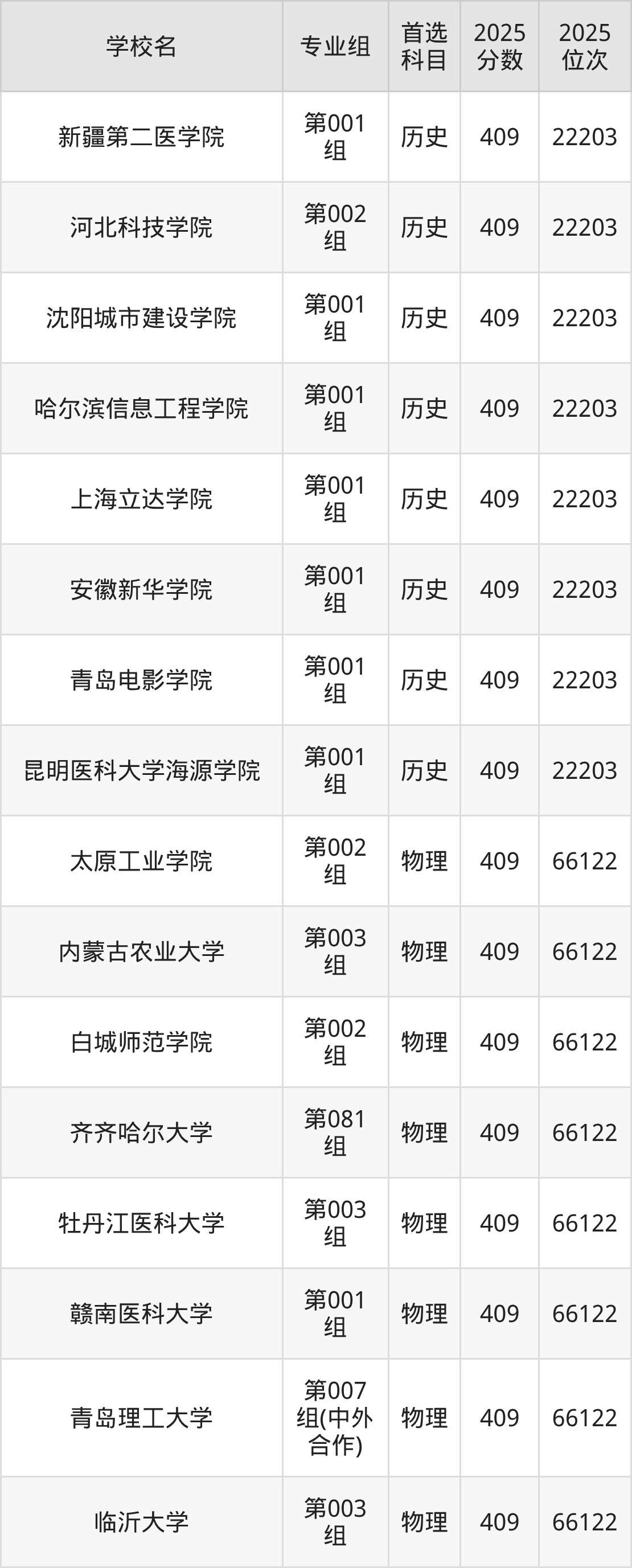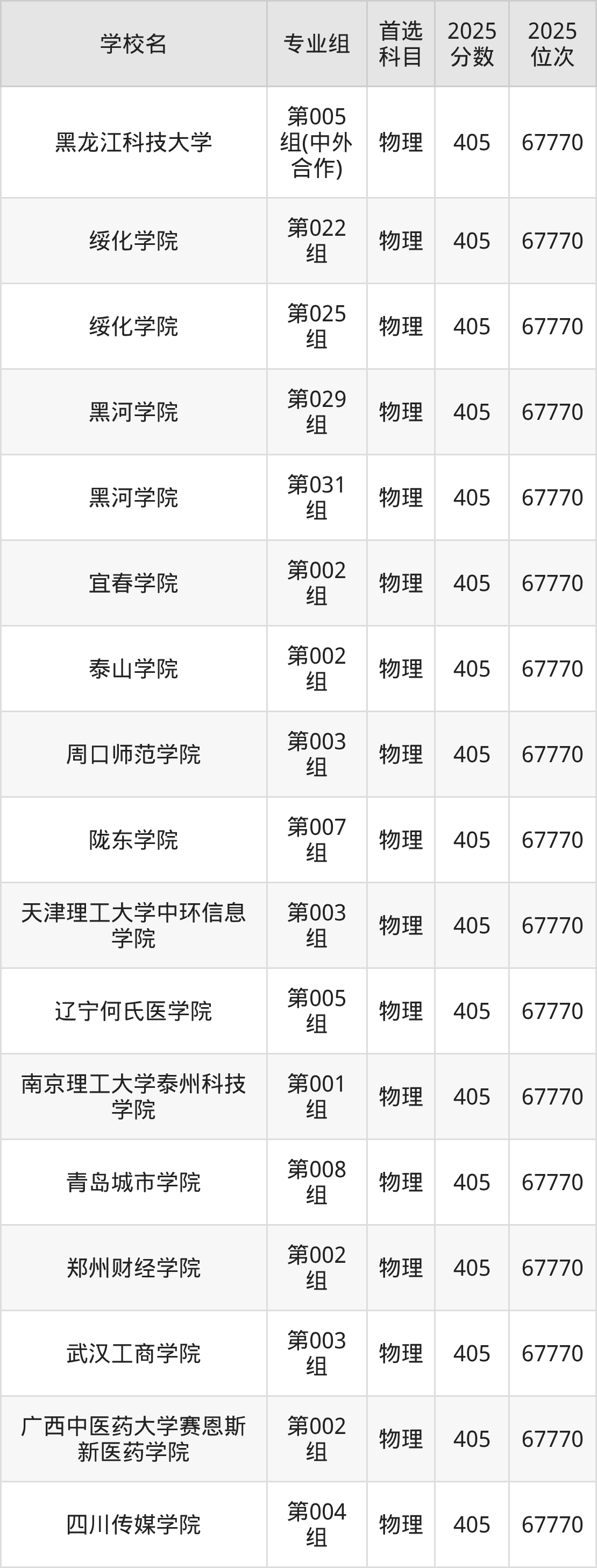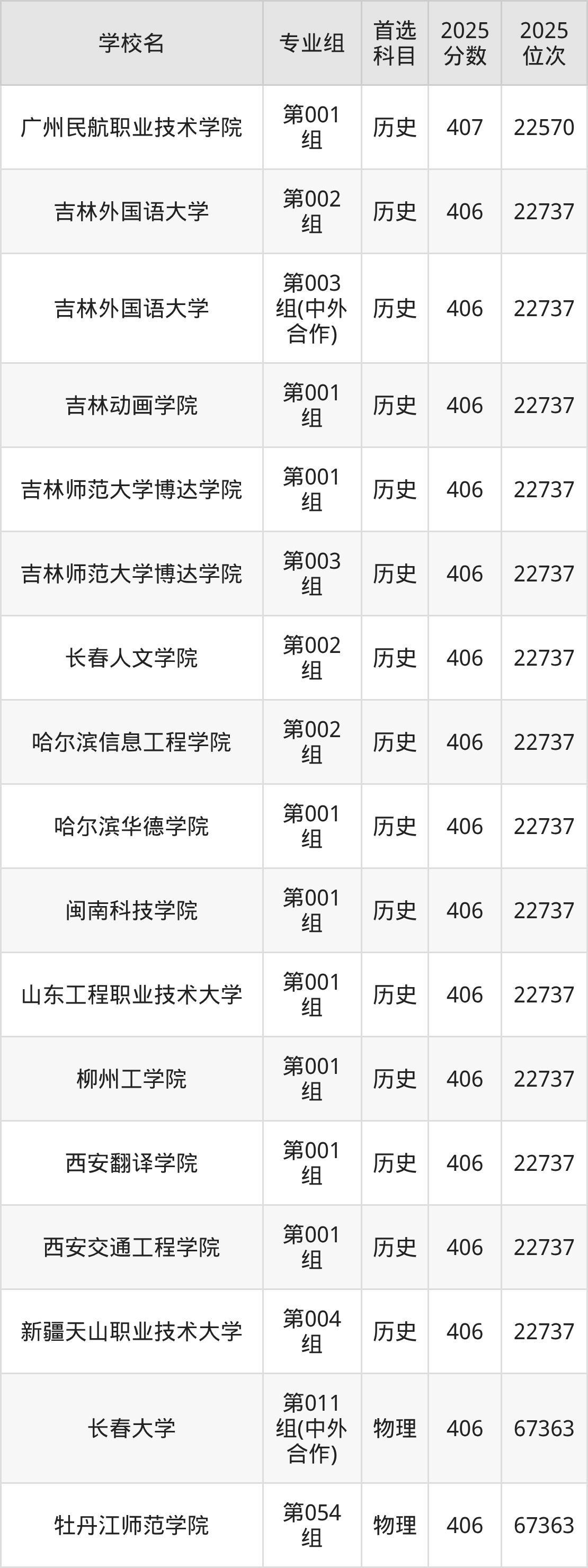 2025年在黑龙江高考历史类录取分数线是407分的大学有青岛滨海学院、山东协和学院、广州城市理工学院、广州南方学院、广州理工学院、吉利学院、日照职业技术学院、广州民航职业技术学院。物理类录取分数线是407分的大学有河北科技师范学院、内蒙古师范大学、吉林艺术学院、大庆师范学院、河南理工大学、黄淮学院、湖南文理学院、桂林医科大学、甘肃民族师范学院、牡丹江医科大学(少数民族预科)等。