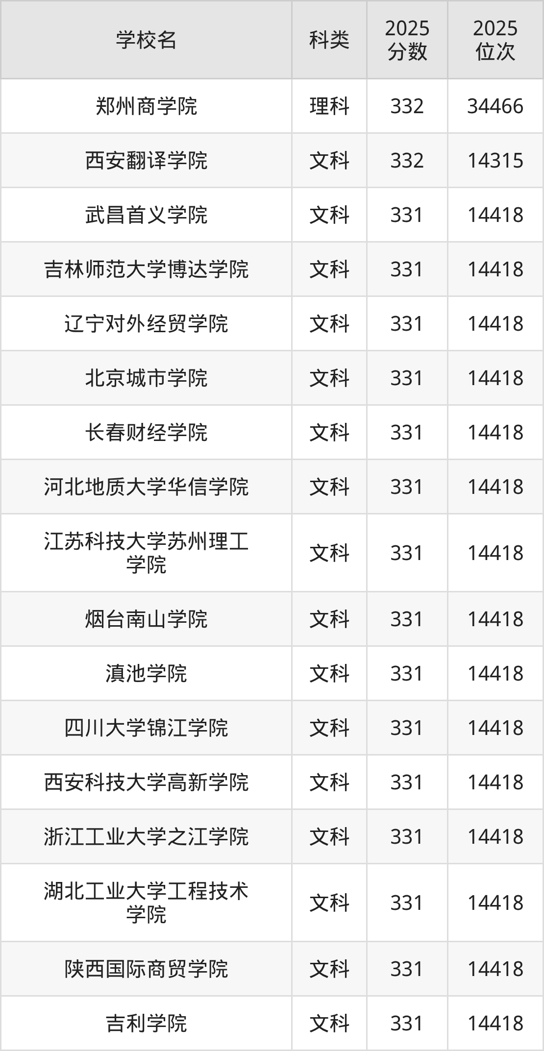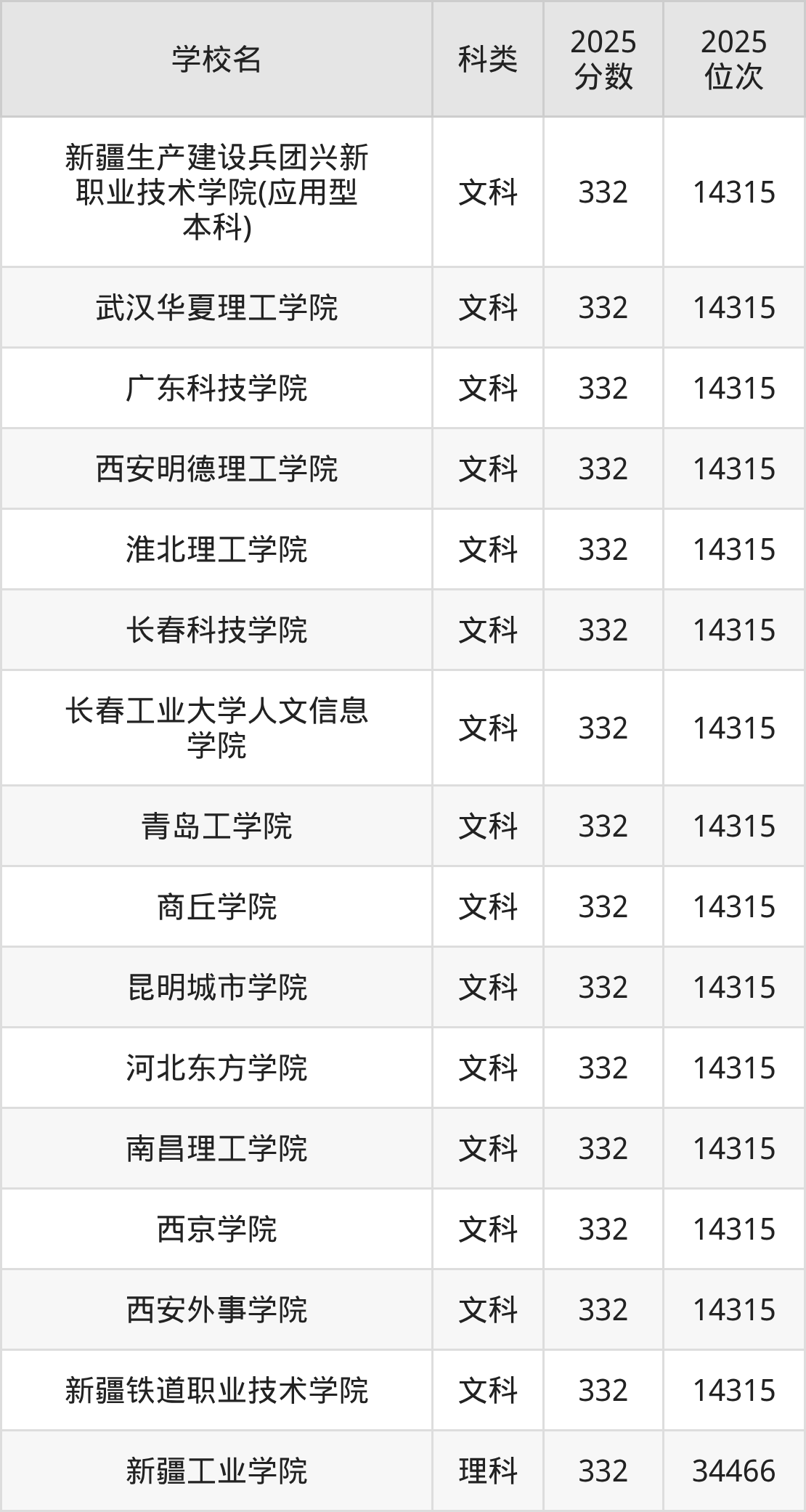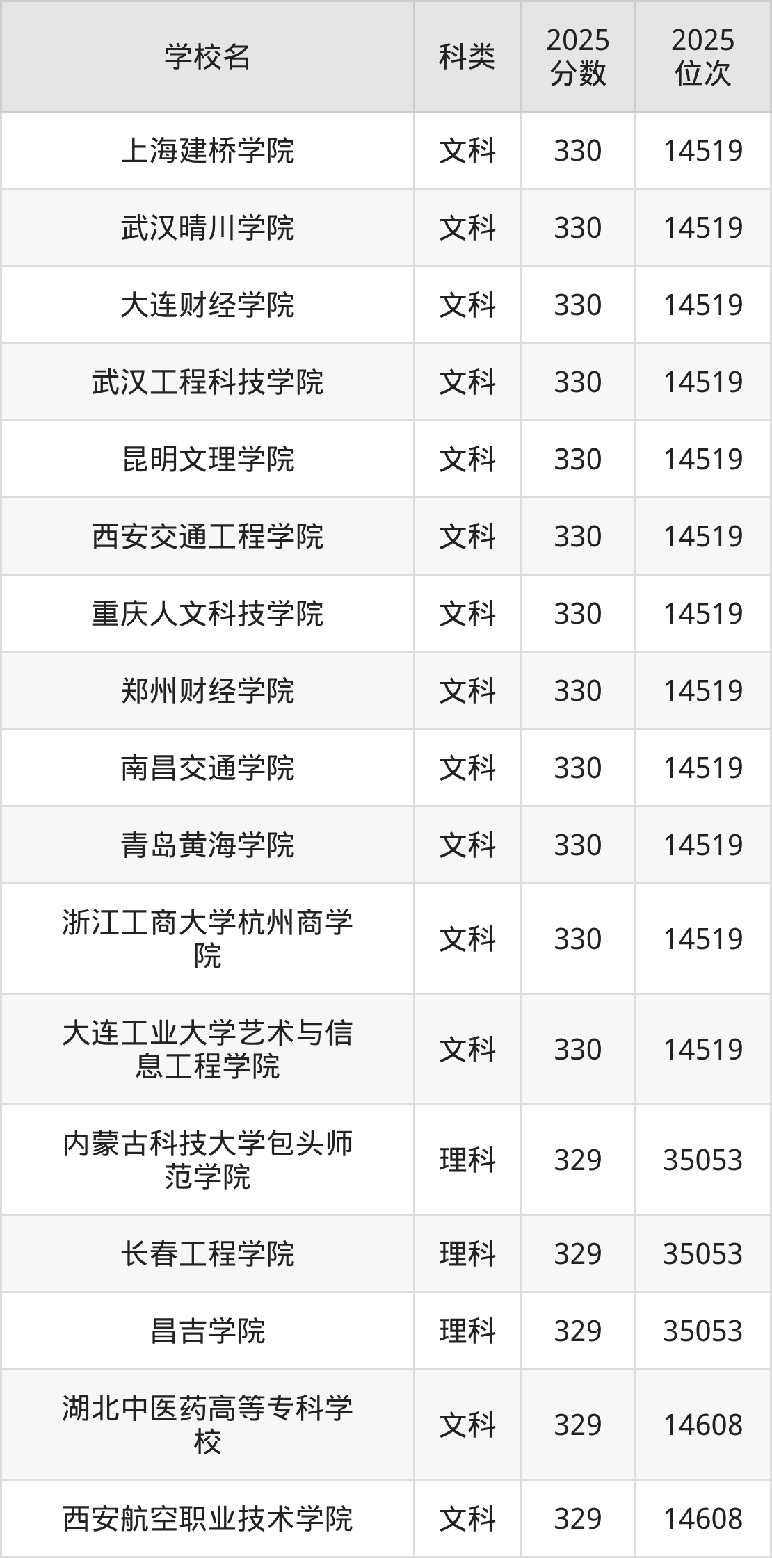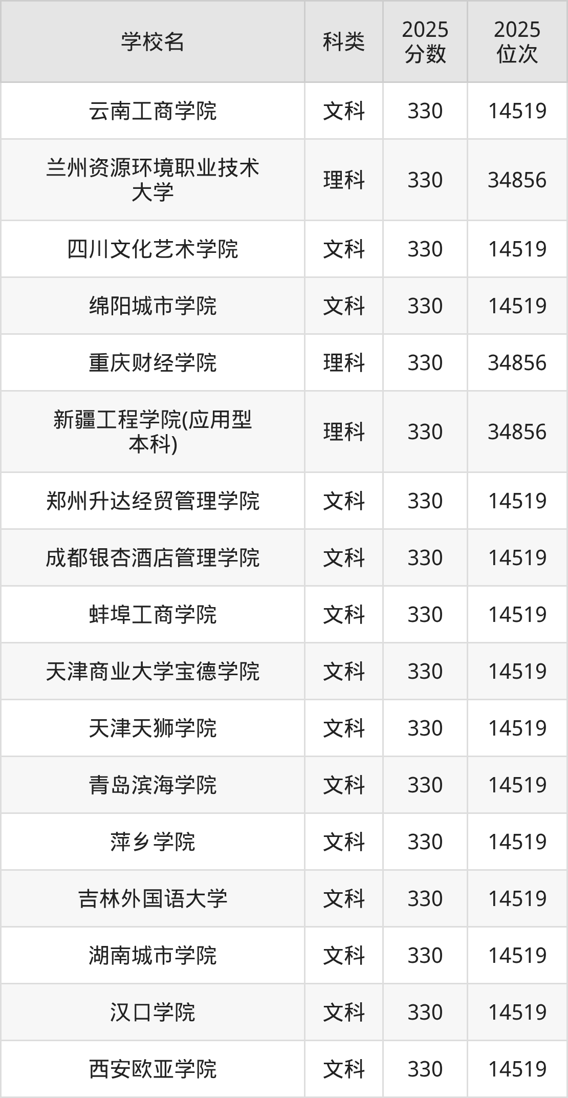 新疆高考文科330分对应的位次排名是14519名,理科330分对应的位次排名是34856名,因此建议2026年位次排在这附近的同学考虑这些大学。
