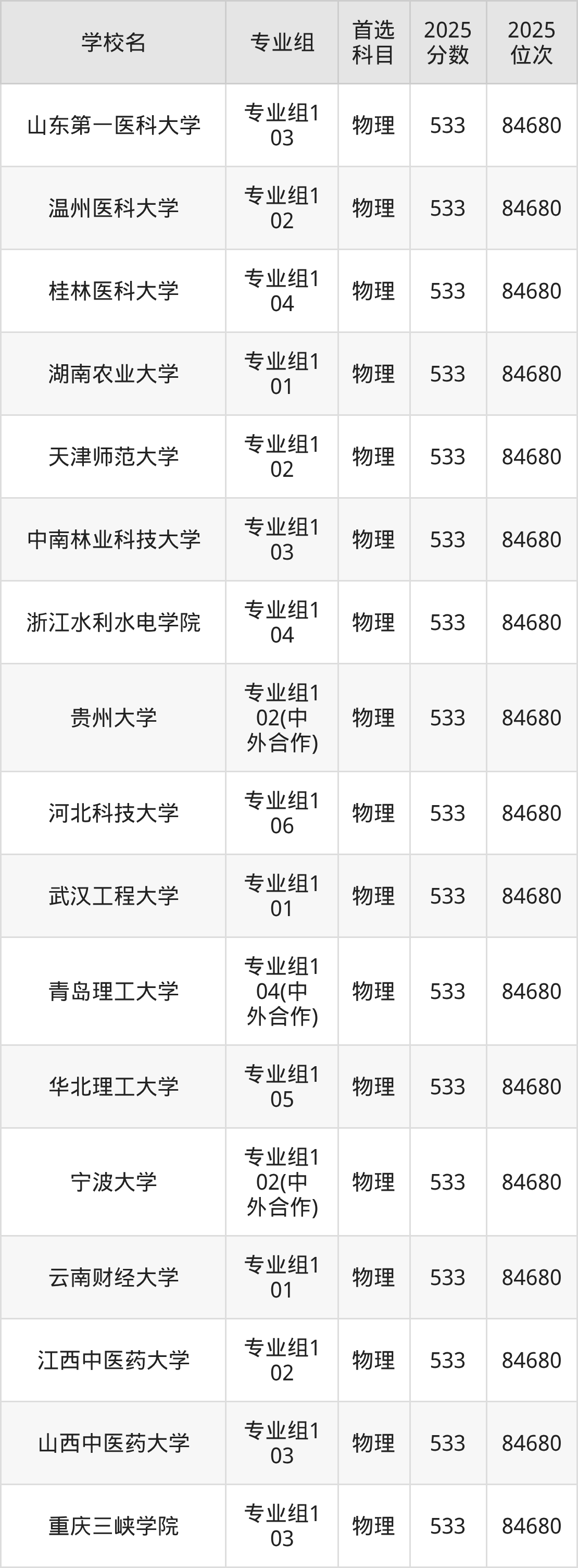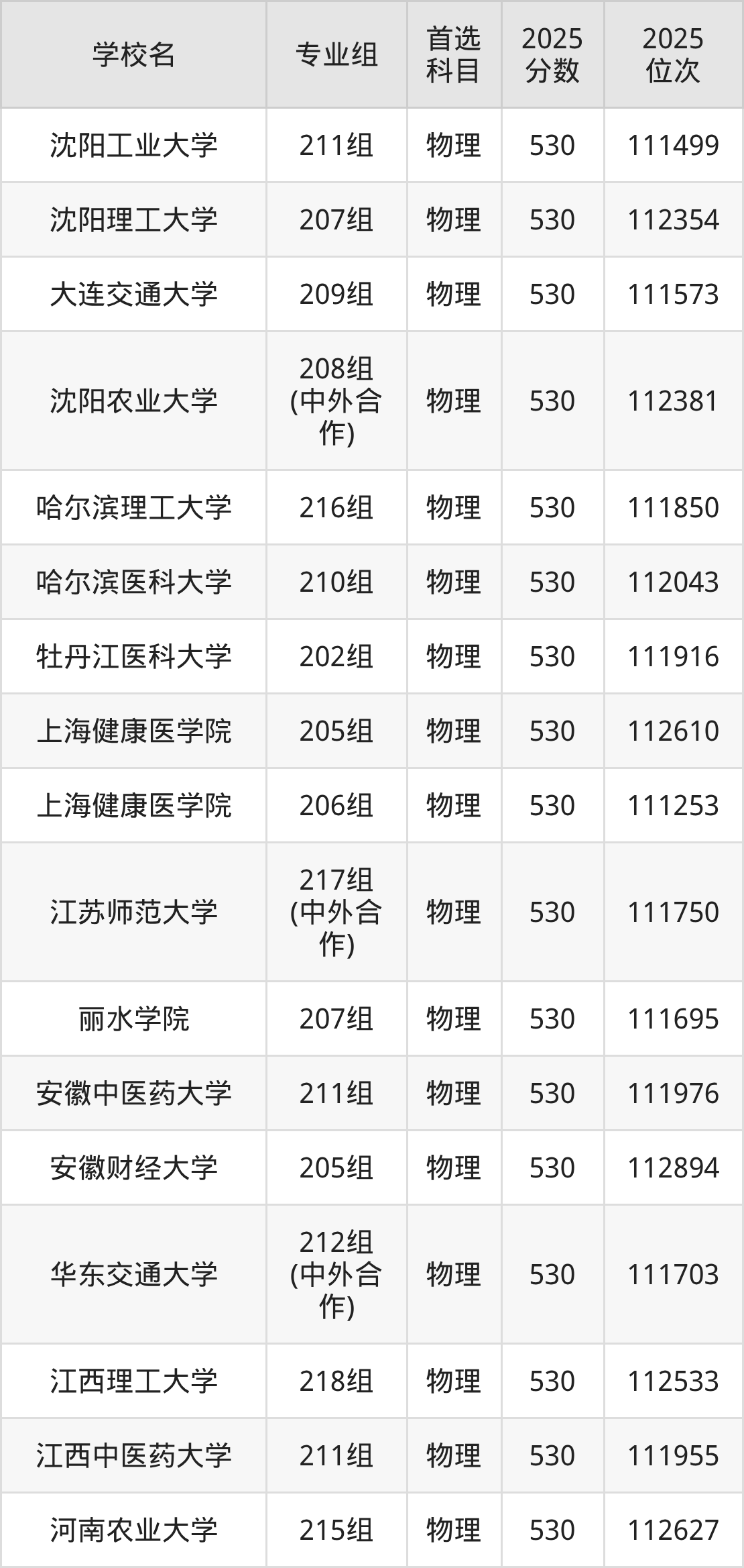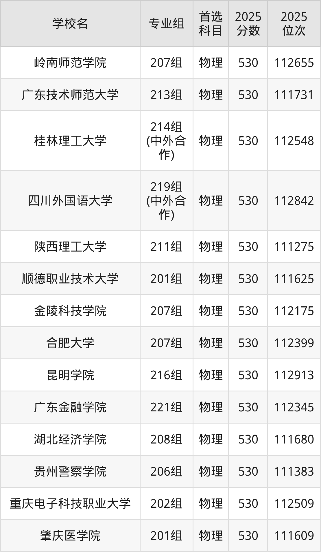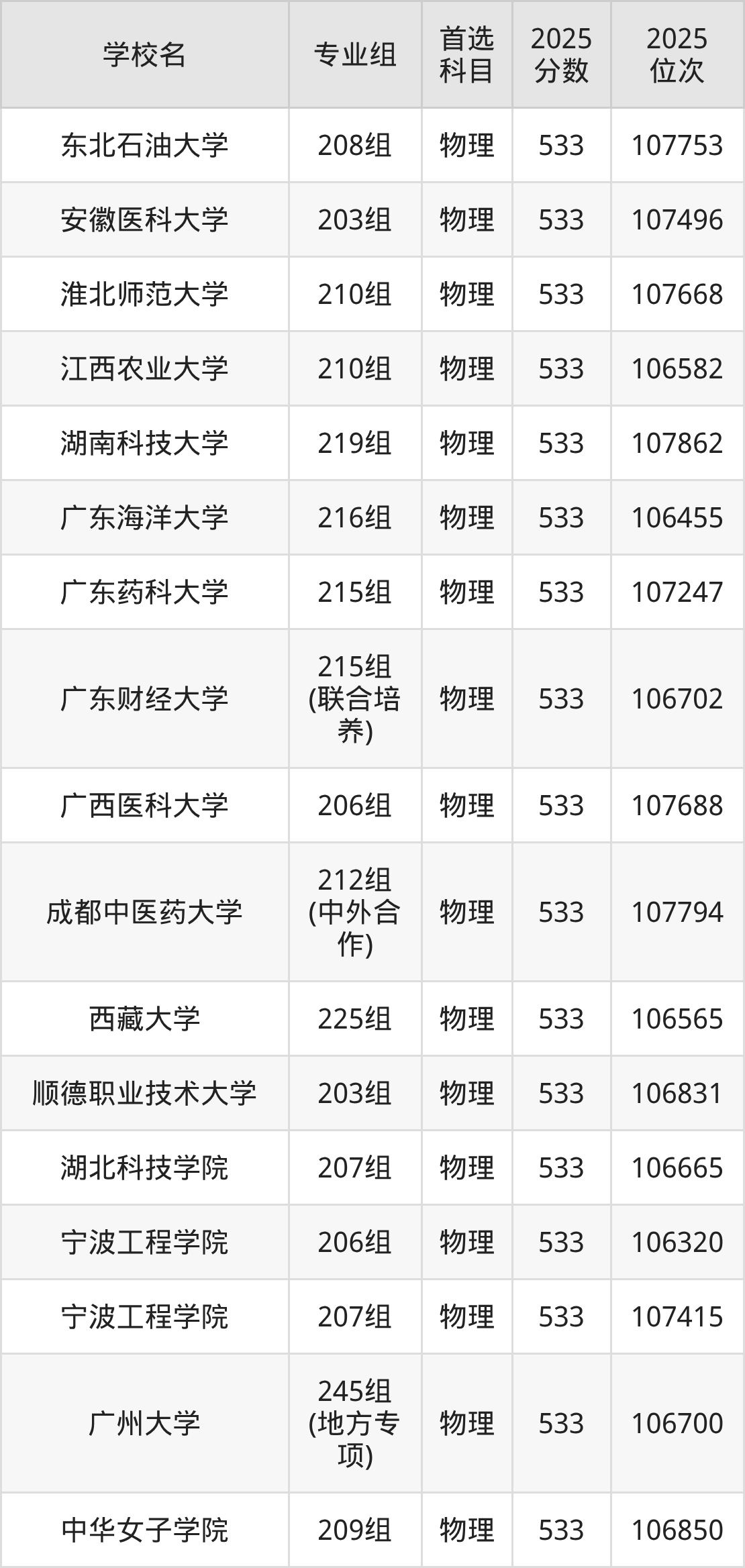 2025年在广东高考物理类录取分数线是532分的大学有长春工业大学、黑龙江大学、浙江海洋大学、安徽理工大学、东华理工大学、江西财经大学、济南大学、山东第一医科大学、河南农业大学、河南中医药大学等。历史类录取分数线是532分的大学有大连工业大学、宜春学院、湖北文理学院、武汉体育学院、韶关学院、惠州学院、陕西理工大学、新疆师范大学、天津城建大学、金陵科技学院等。