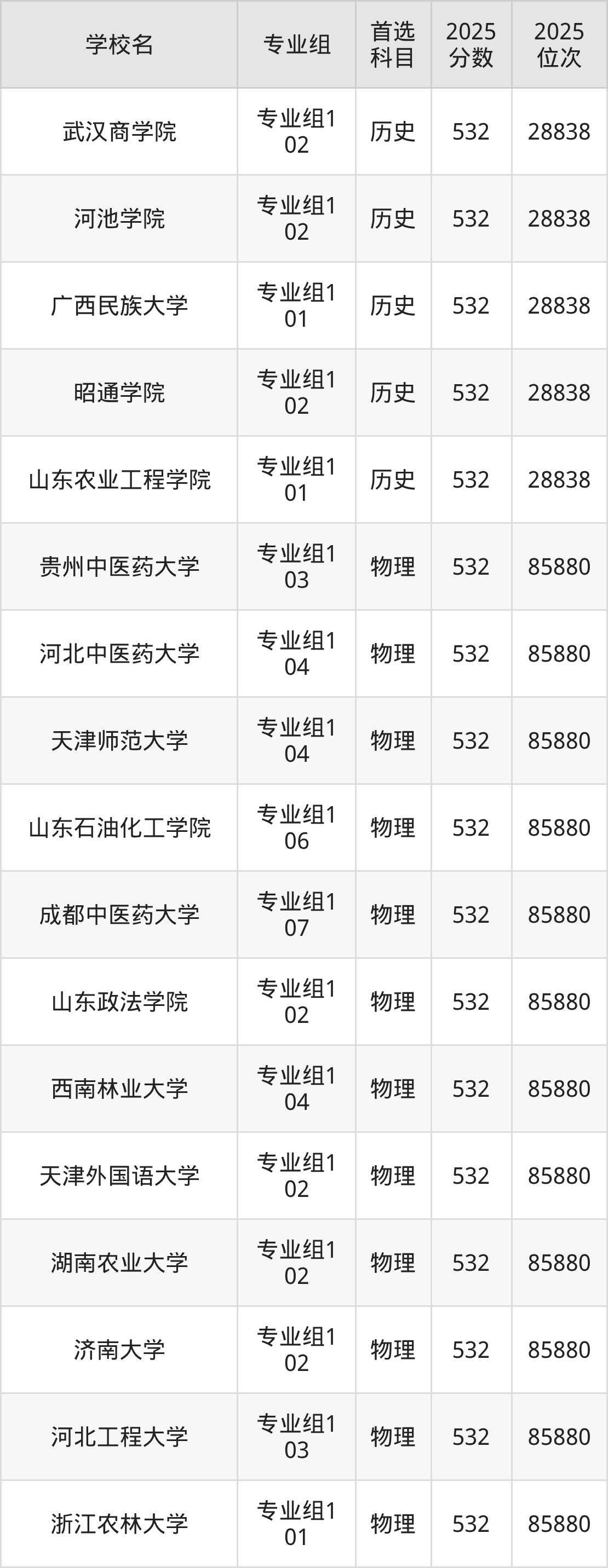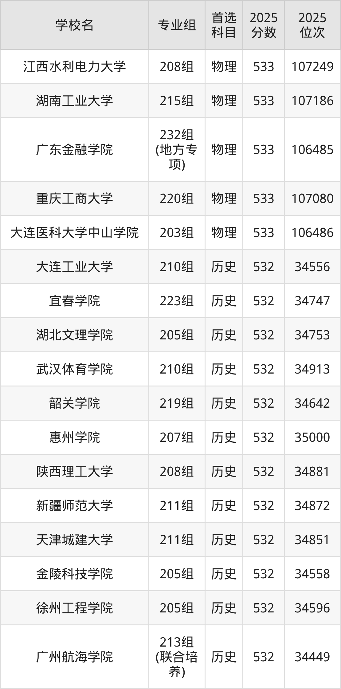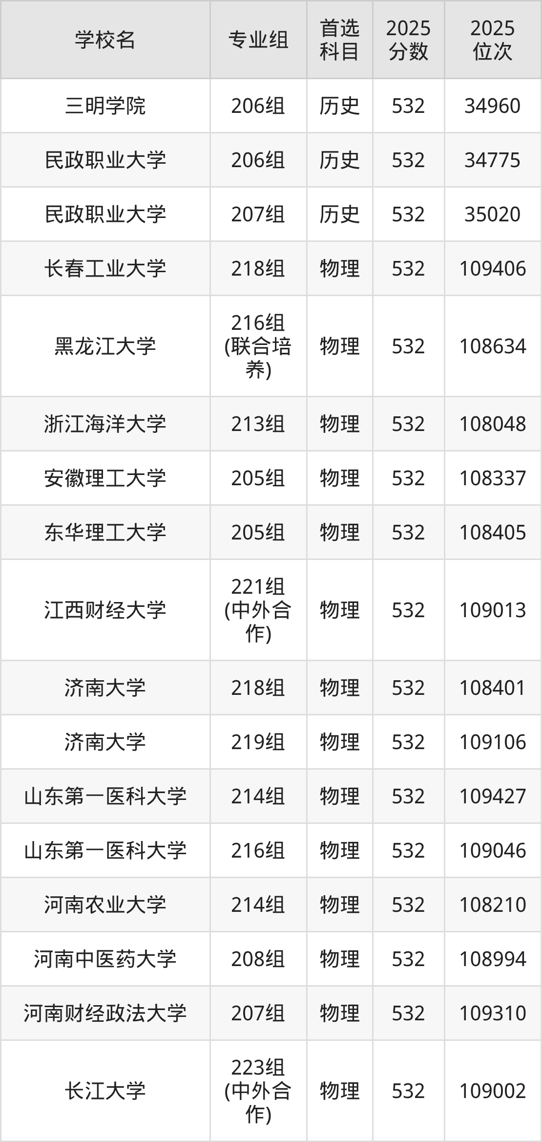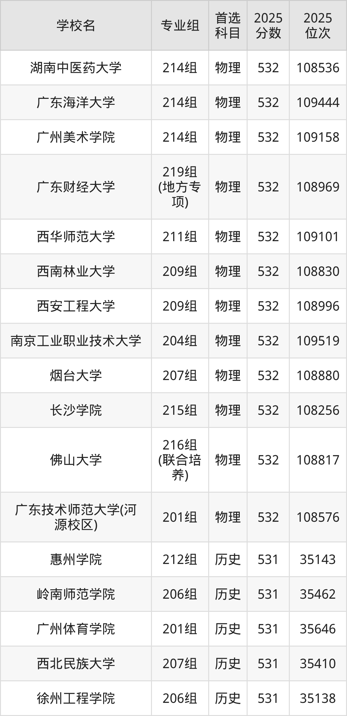 广东高考历史类532分对应的位次排名是34449名-35020名,物理类532分对应的位次排名是108048名-109519名,因此建议2026年位次排在这附近的同学考虑这些大学。