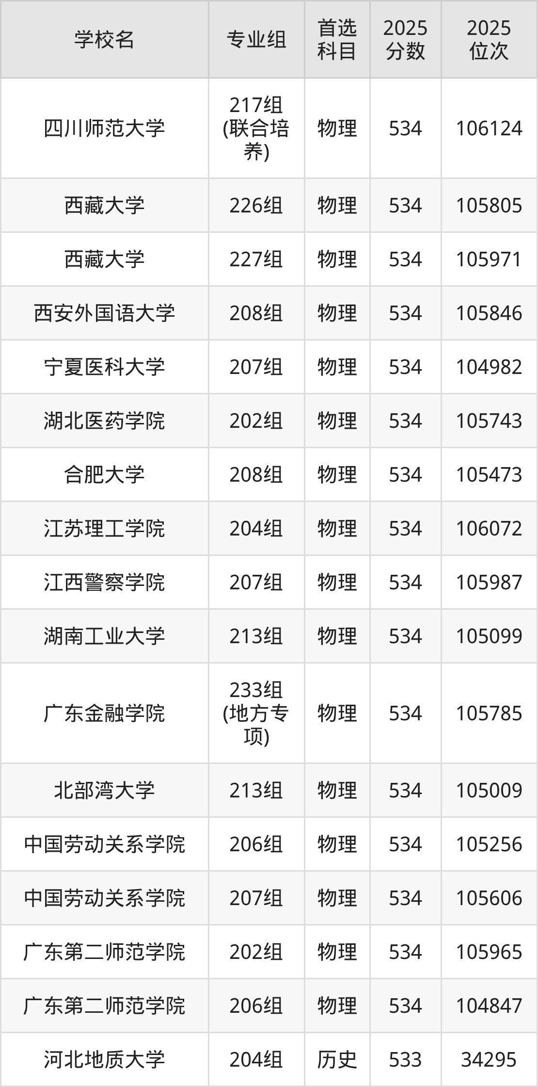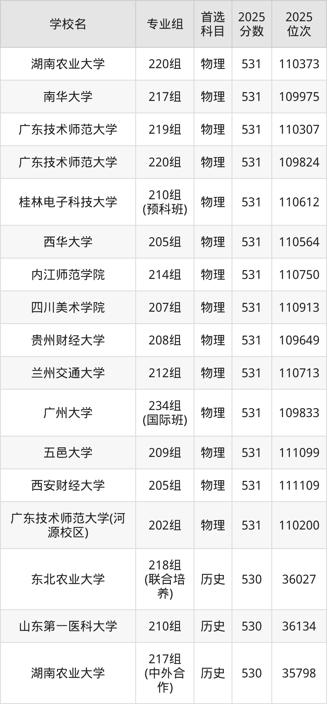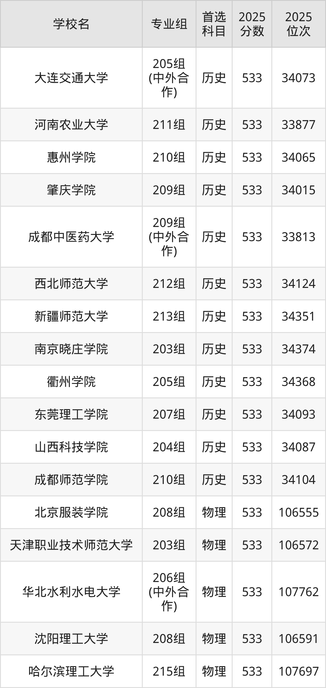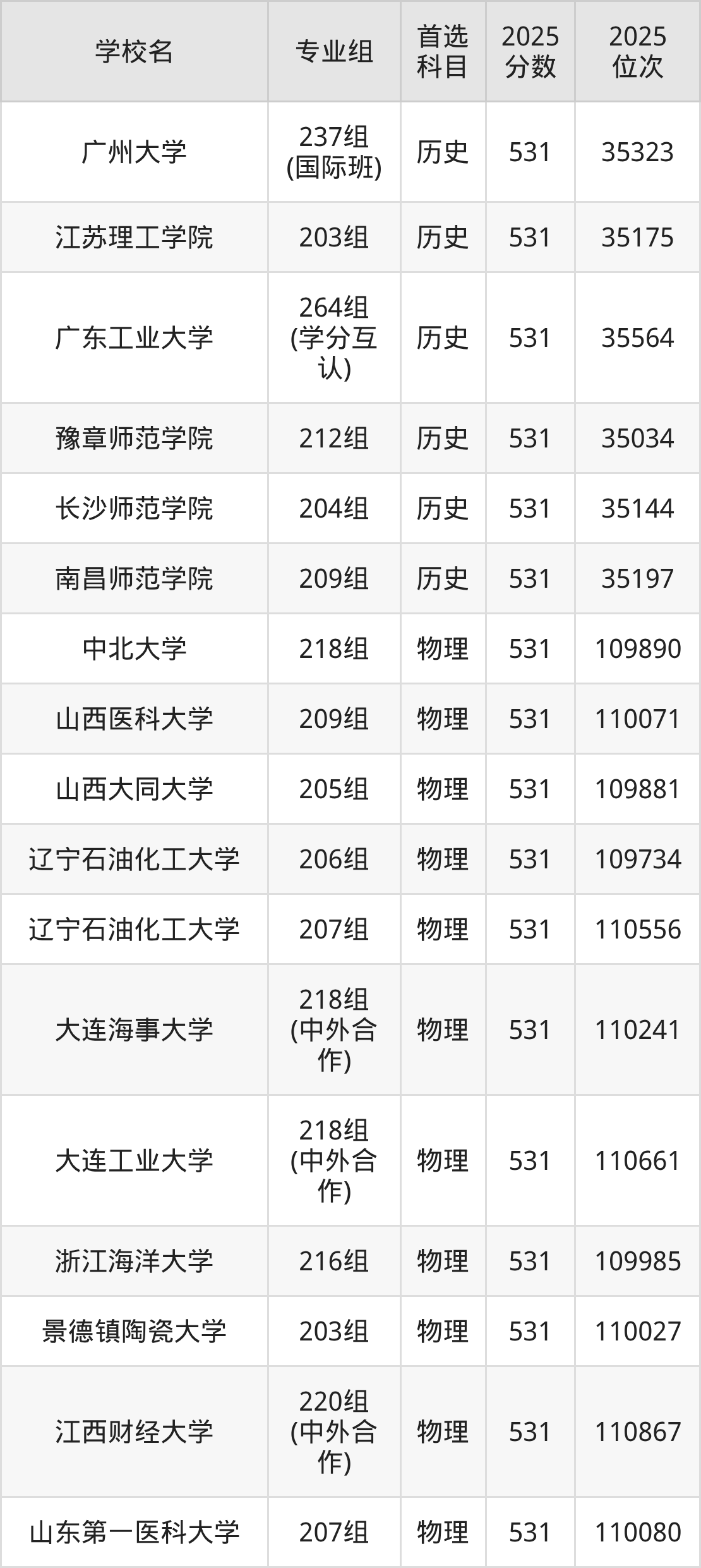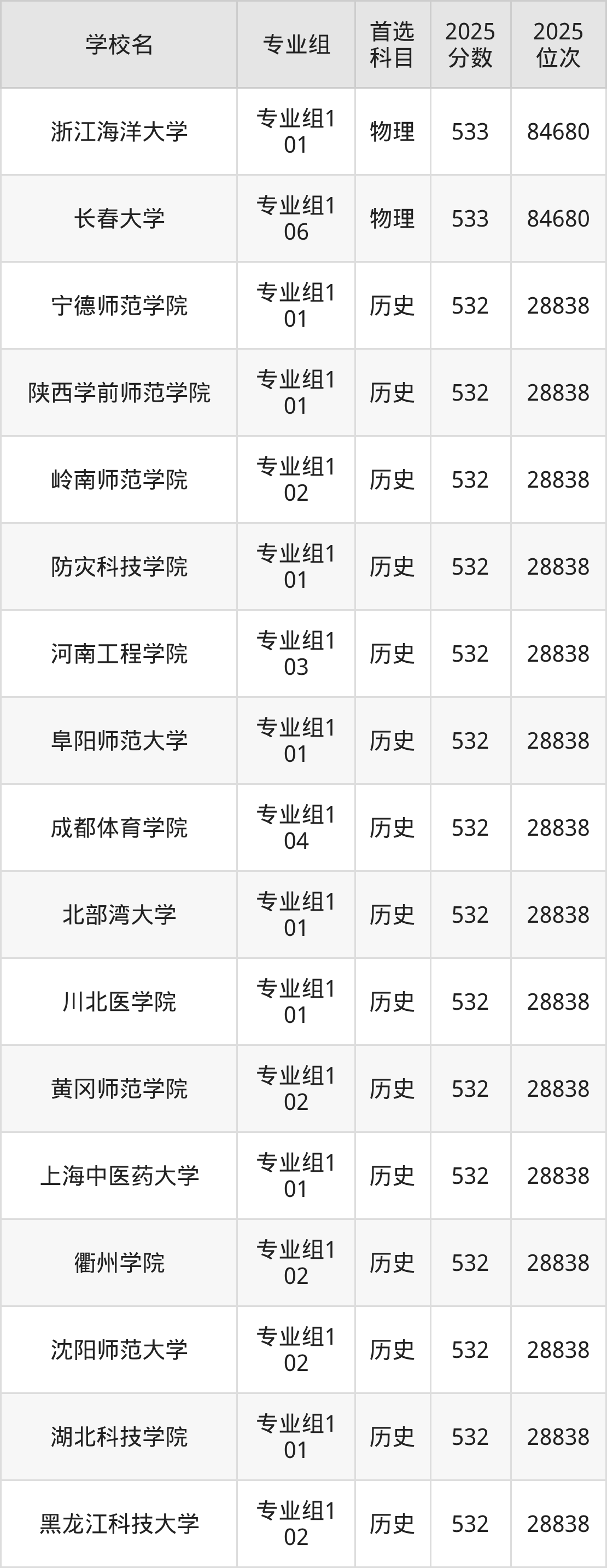 广东高考历史类532分对应的位次排名是34449名-35020名,物理类532分对应的位次排名是108048名-109519名,因此建议2026年位次排在这附近的同学考虑这些大学。