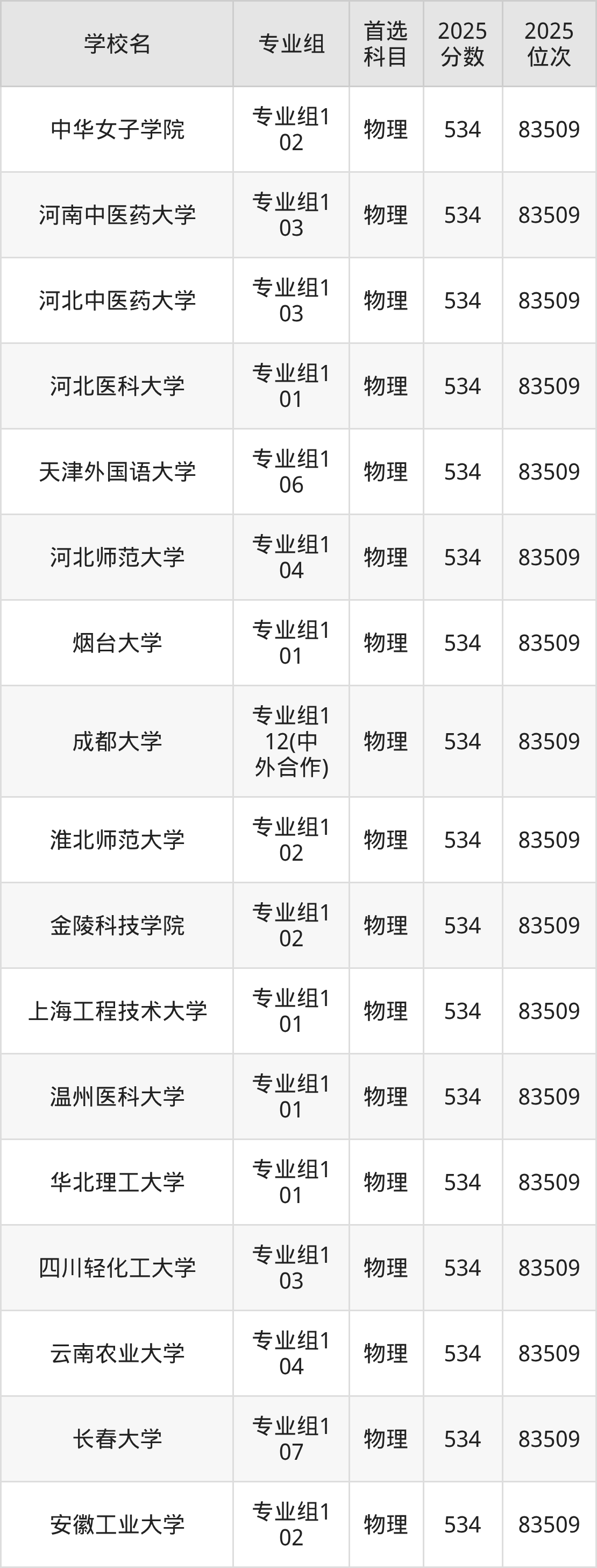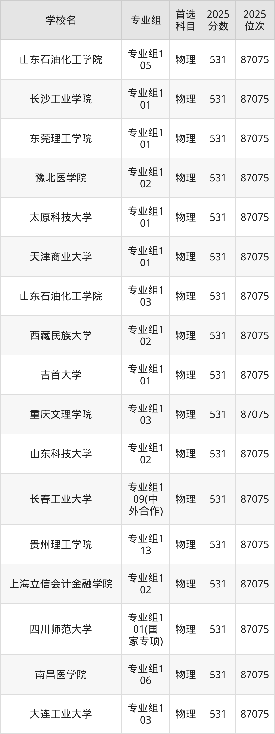 物理类532分可以冲的大学:长春大学534分、石家庄铁道大学534分、大连民族大学534分、西北师范大学534分等;较稳妥的大学:成都理工大学531分、大理大学531分、郑州航空工业管理学院531分、湖北汽车工业学院531分等。