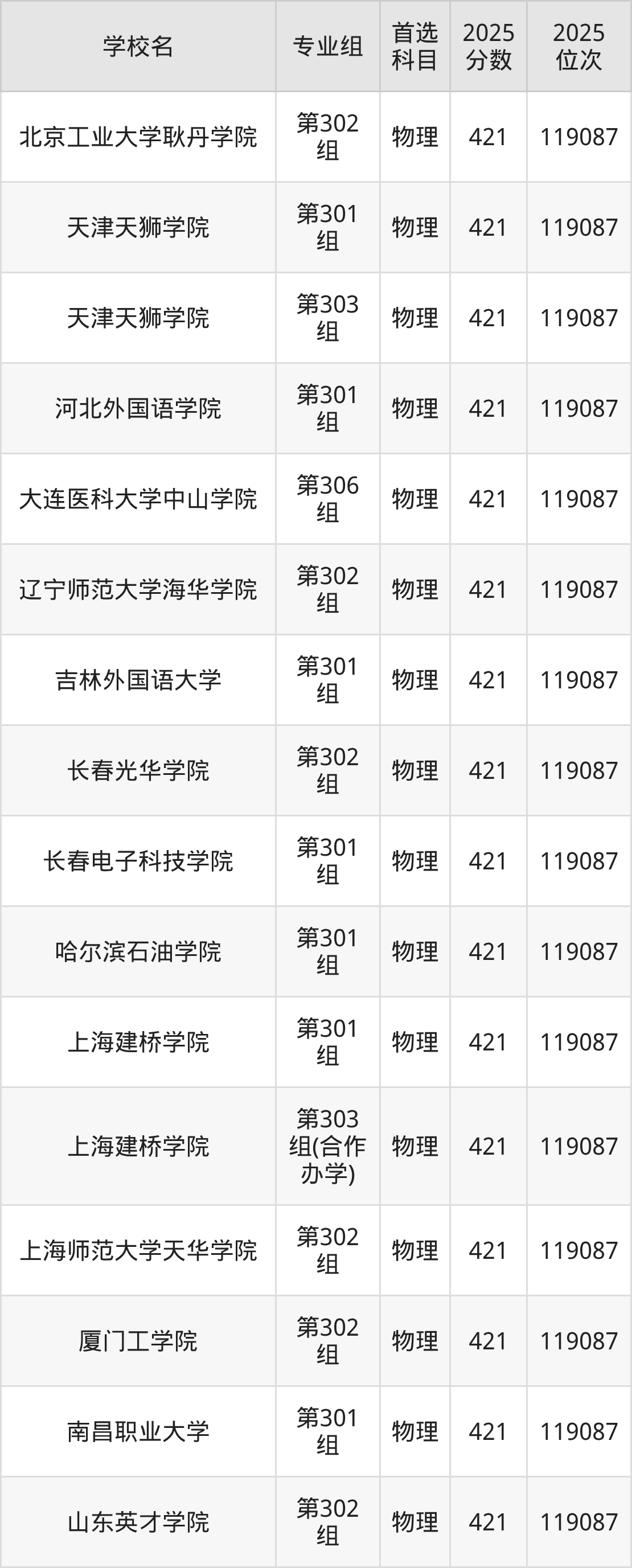 419分可以冲一冲的大学:北京工业大学耿丹学院421分、天津天狮学院421分、河北外国语学院421分、大连医科大学中山学院421分等;