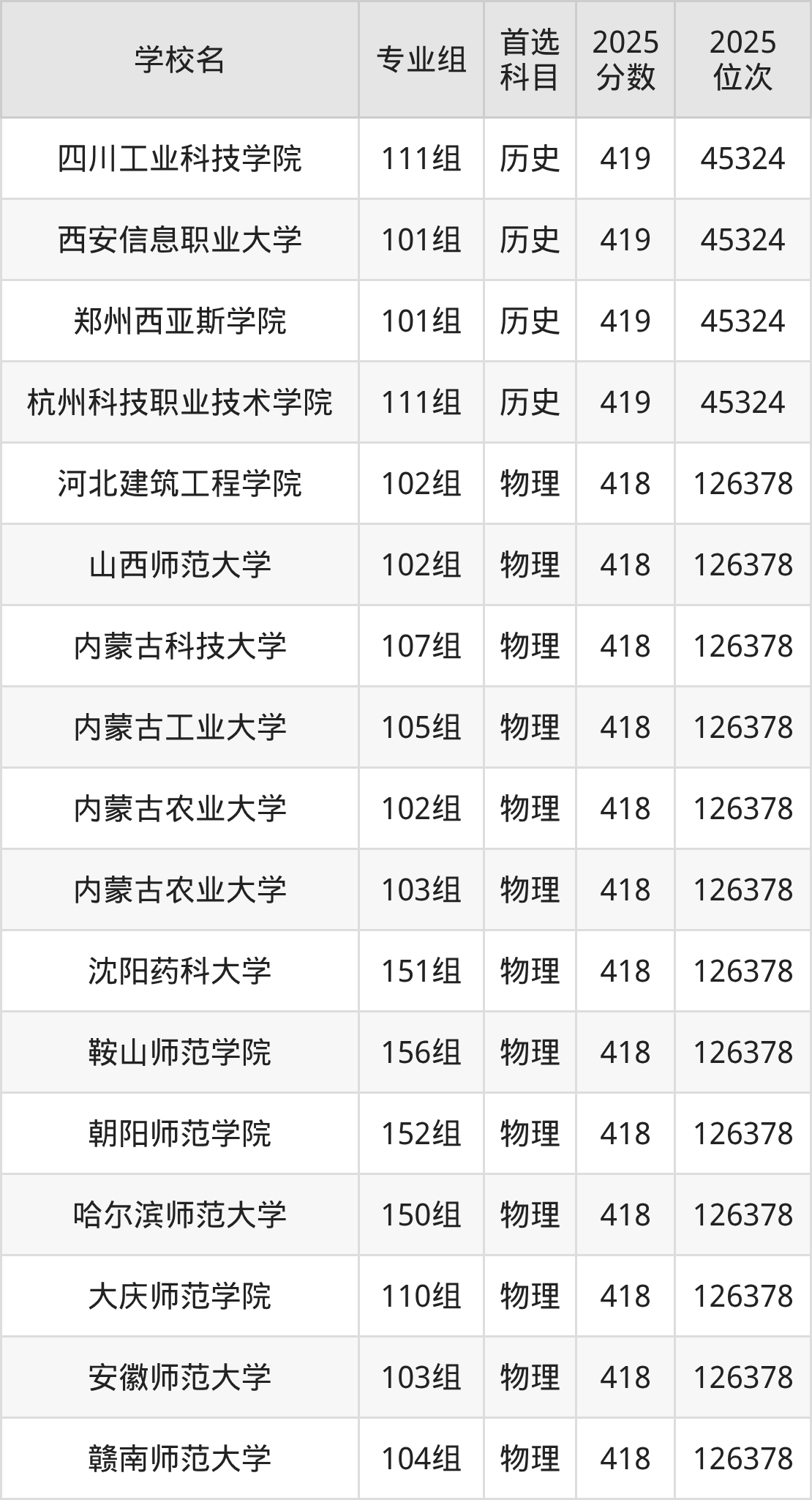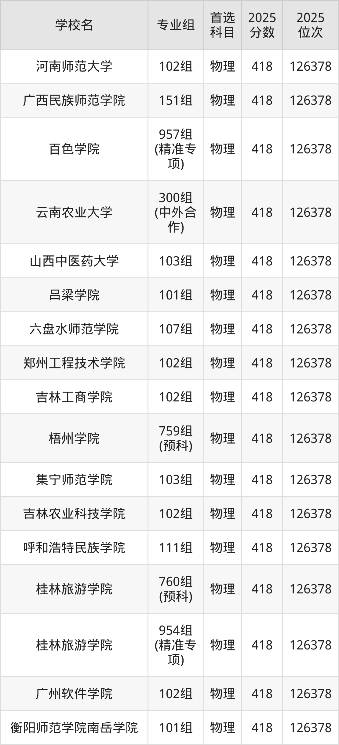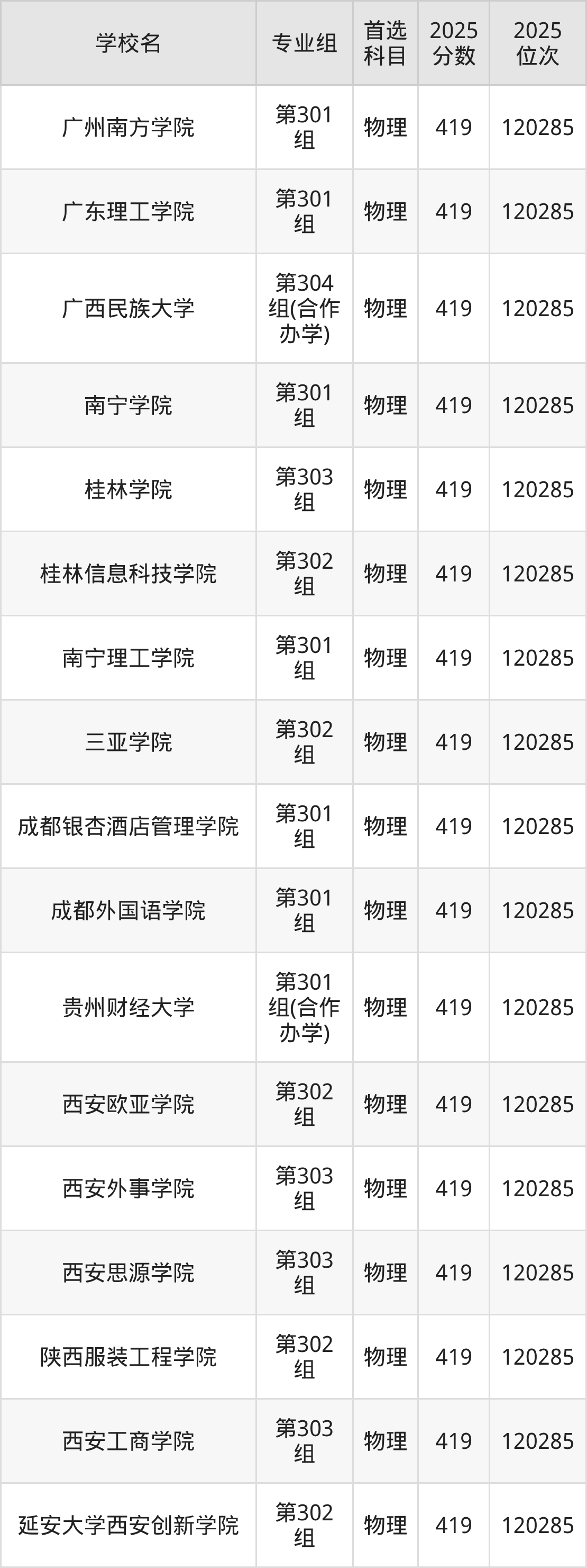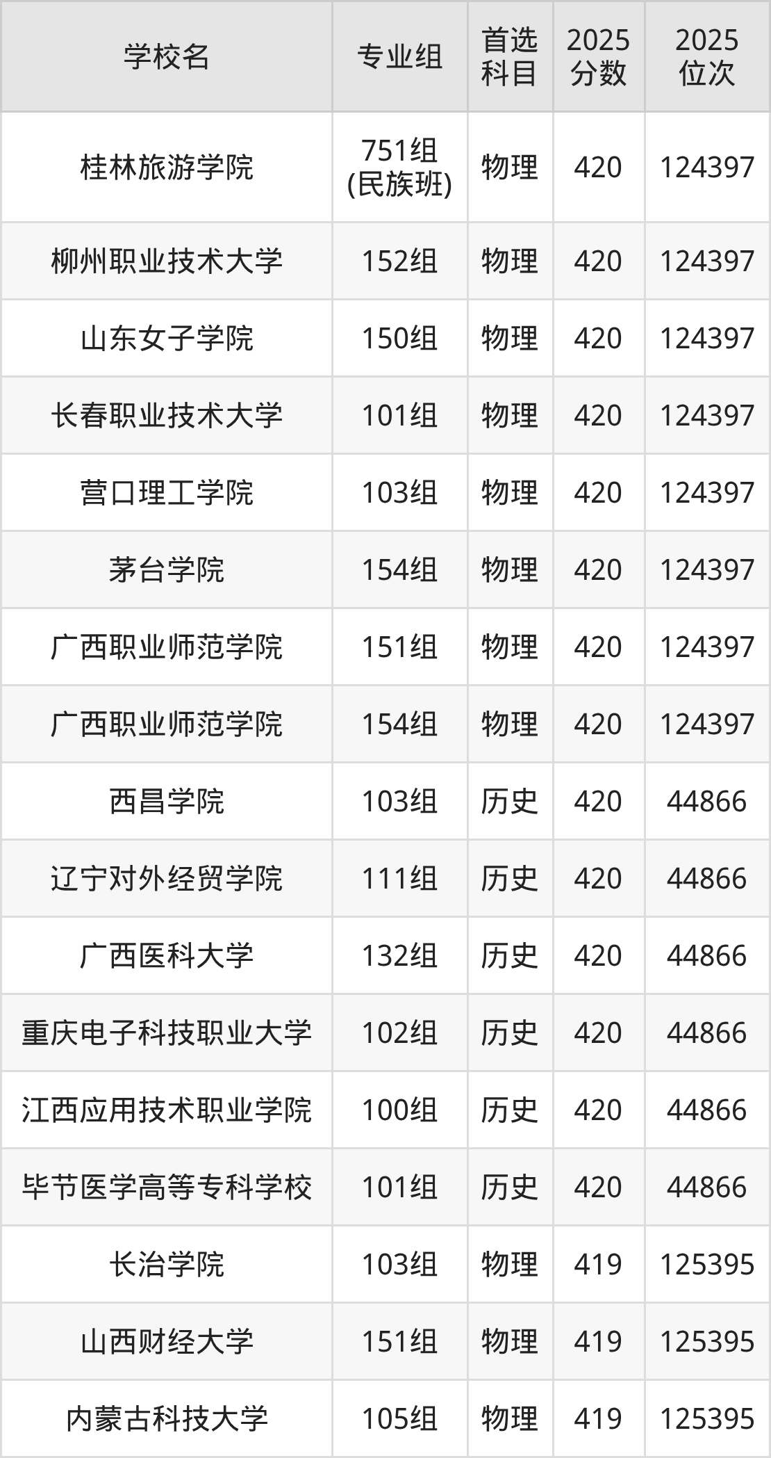 广西高考物理类419分对应的位次排名是125395名,历史类419分对应的位次排名是45324名,因此建议2026年位次排在这附近的同学考虑这些大学。