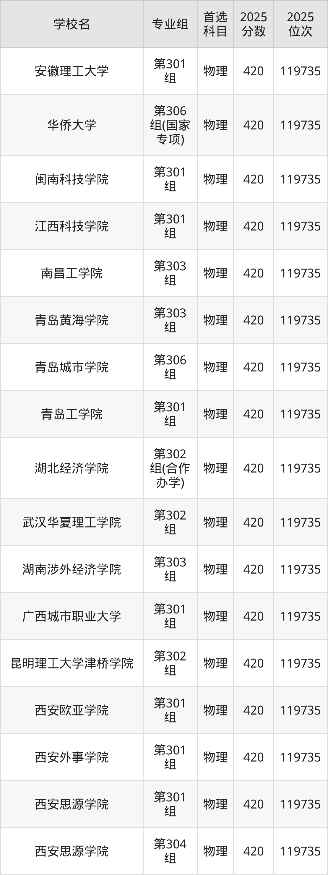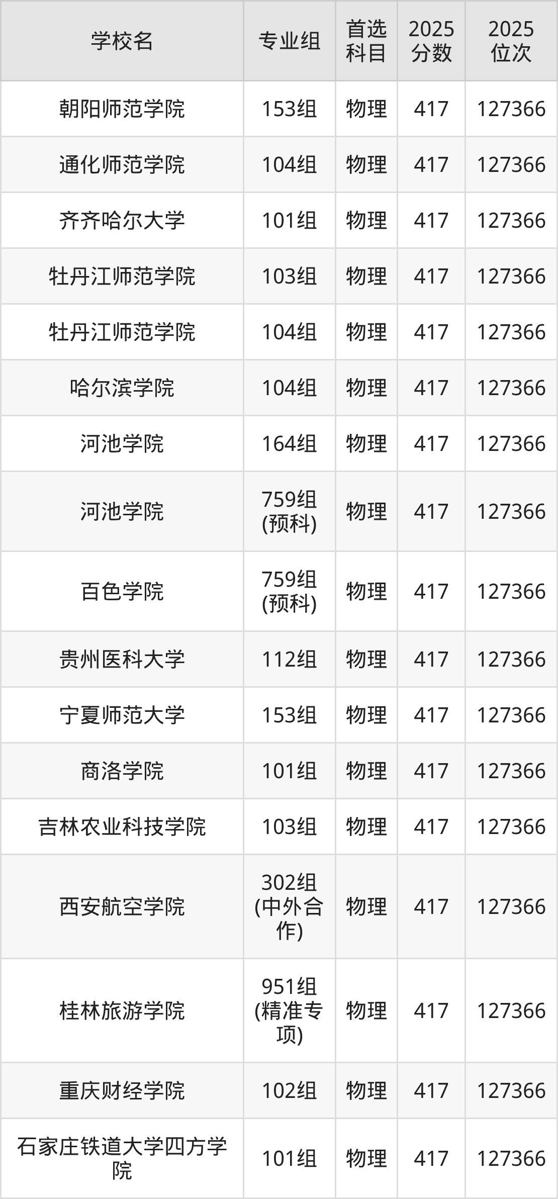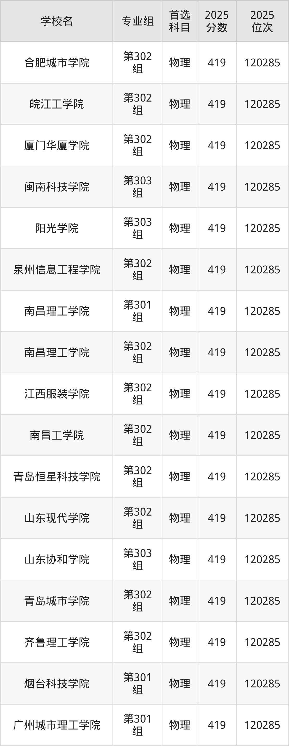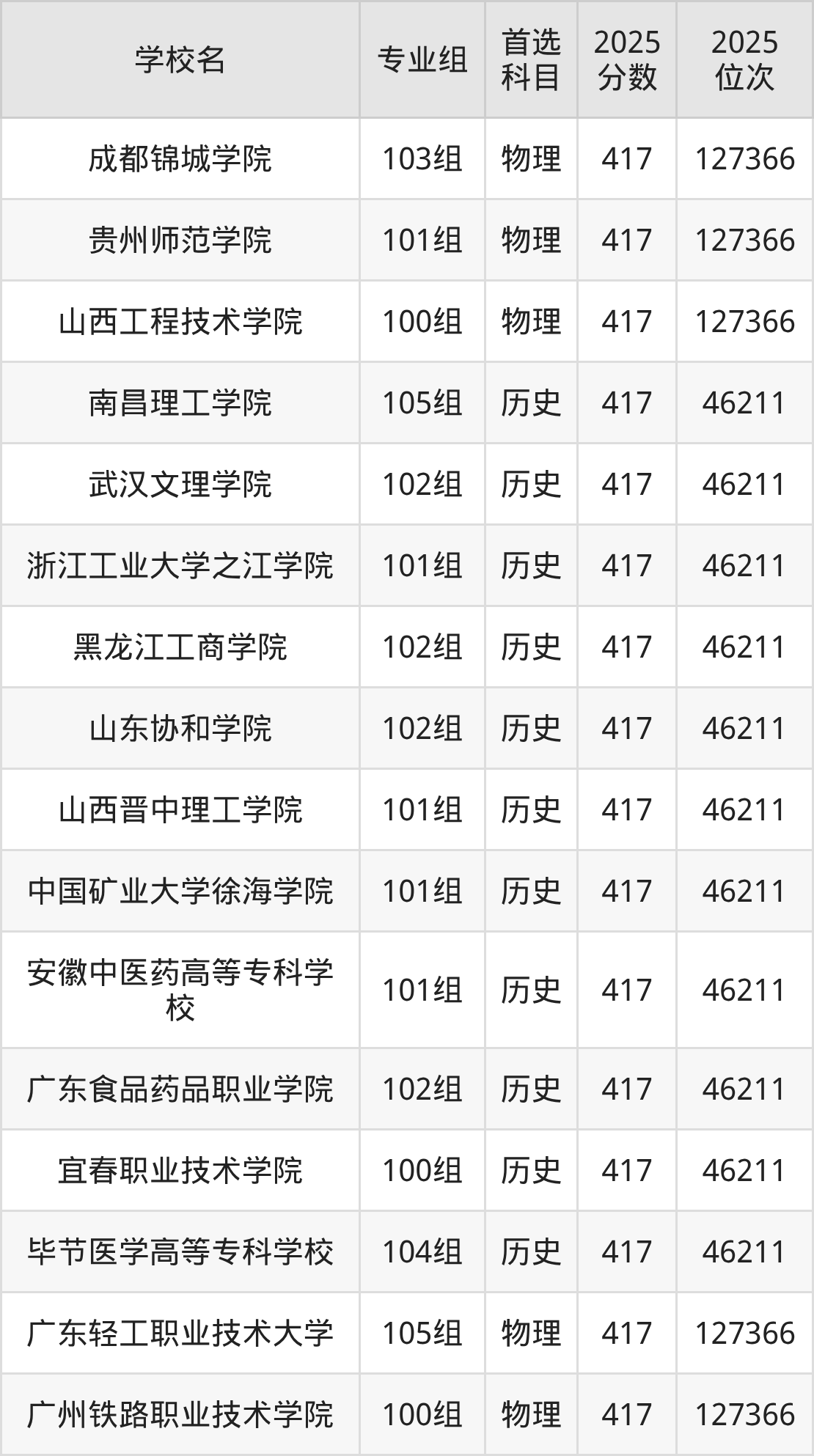 广西高考物理类419分对应的位次排名是125395名,历史类419分对应的位次排名是45324名,因此建议2026年位次排在这附近的同学考虑这些大学。