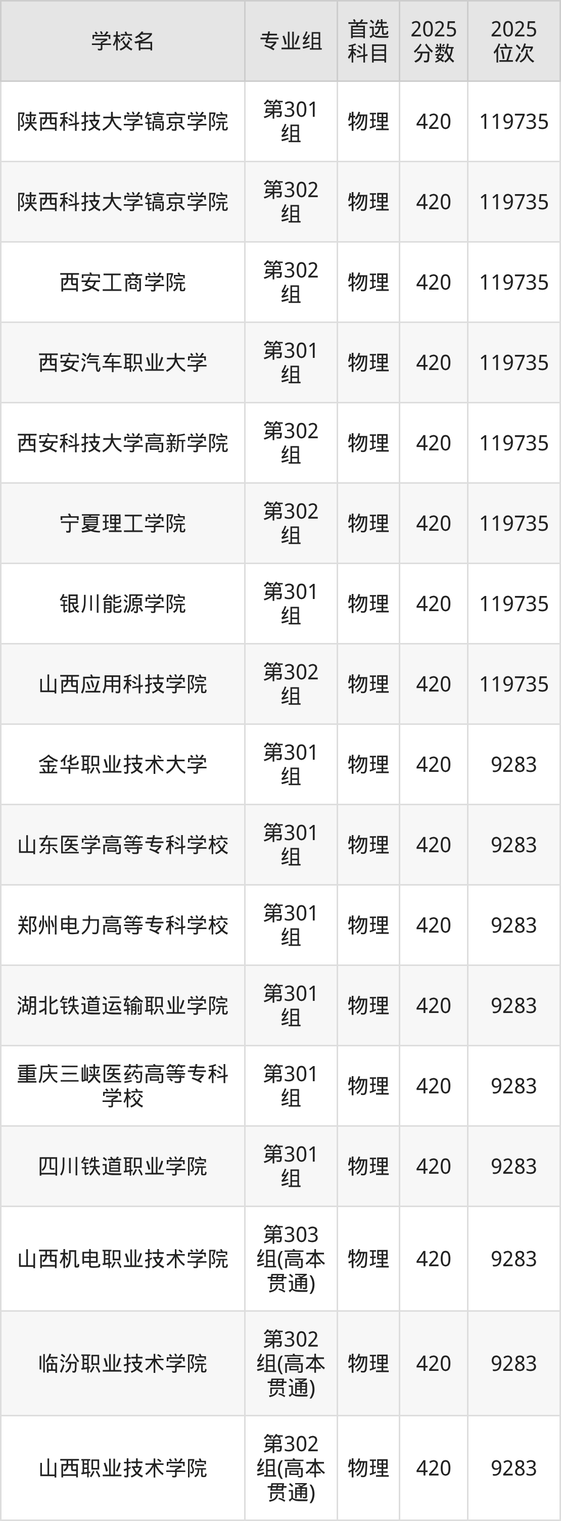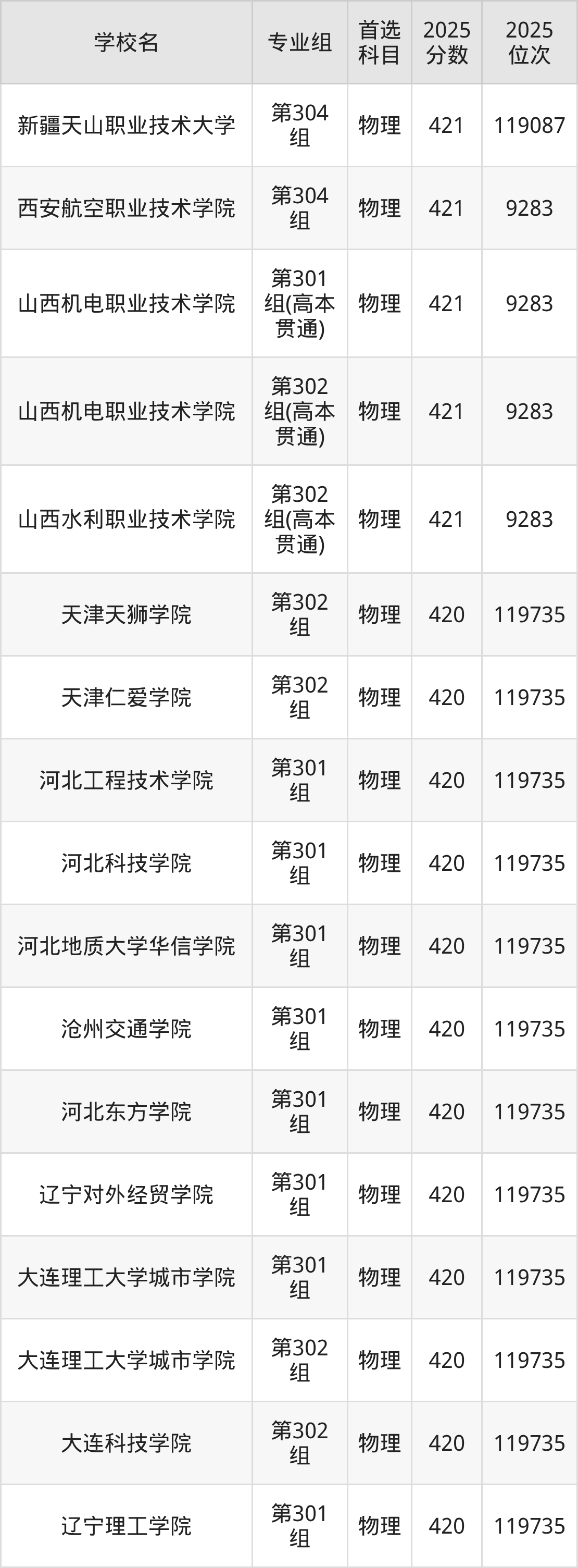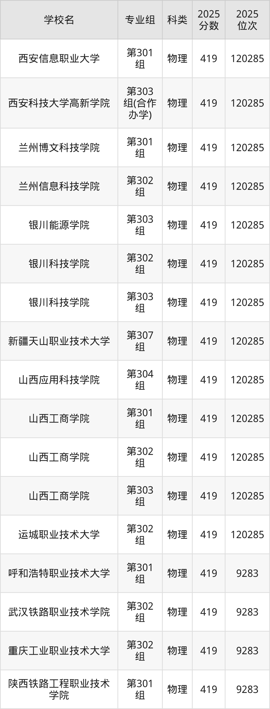 山西物理类419分对应的位次排名是9283名-120285名,因此建议2026年位次排在这附近的考生考虑这些大学。