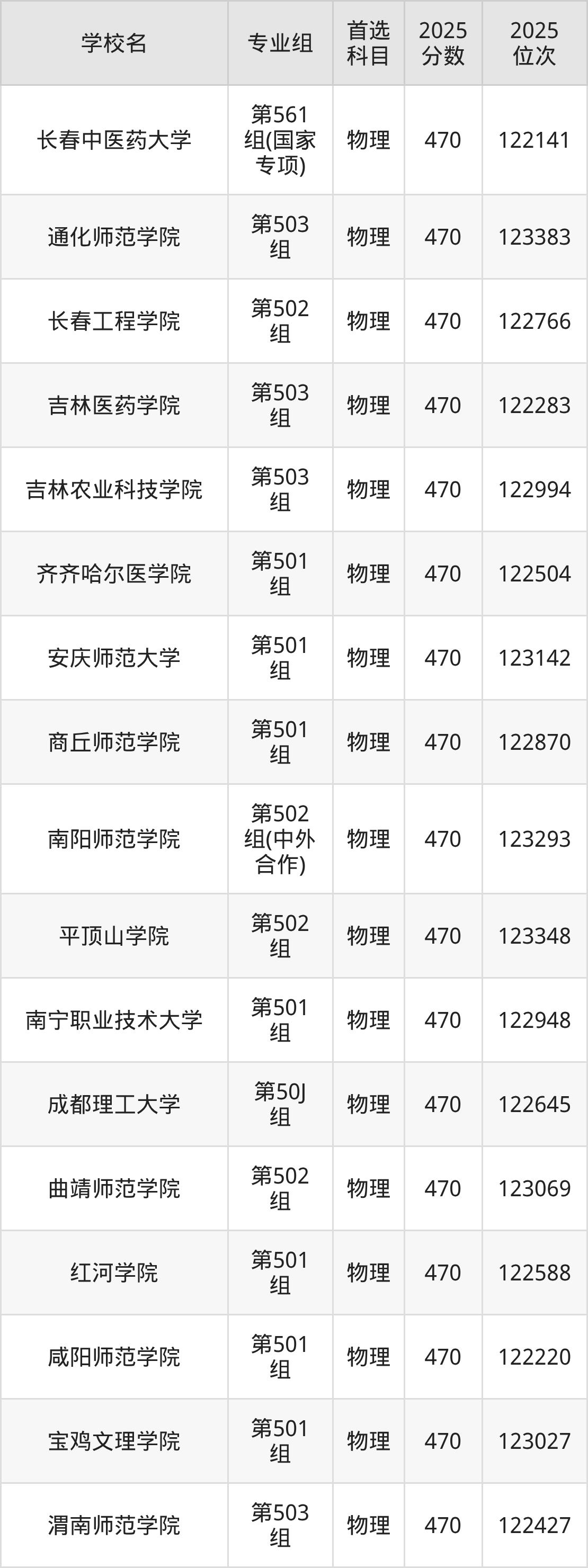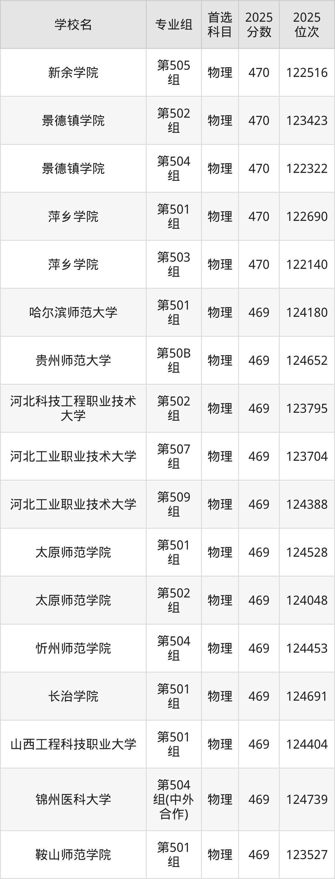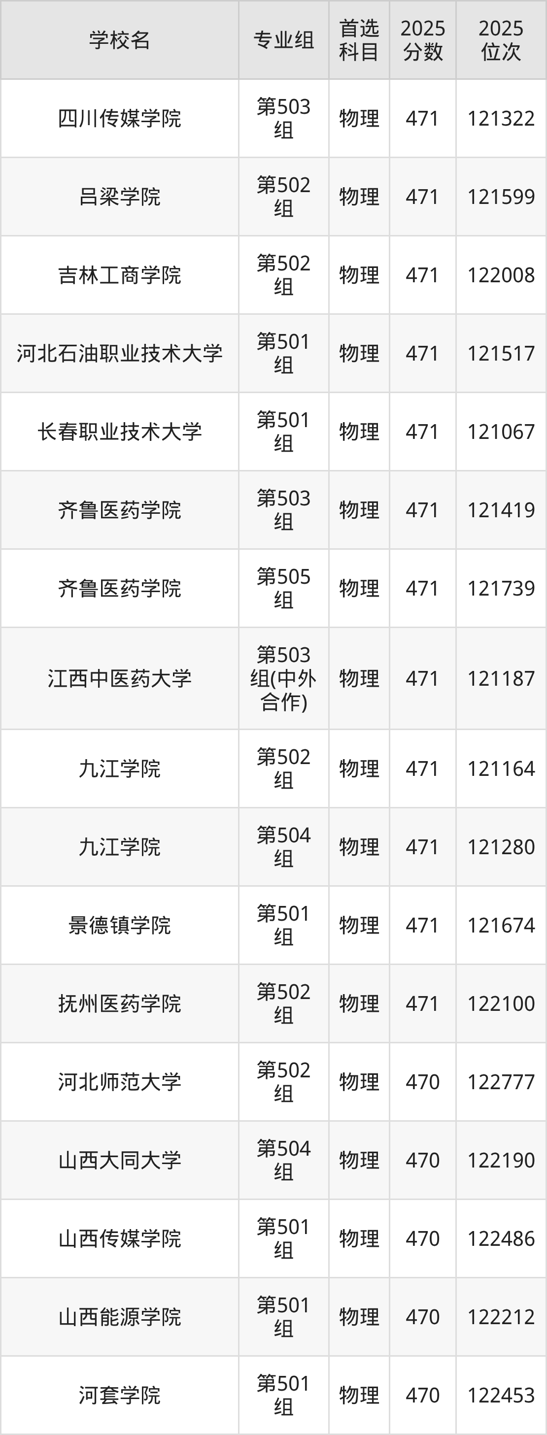 江西物理类470分对应的位次排名是122126名-123423名,因此建议2026年位次排在这附近的考生考虑这些大学。