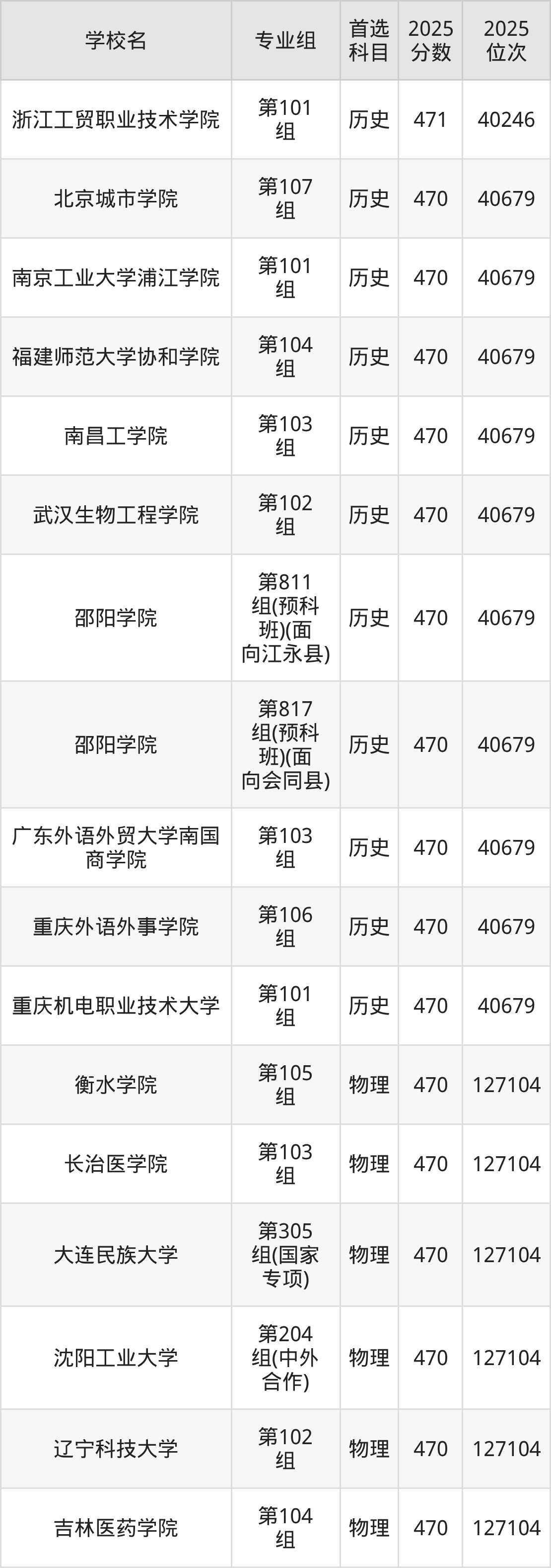 2025年在湖南高考历史类录取分数线是470分的大学有北京城市学院、南京工业大学浦江学院、福建师范大学协和学院、南昌工学院、武汉生物工程学院、邵阳学院、广东外语外贸大学南国商学院、重庆外语外事学院、重庆机电职业技术大学。物理类录取分数线是470分的大学有衡水学院、长治医学院、大连民族大学、沈阳工业大学、辽宁科技大学、吉林医药学院、丽水学院、闽南师范大学、泉州师范学院、新余学院等。