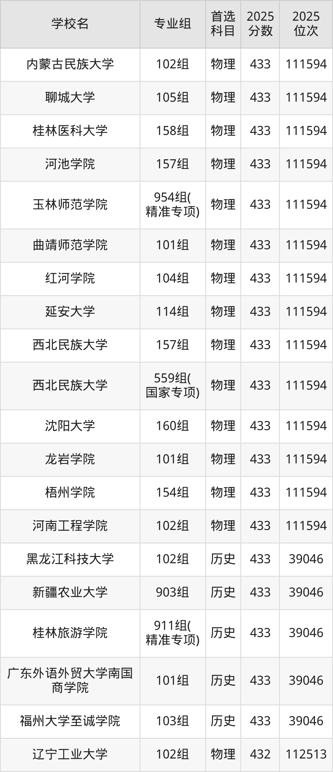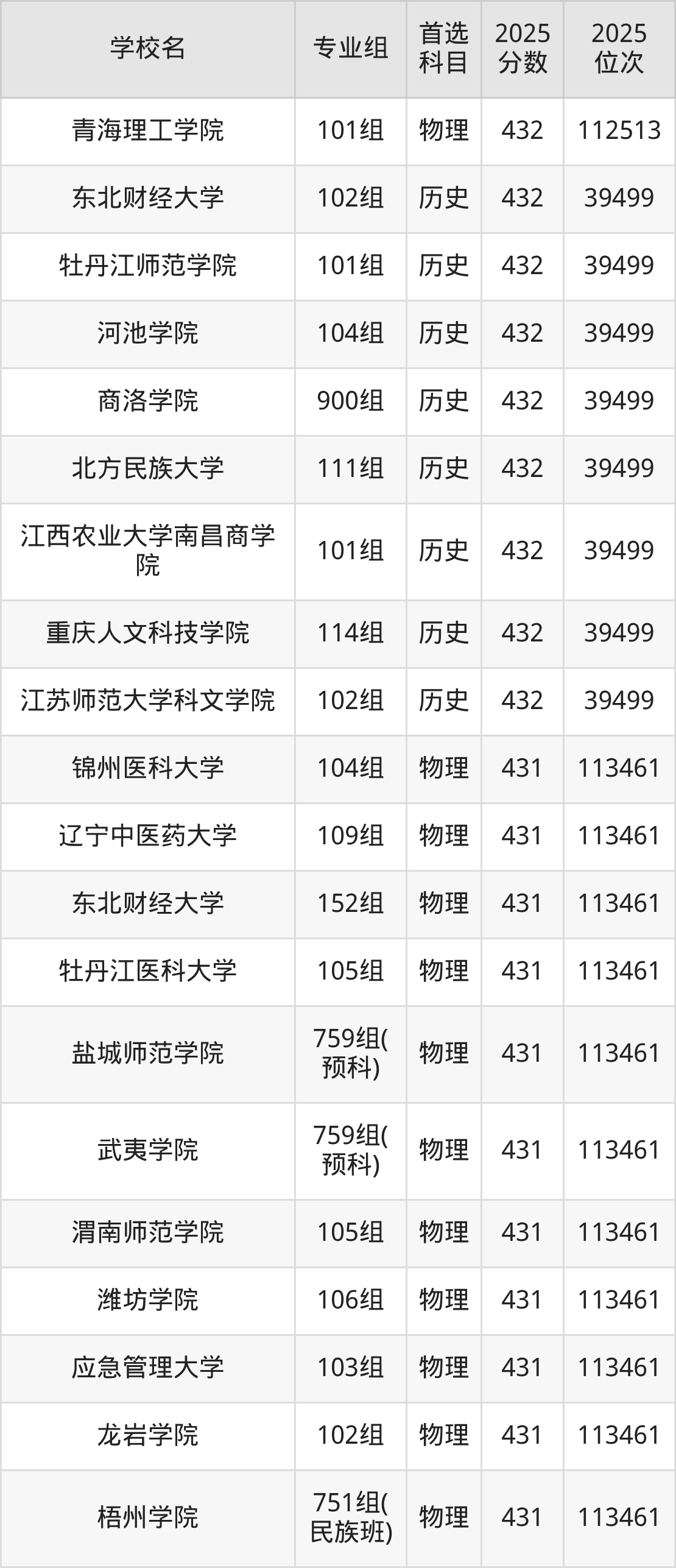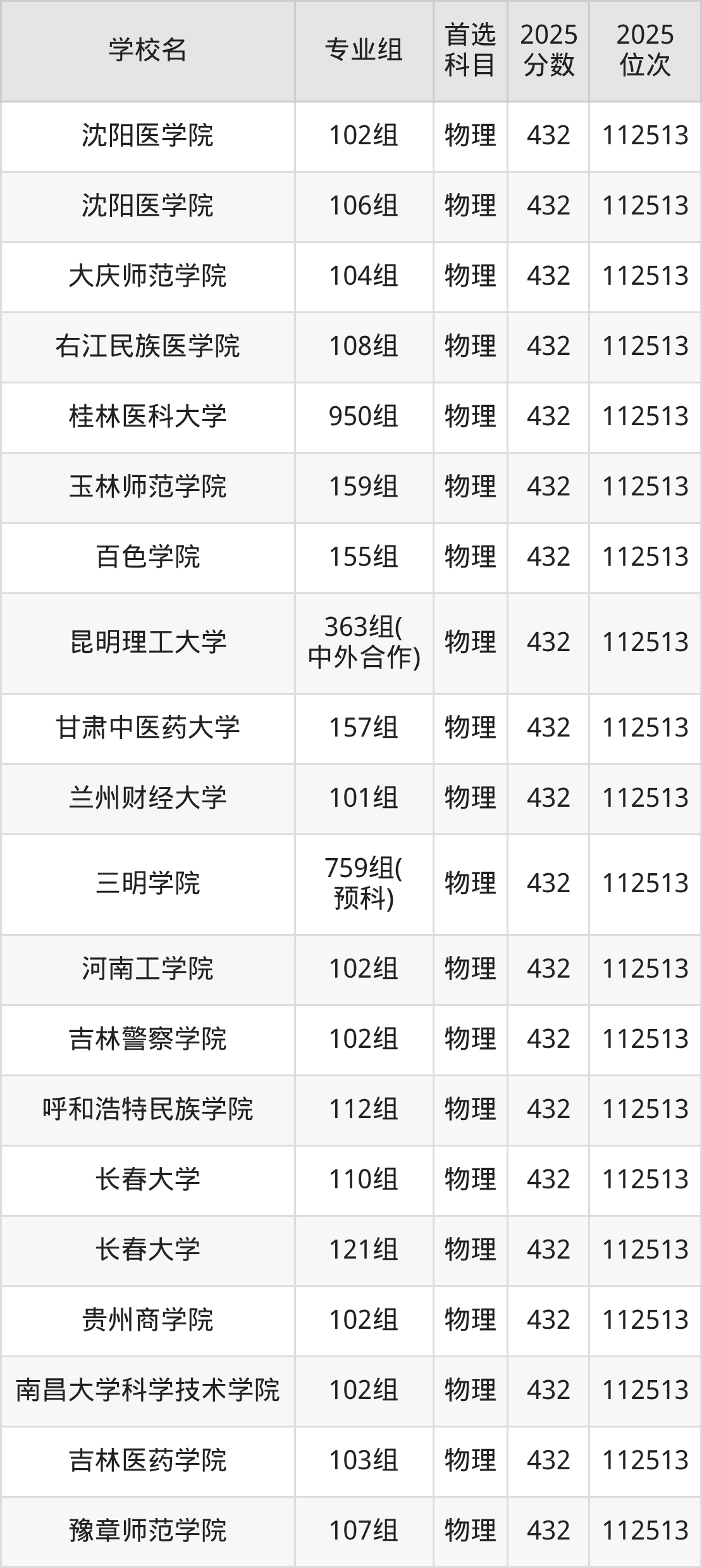 广西高考物理类432分对应的位次排名是112513名,历史类432分对应的位次排名是39499名,因此建议2026年位次排在这附近的同学考虑这些大学。