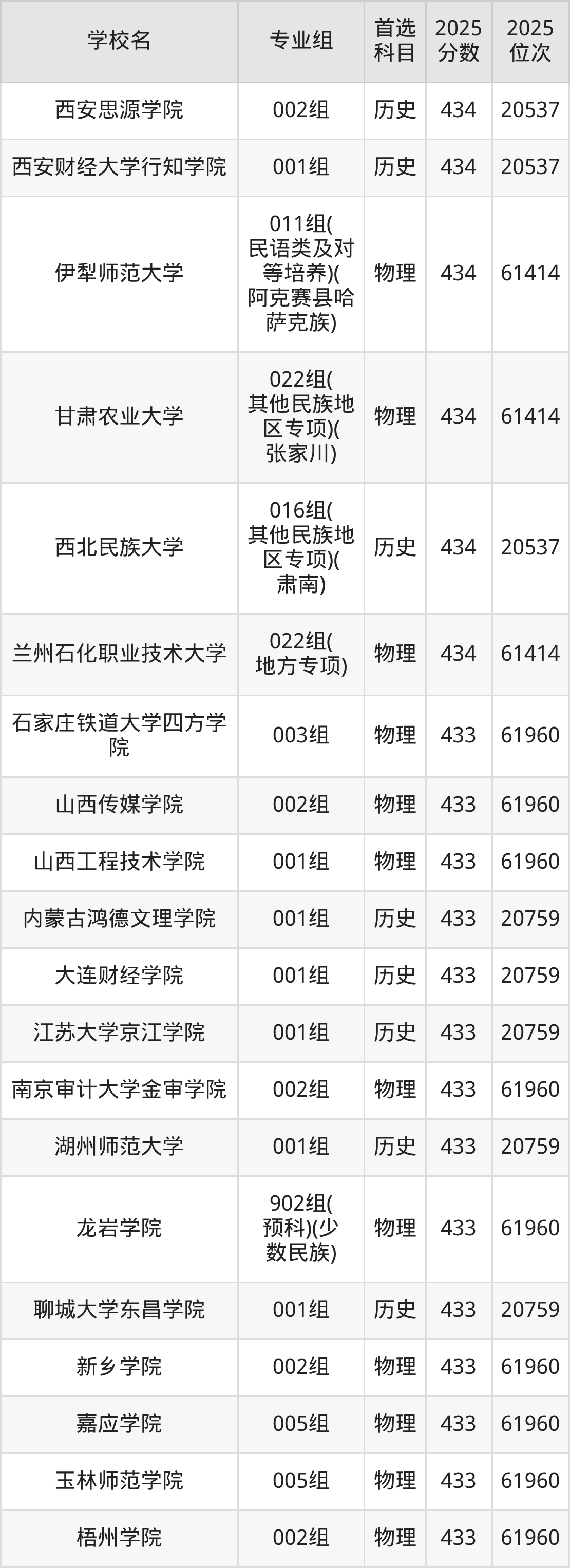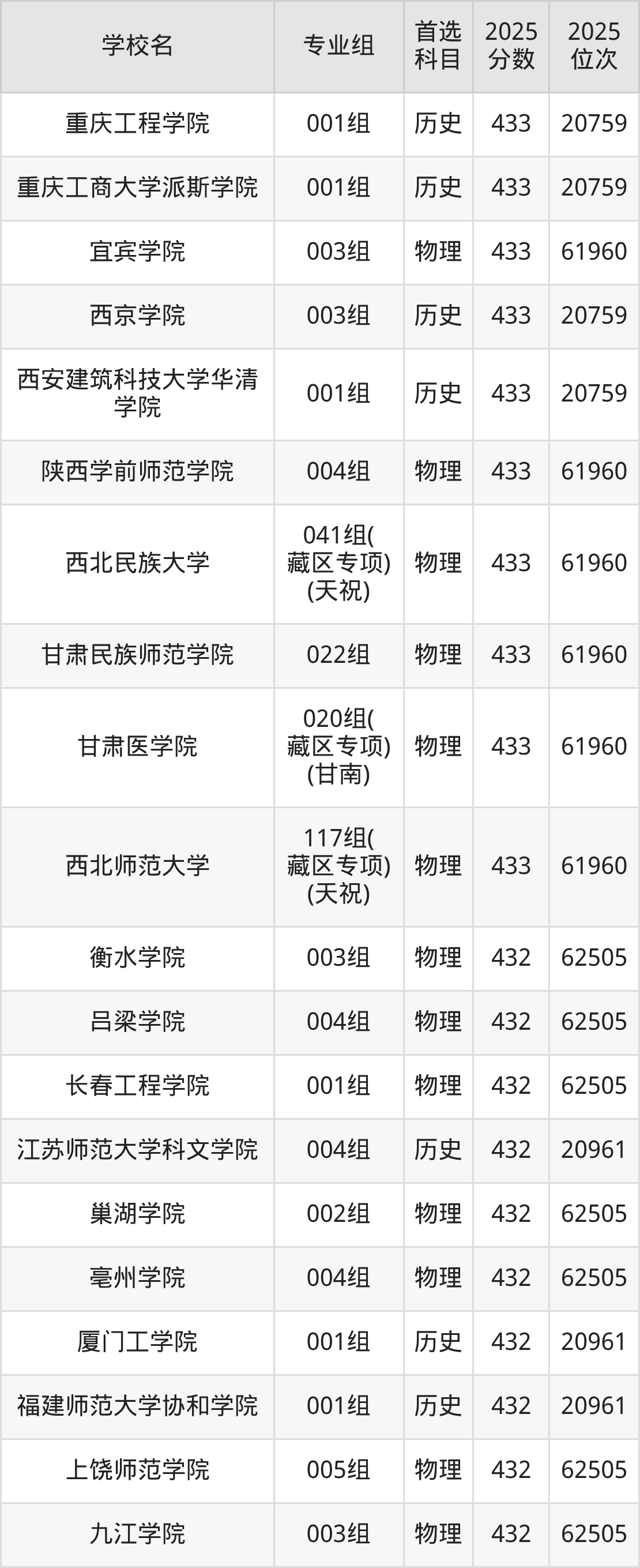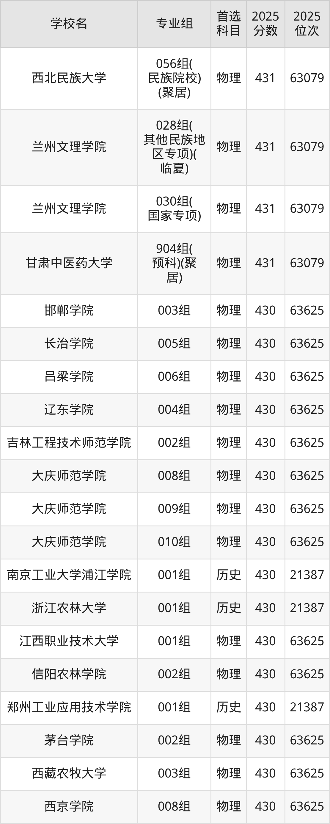2025年在甘肃高考物理类录取分数线是432分的大学有衡水学院、吕梁学院、长春工程学院、巢湖学院、亳州学院、上饶师范学院、九江学院、西华大学、电子科技大学成都学院、四川传媒学院等。历史类录取分数线是432分的大学有江苏师范大学科文学院、厦门工学院、福建师范大学协和学院、郑州航空工业管理学院、武汉工程科技学院、河西学院、兰州财经大学、甘肃民族师范学院、兰州文理学院、陇南师范学院。