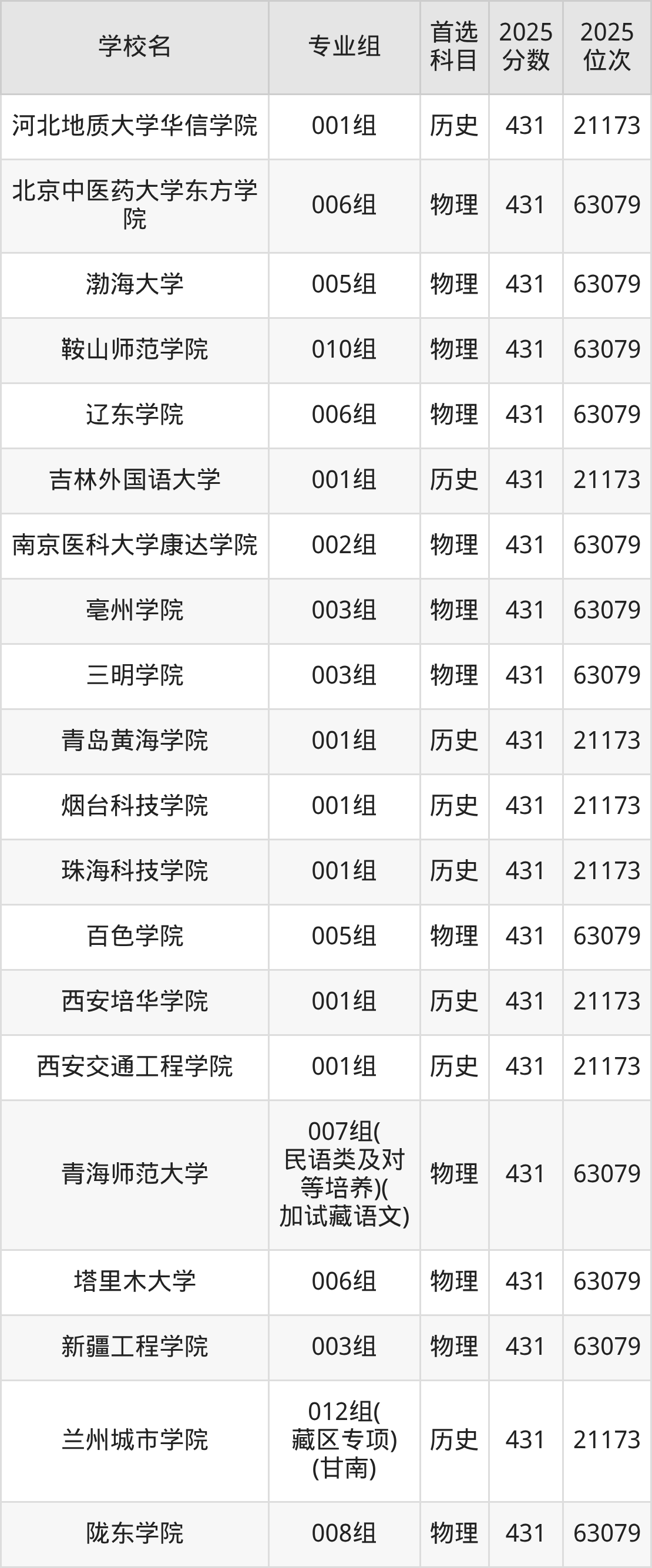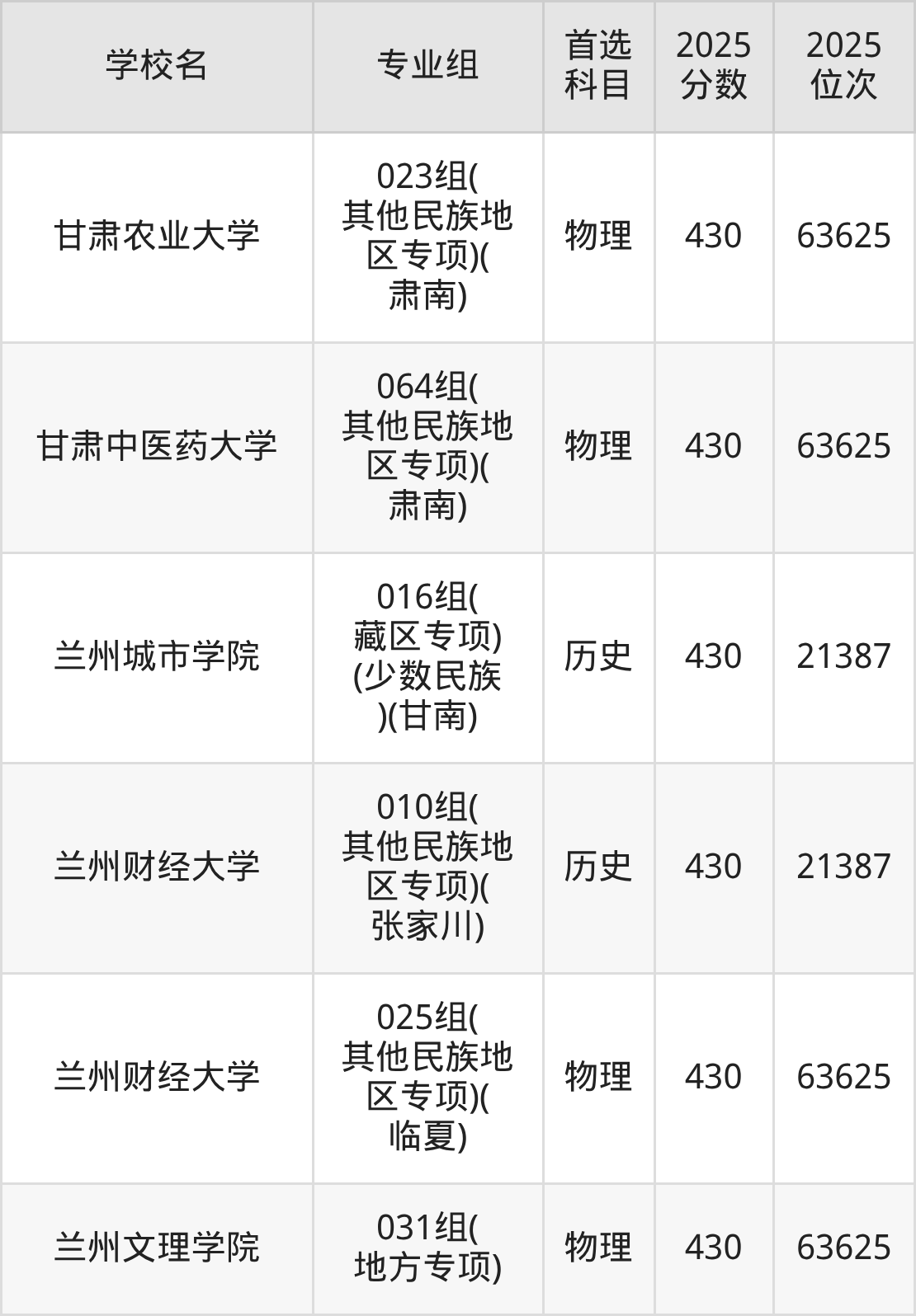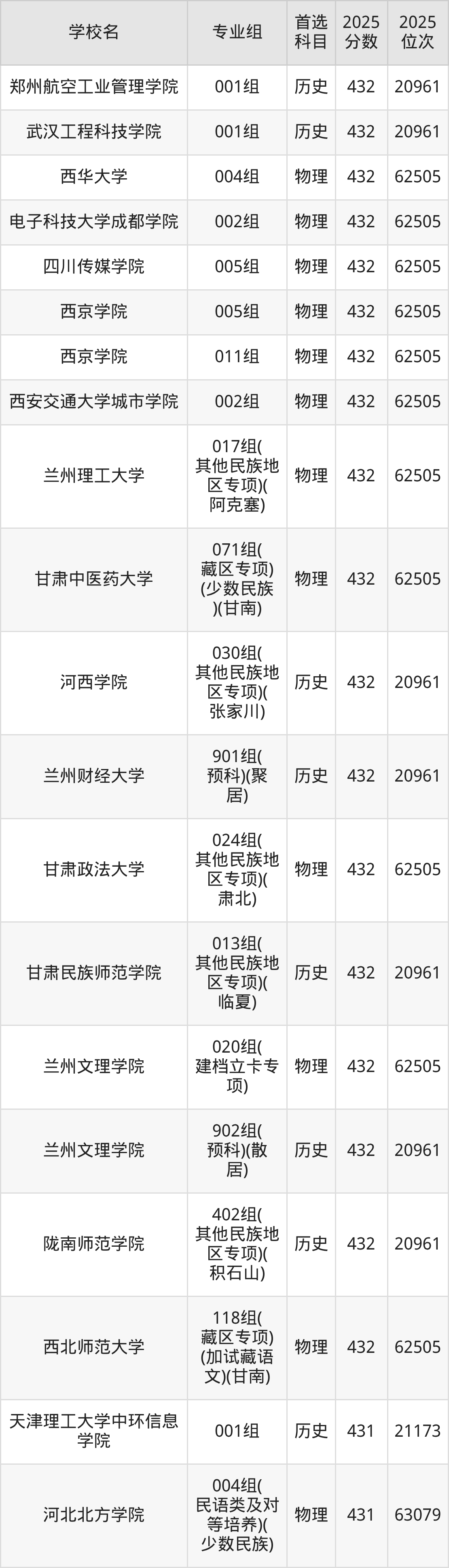 甘肃高考物理类432分对应的位次排名是62505名,历史类432分对应的位次排名是20961名,因此建议2026年位次排在这附近的同学考虑这些大学。
