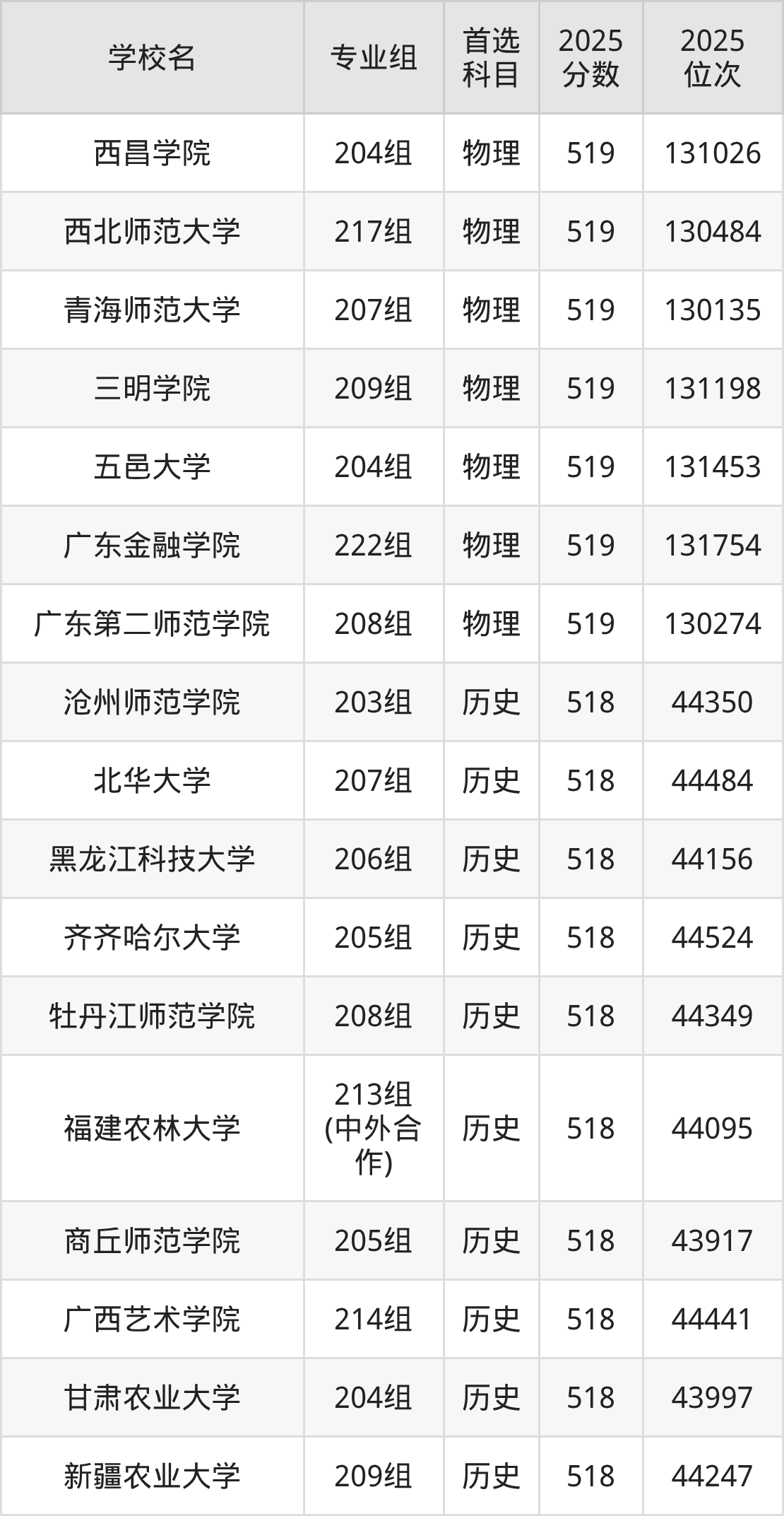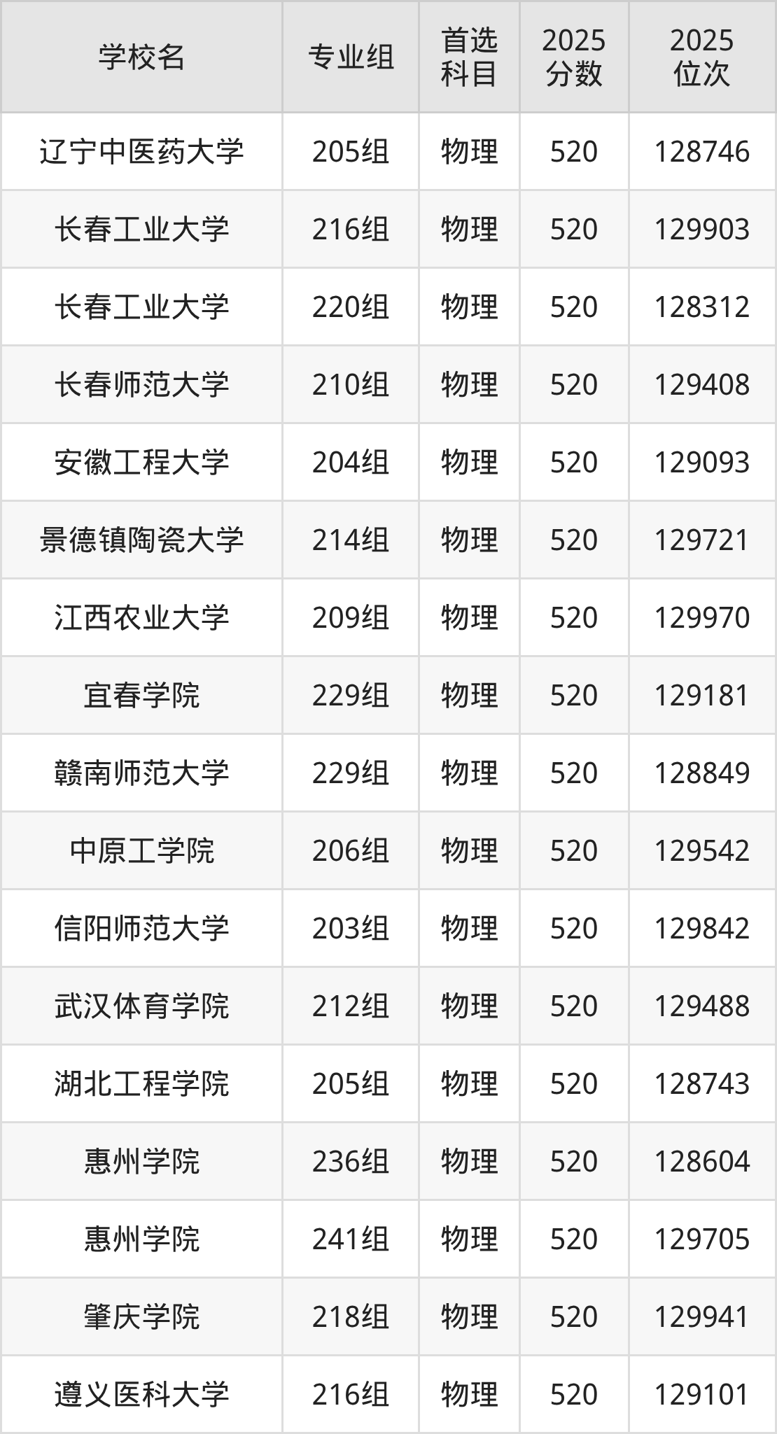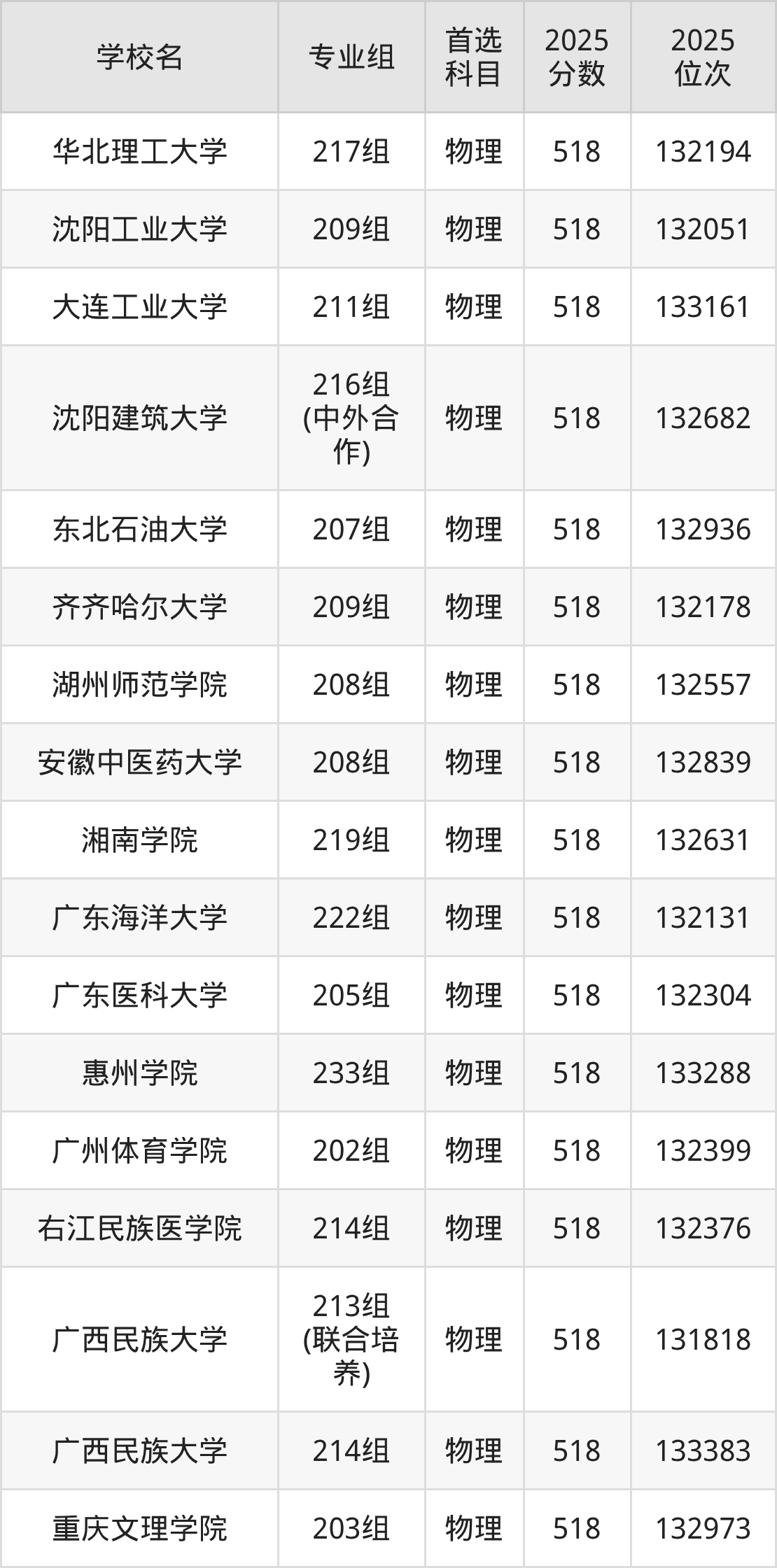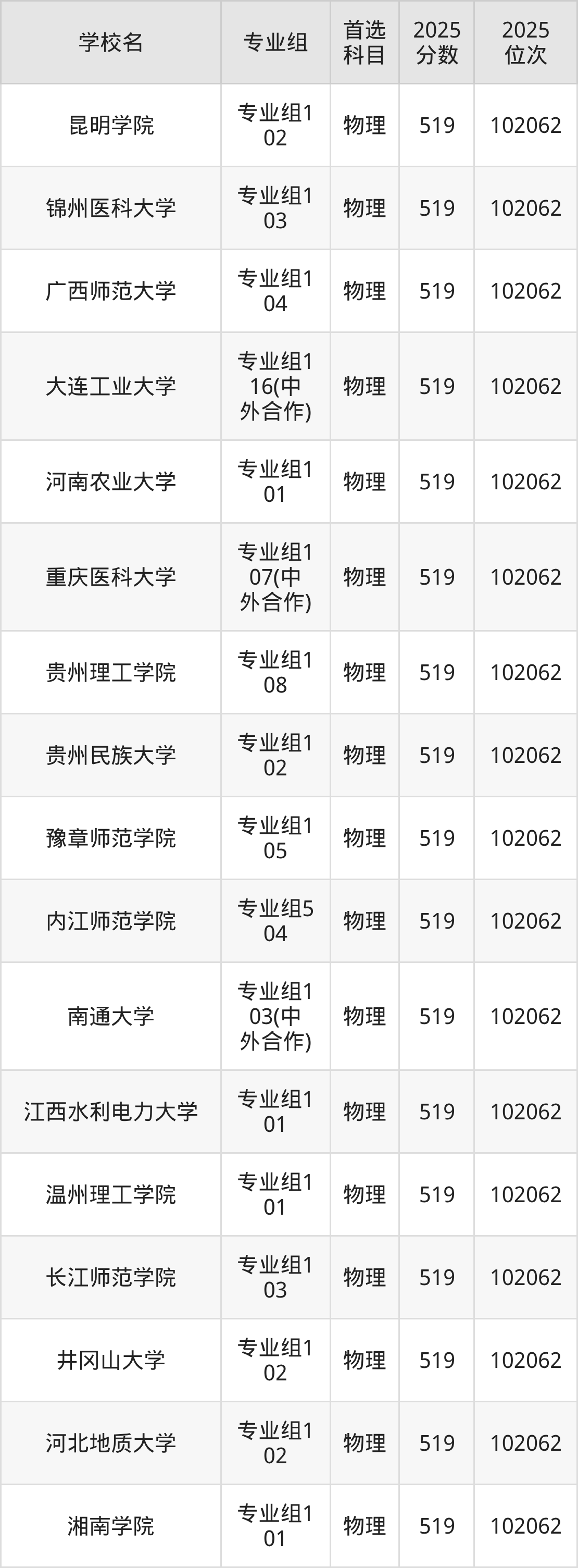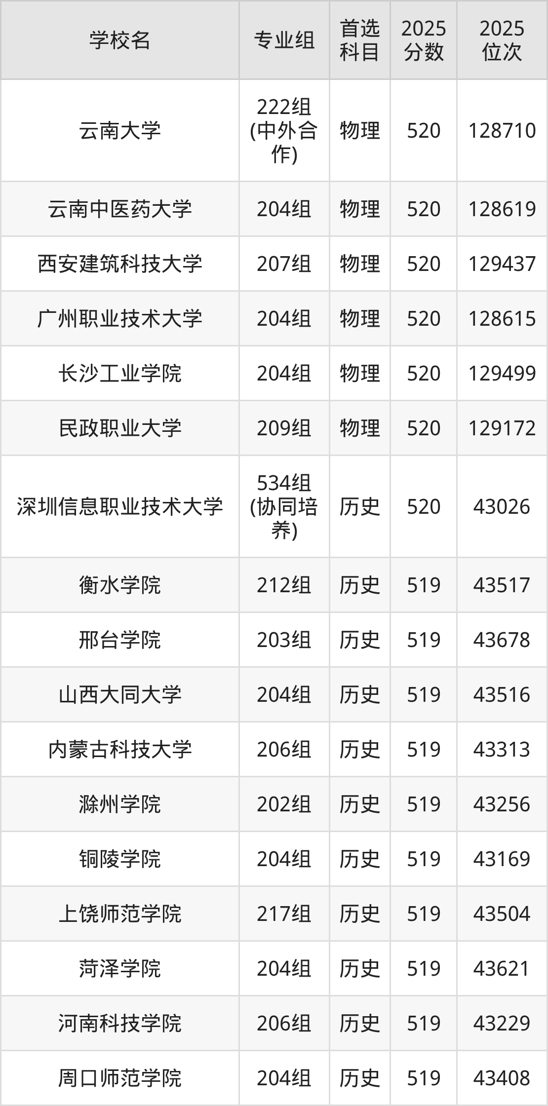广东高考物理类519分对应的位次排名是130054名-131754名,历史类519分对应的位次排名是43139名-43827名,因此建议2026年位次排在这附近的同学考虑这些大学。