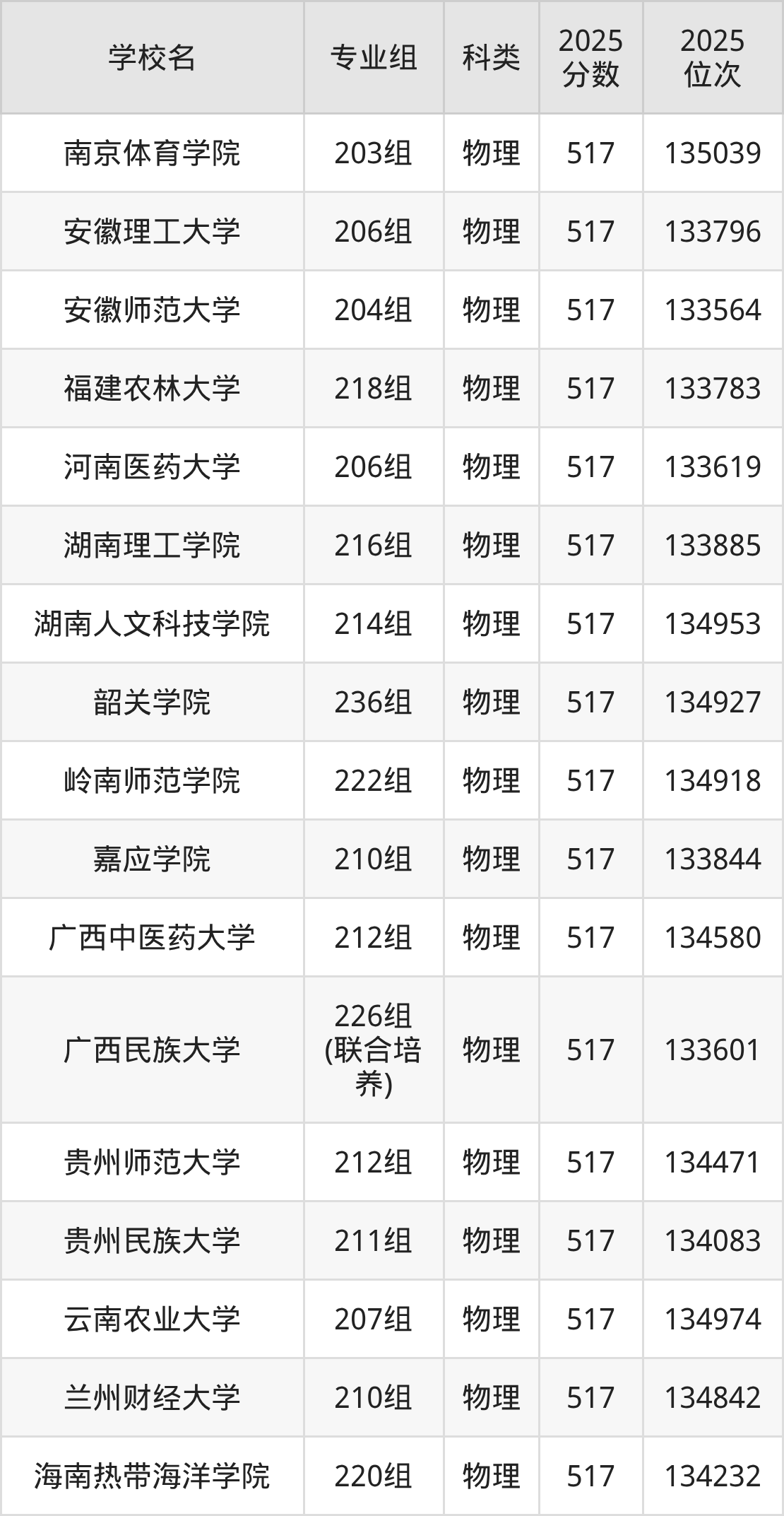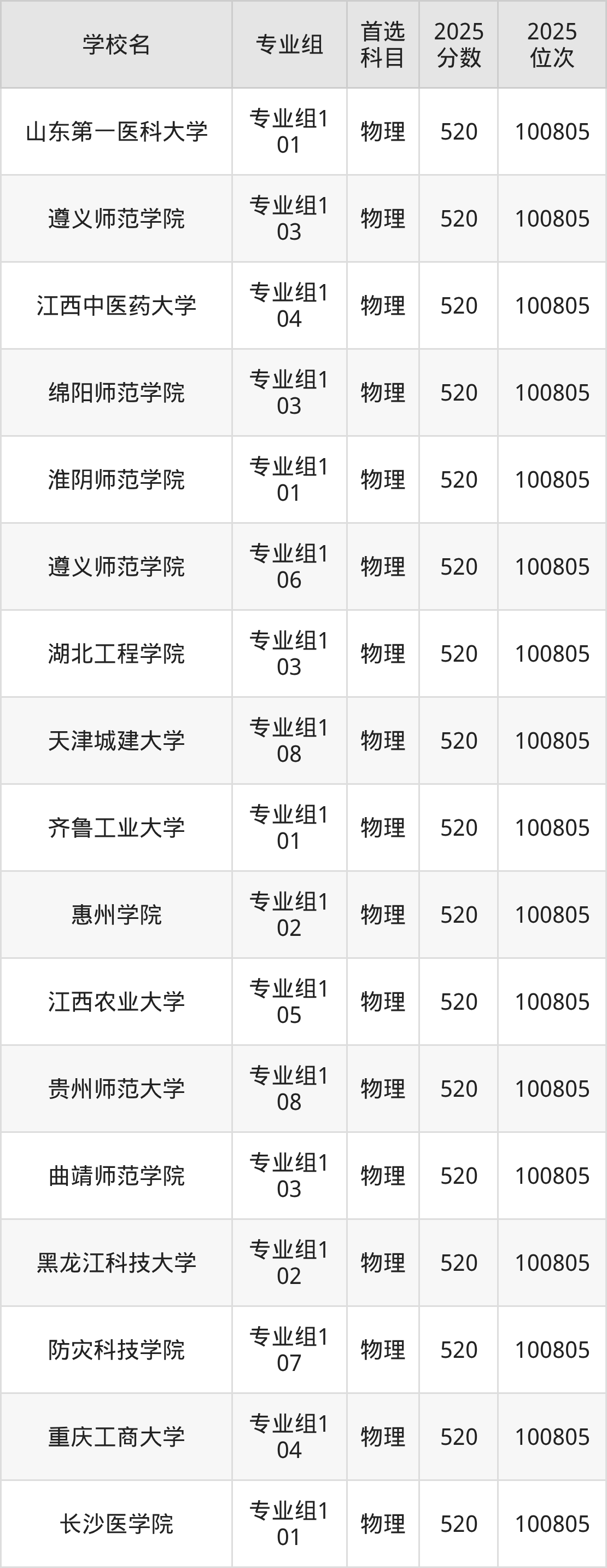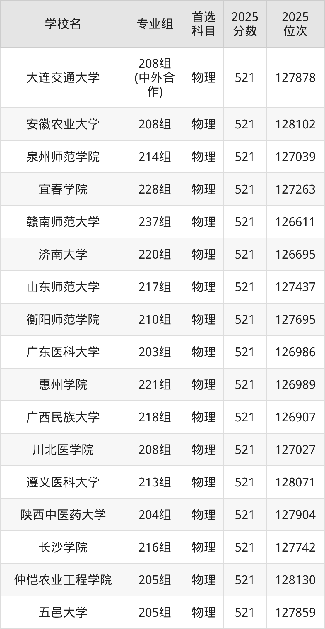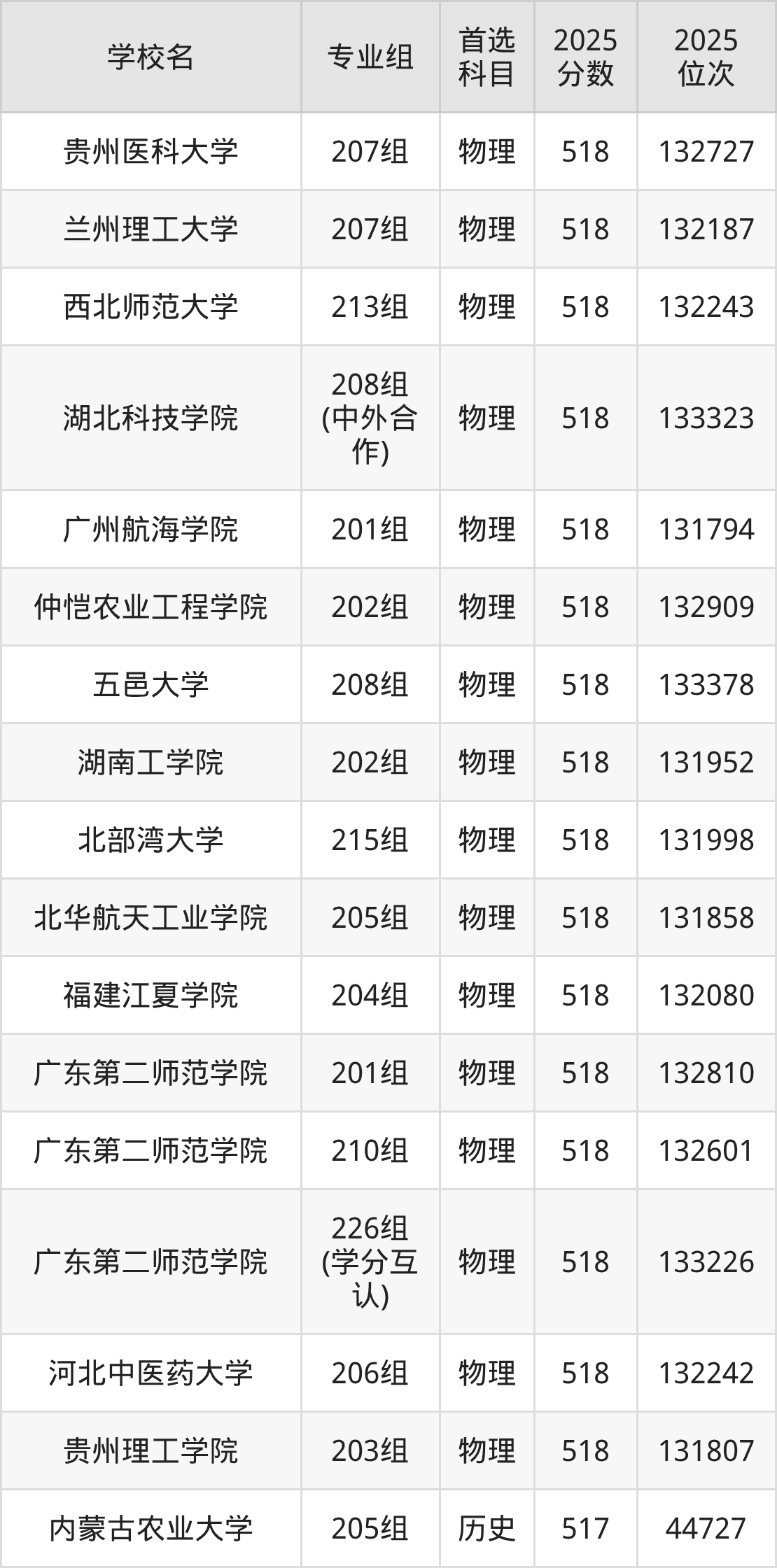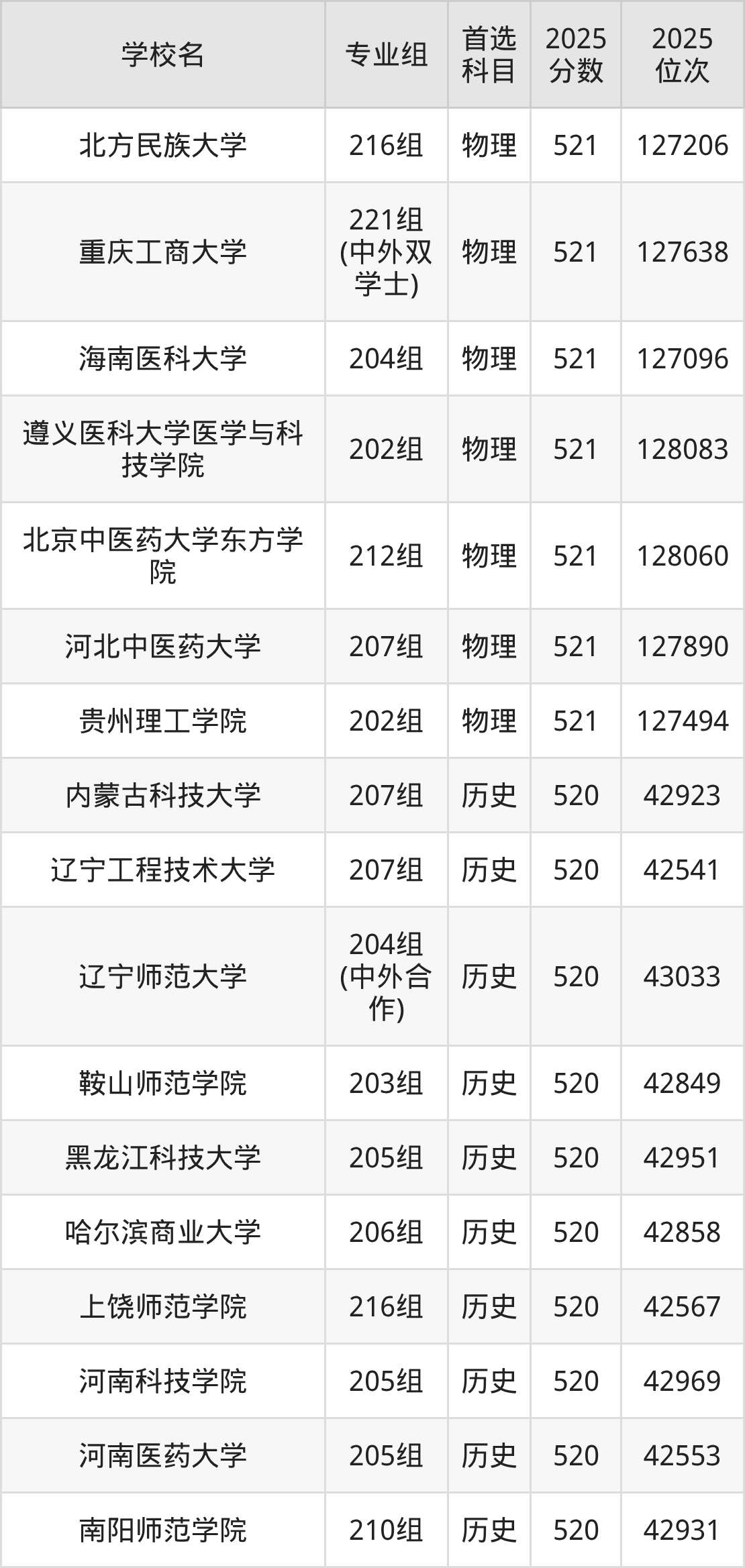 广东高考物理类519分对应的位次排名是130054名-131754名,历史类519分对应的位次排名是43139名-43827名,因此建议2026年位次排在这附近的同学考虑这些大学。