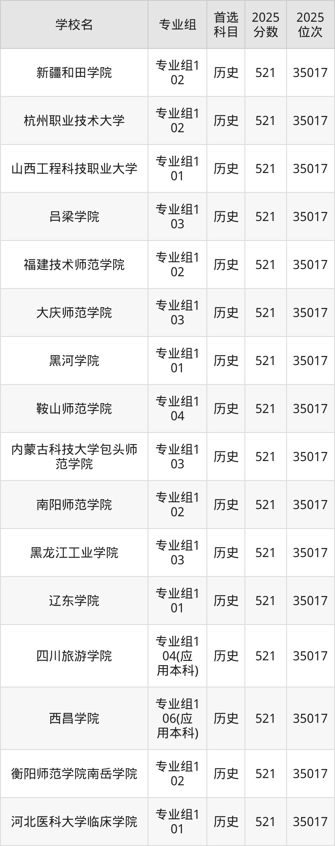 历史类519分可以冲的大学:新疆和田学院521分、杭州职业技术大学521分、山西工程科技职业大学521分、吕梁学院521分等;较稳妥的大学:河北工业职业技术大学518分、南宁职业技术大学518分、成都锦城学院518分、西藏农牧大学518分等。
