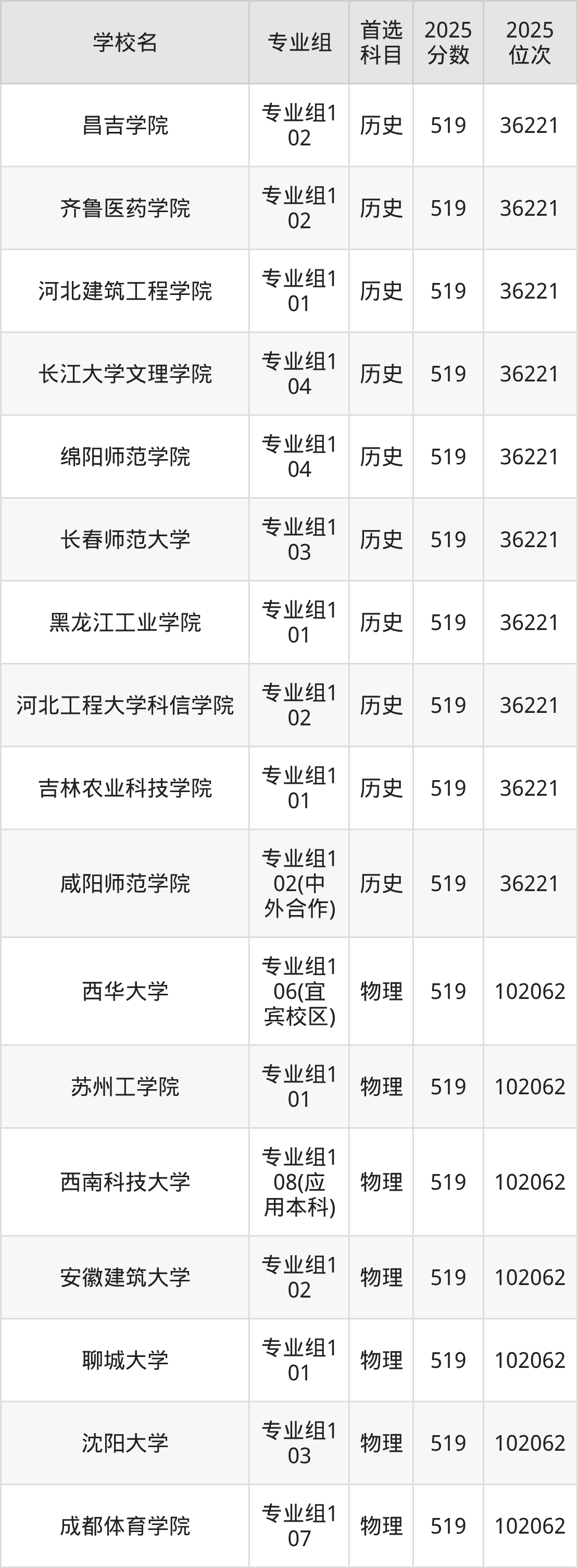四川高考历史类519分对应的位次排名是36221名,物理类519分对应的位次排名是102062名,因此建议2026年位次排在这附近的同学考虑这些大学。
