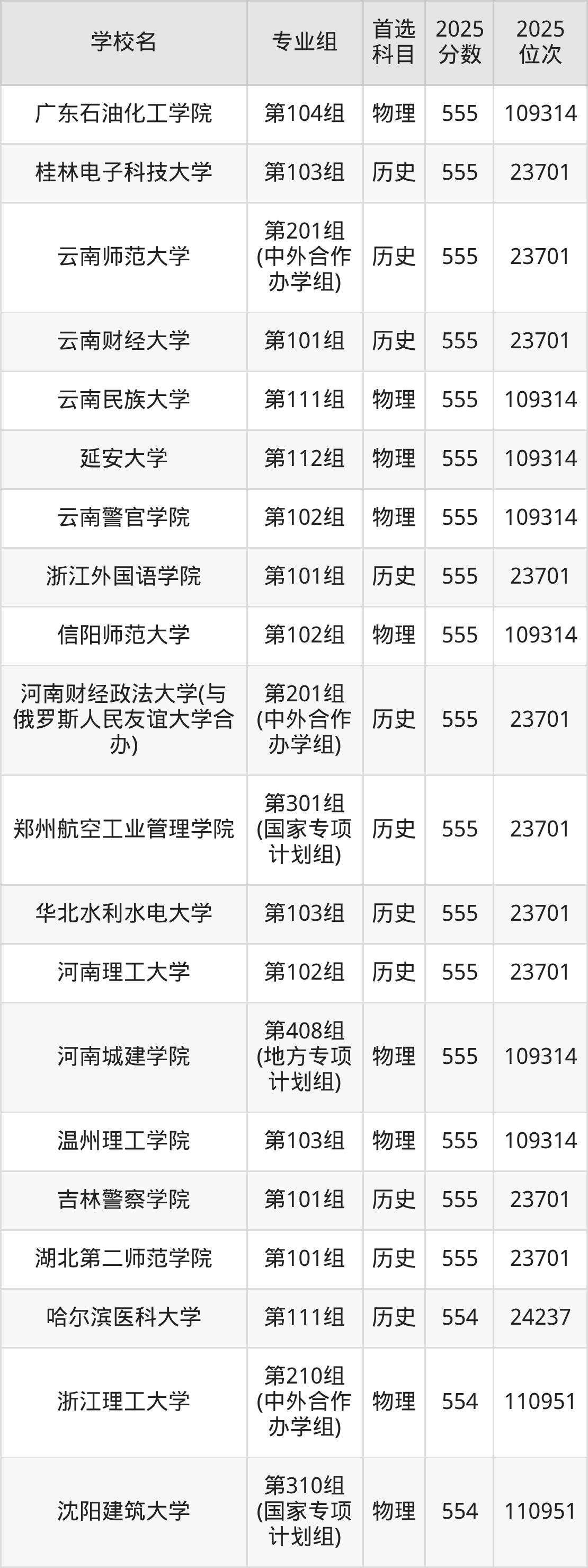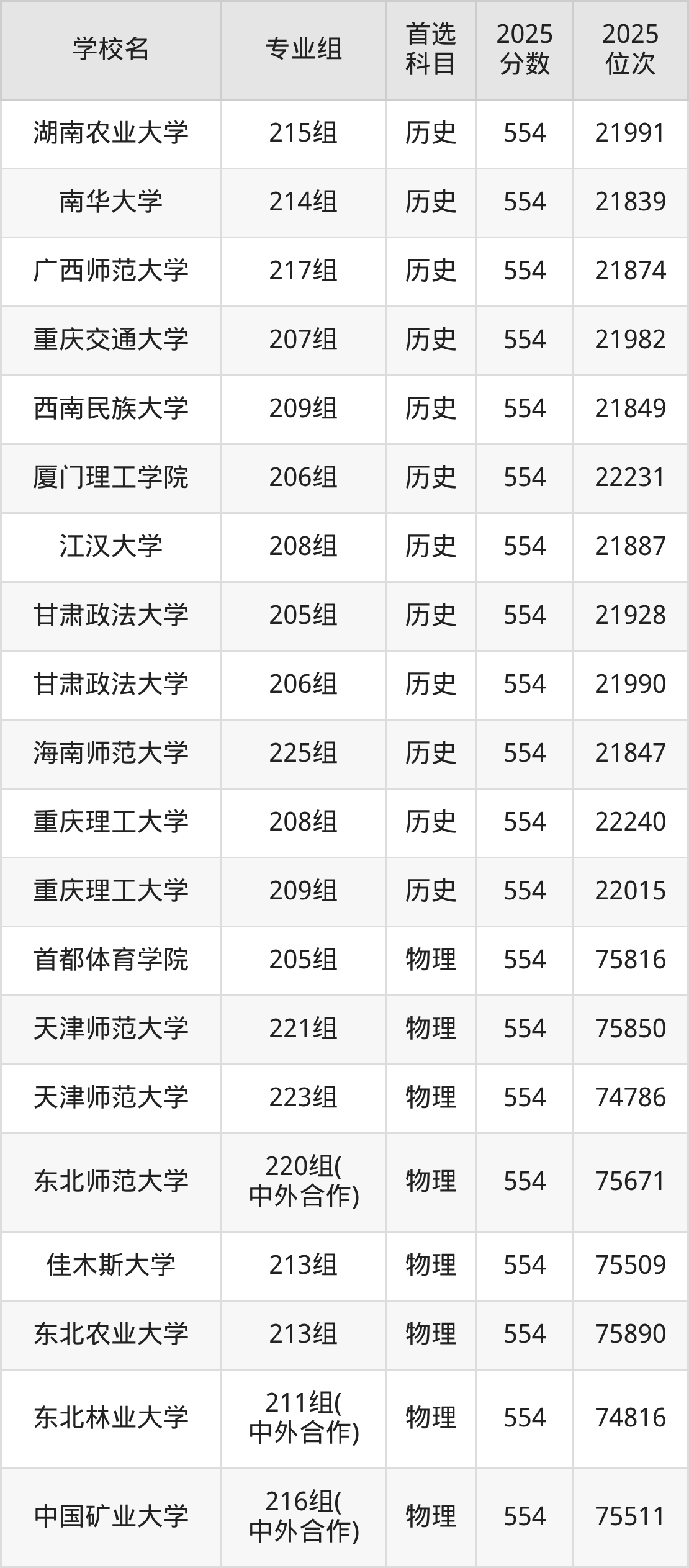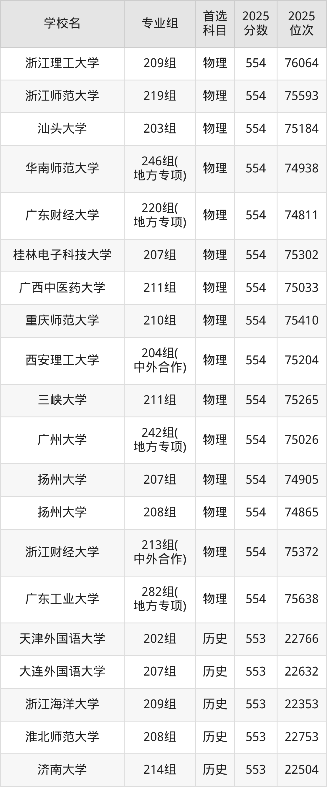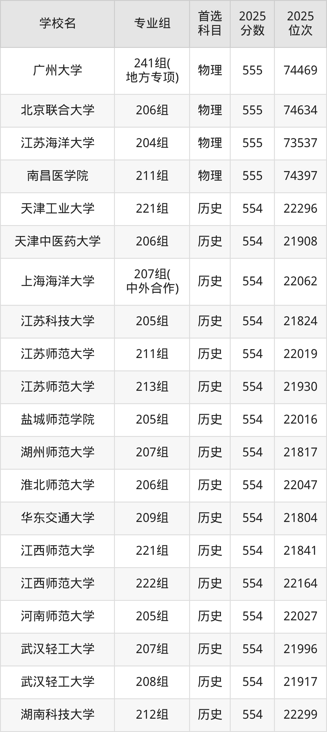 广东高考历史类554分对应的位次排名是21804名-22299名,物理类554分对应的位次排名是74786名-76064名,因此建议2026年位次排在这附近的同学考虑这些大学。