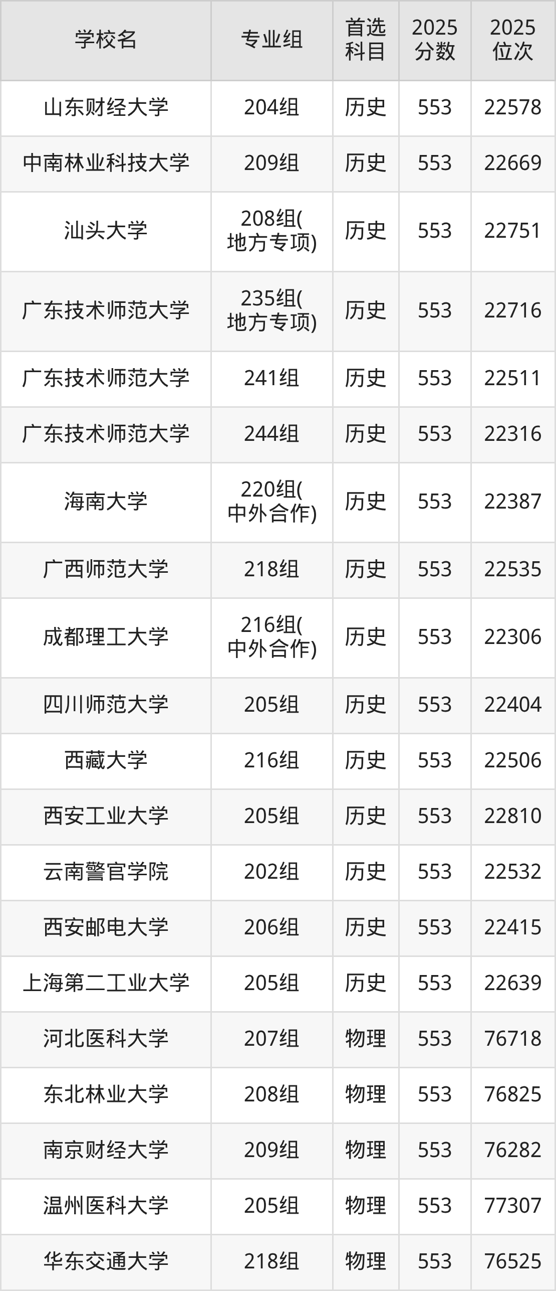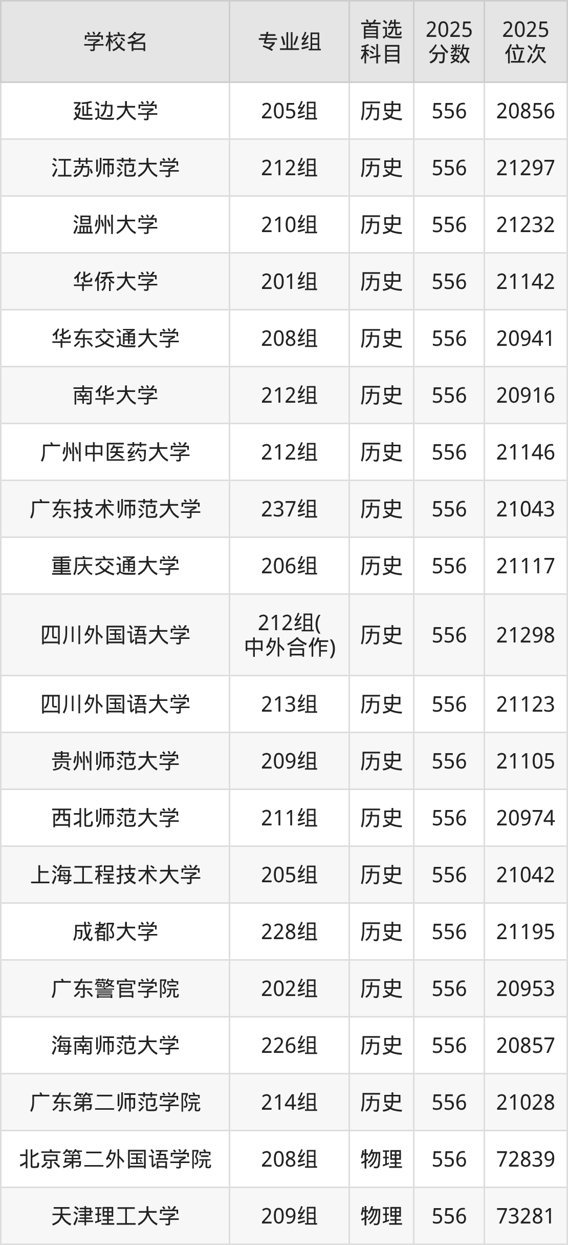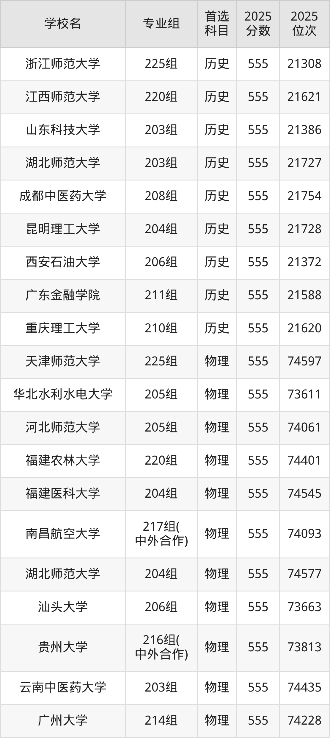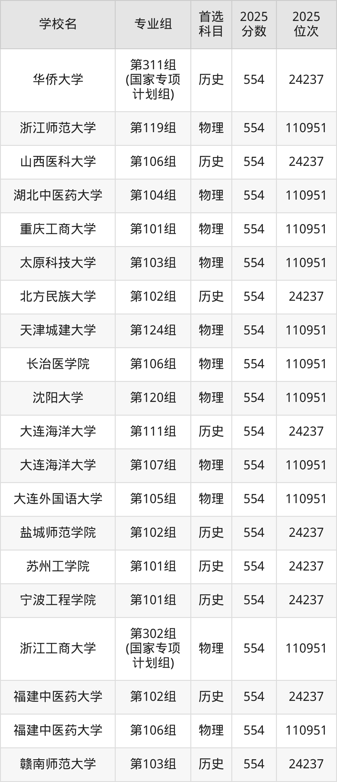 广东高考历史类554分对应的位次排名是21804名-22299名,物理类554分对应的位次排名是74786名-76064名,因此建议2026年位次排在这附近的同学考虑这些大学。