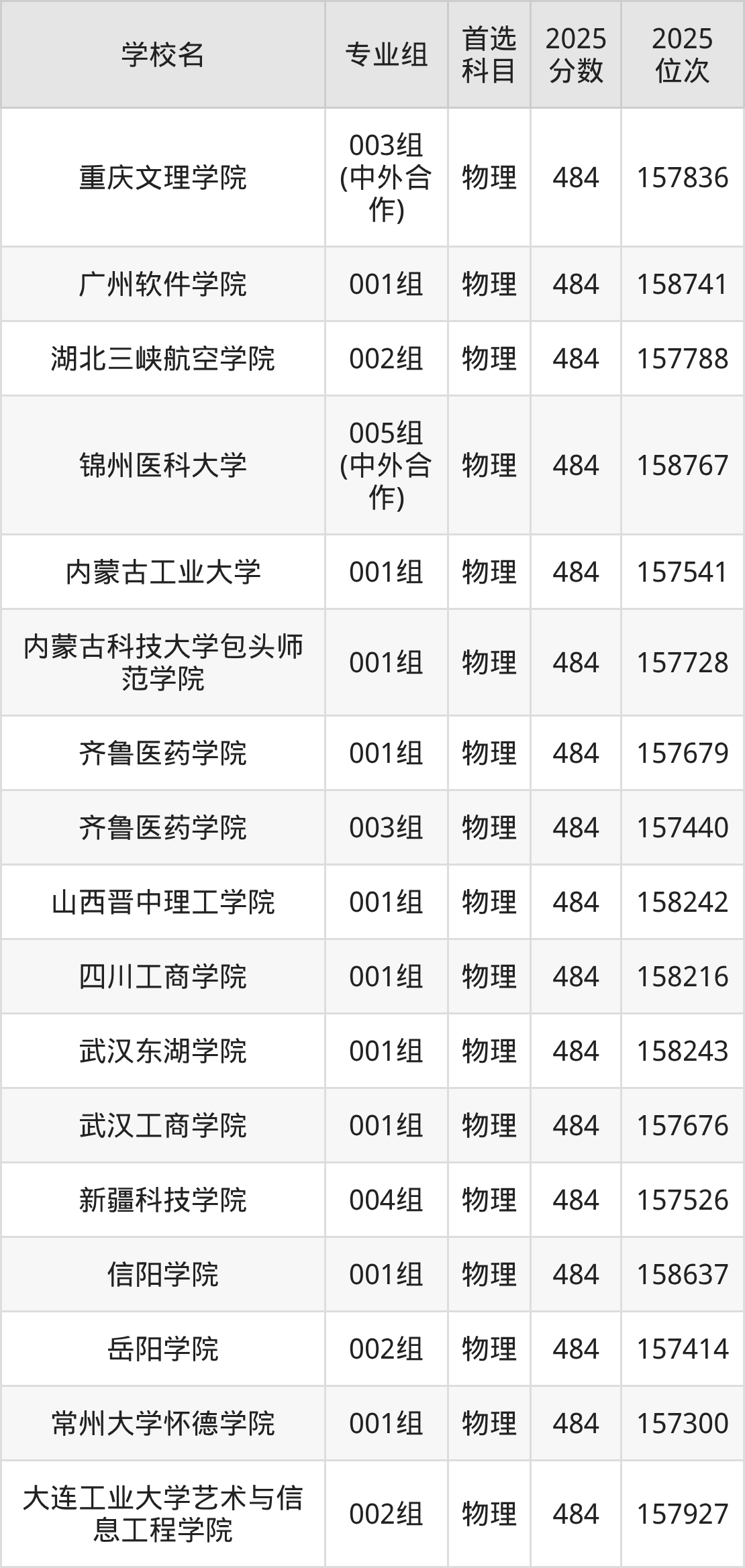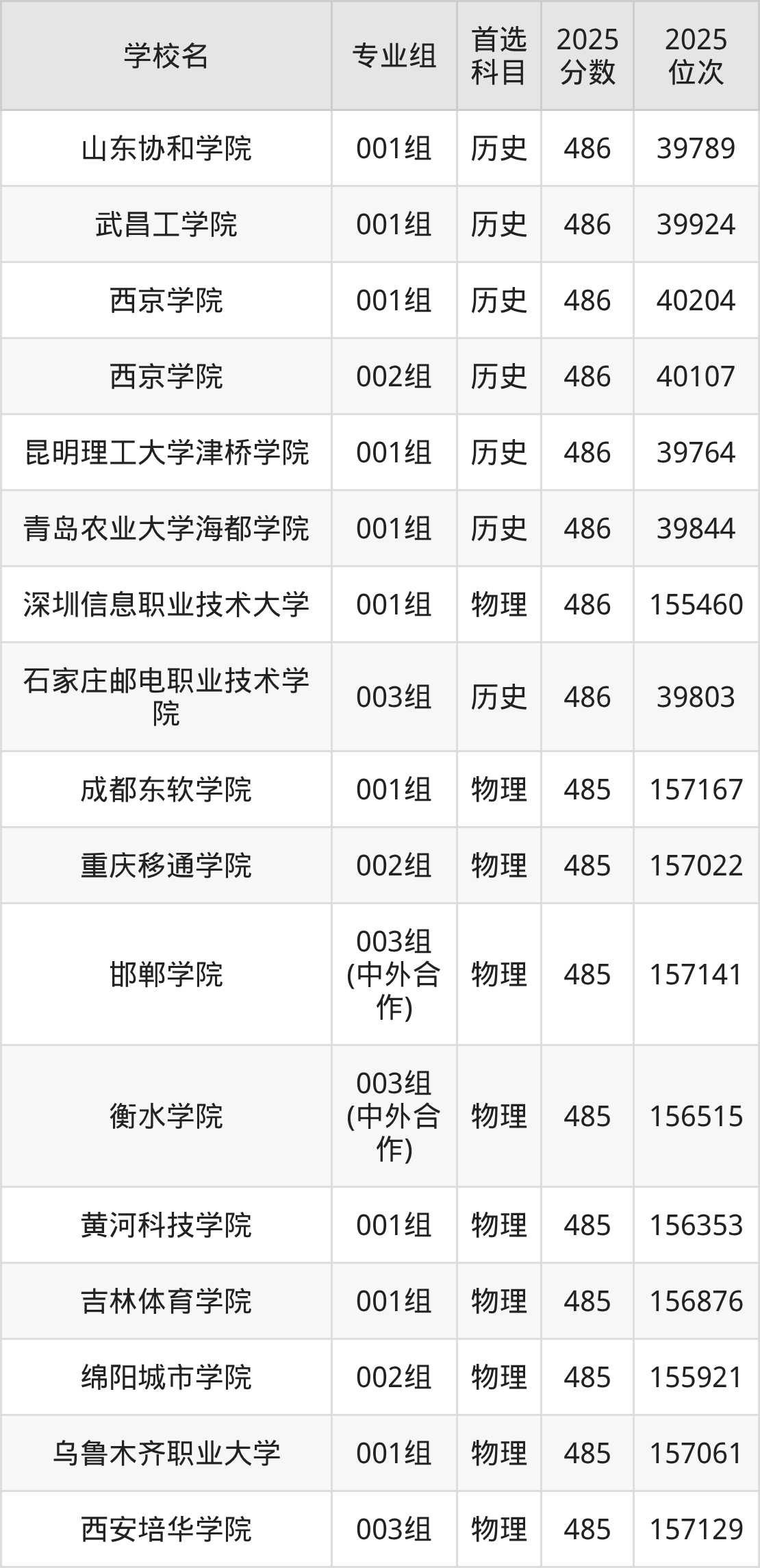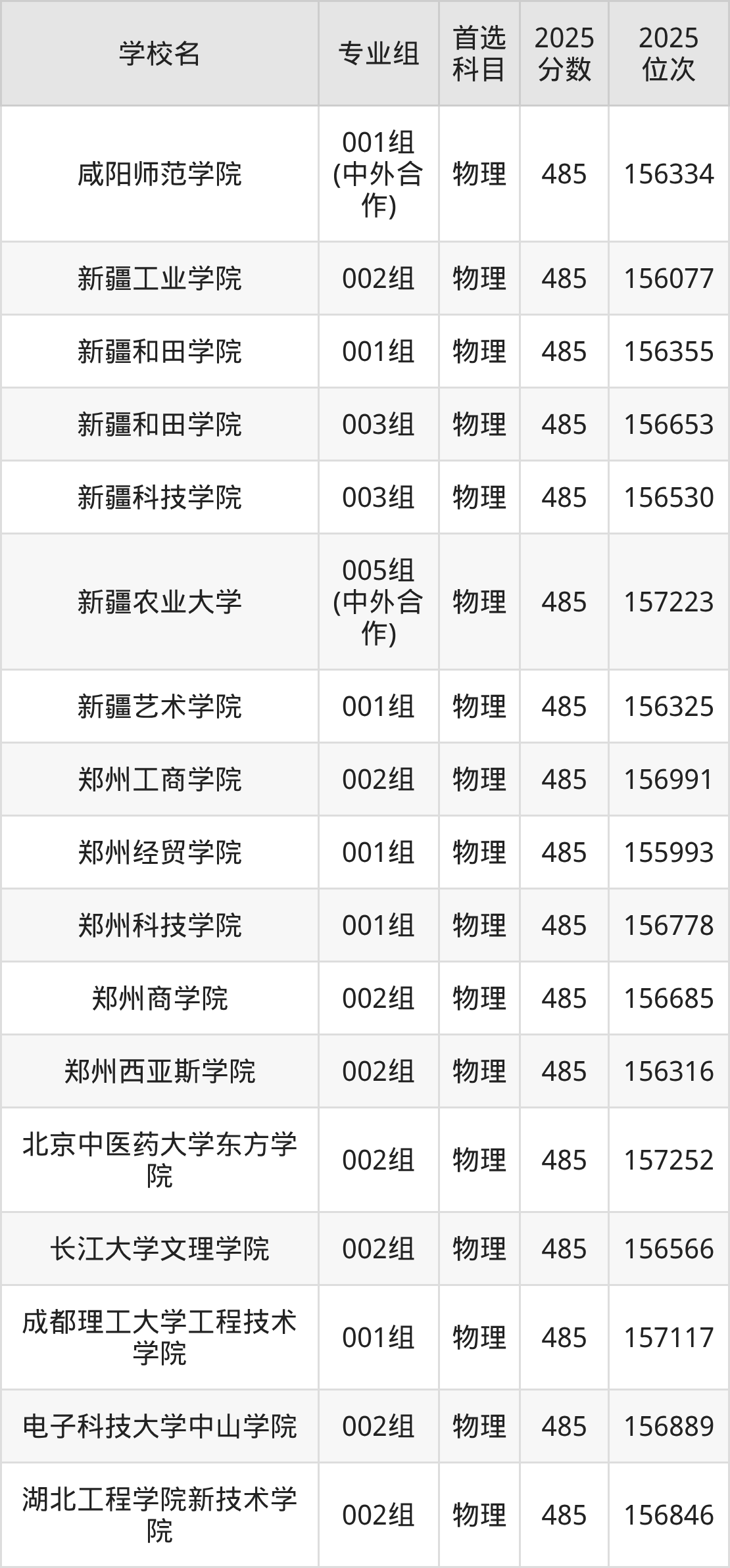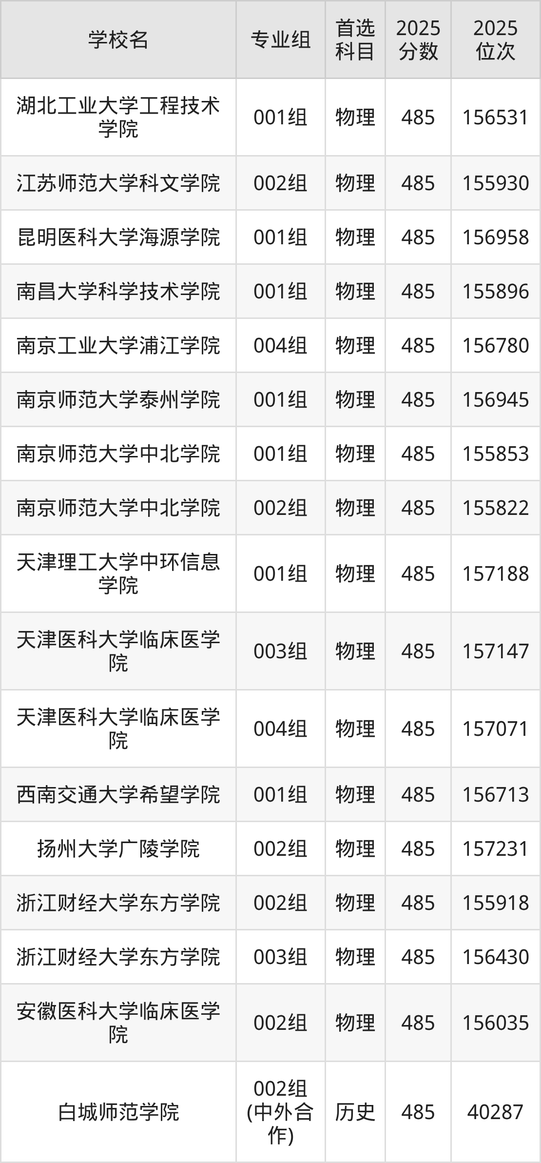 安徽高考物理类485分对应的位次排名是155822名-157252名,历史类485分对应的位次排名是40263名-40753名,因此建议2026年位次排在这附近的同学考虑这些大学。