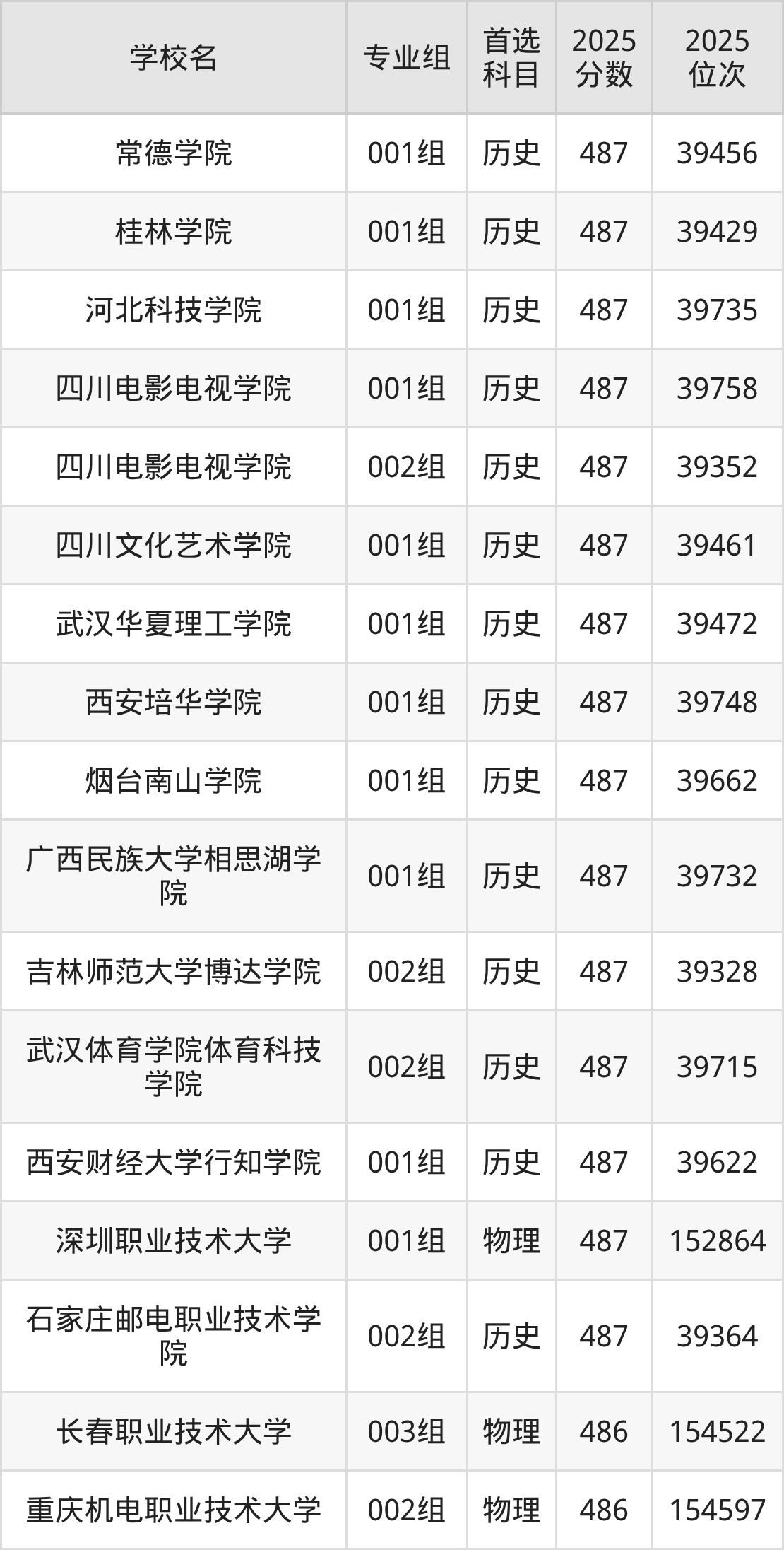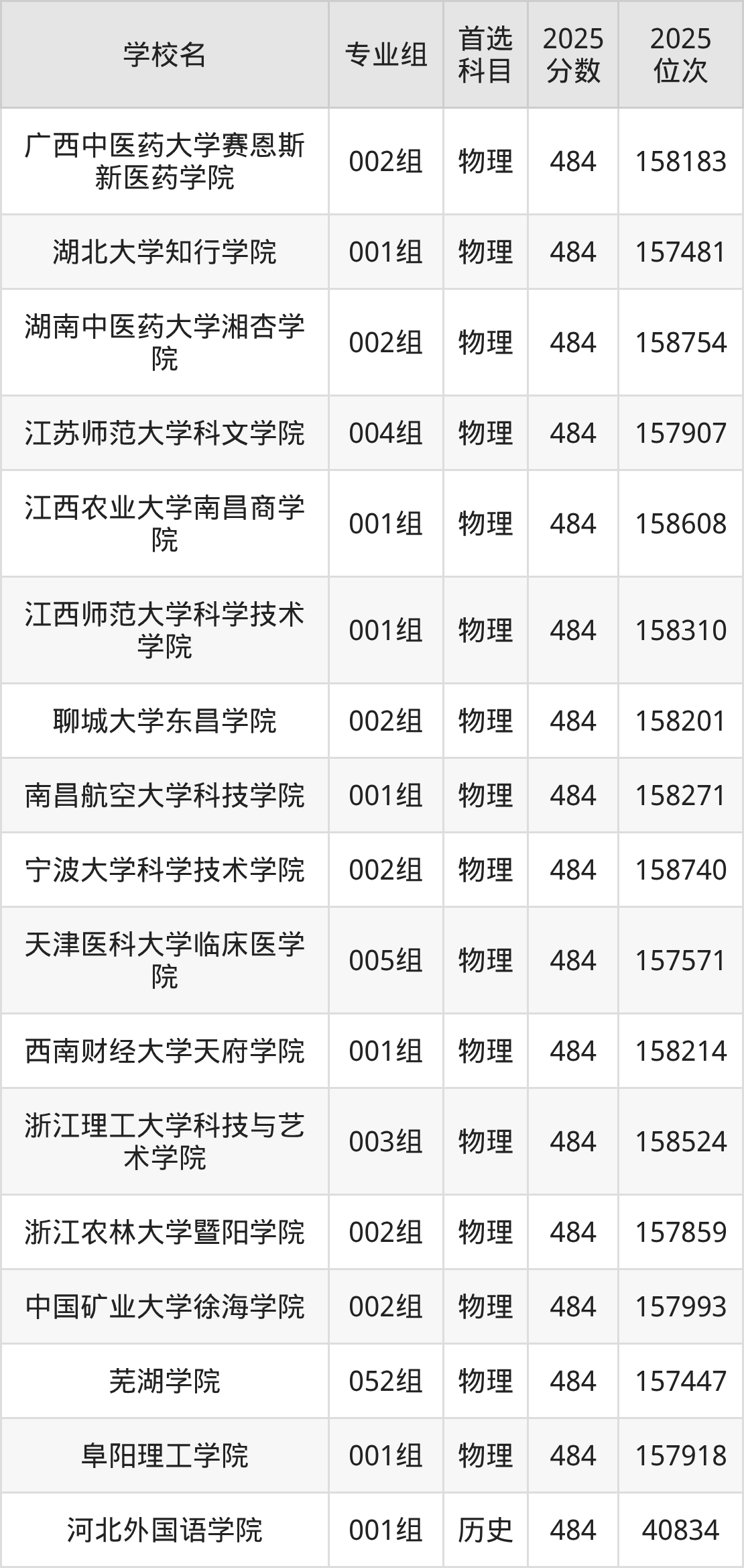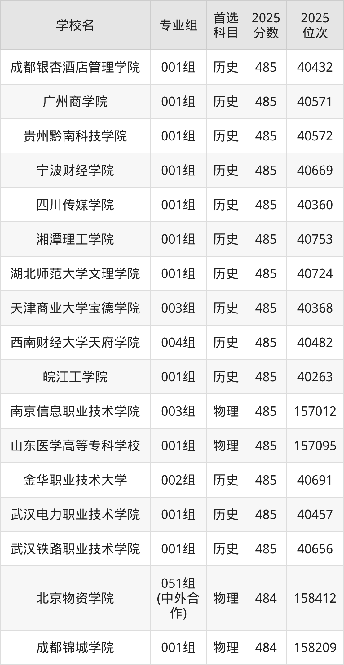 下面老师将以上文整理的其中两个省份为例,为大家具体展示485分左右能上的本科大学名单。