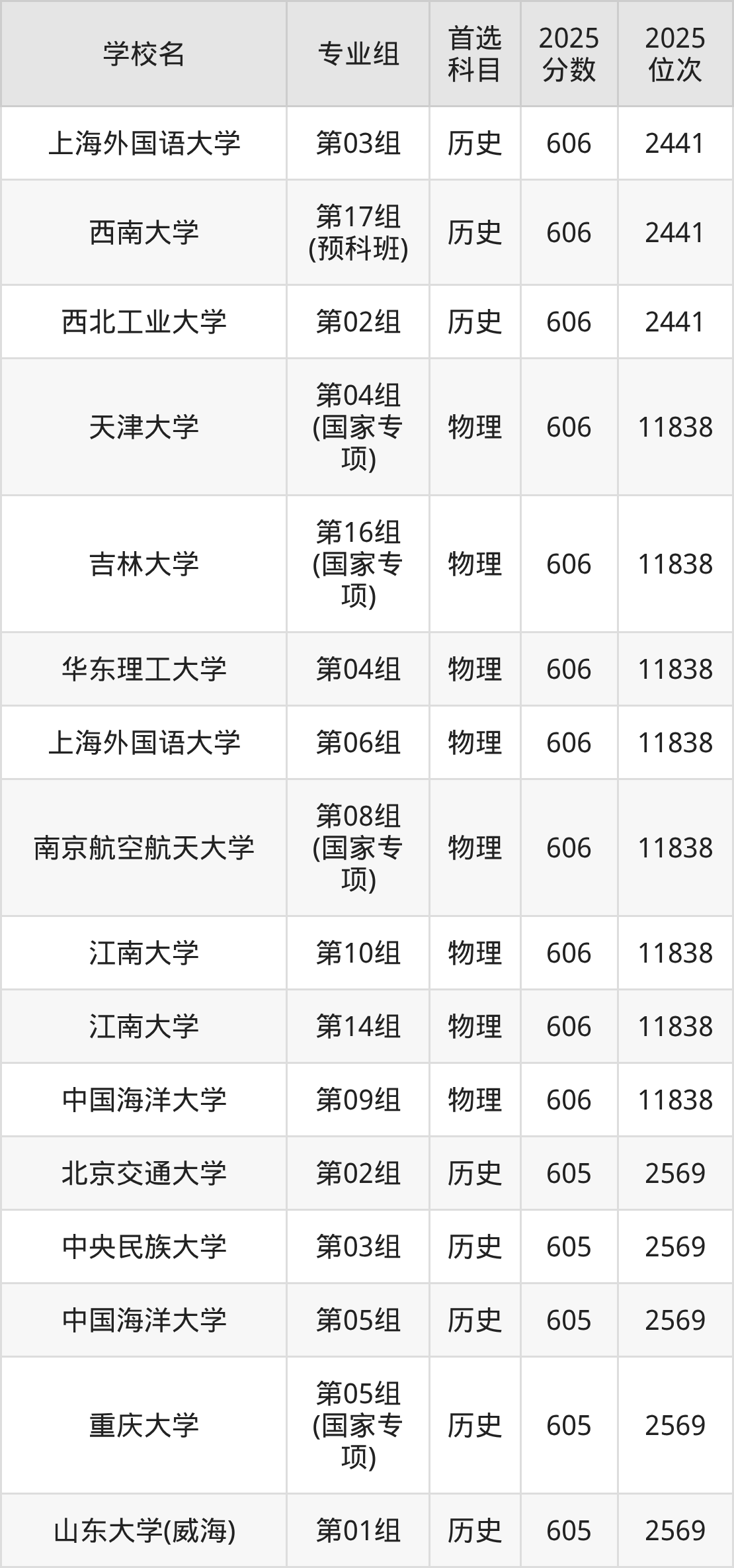 物理类604分可以冲的大学:天津大学606分、吉林大学606分、华东理工大学606分、上海外国语大学606分等;较稳妥的大学:中国传媒大学603分、对外经济贸易大学603分、中国政法大学603分、大连理工大学603分等。