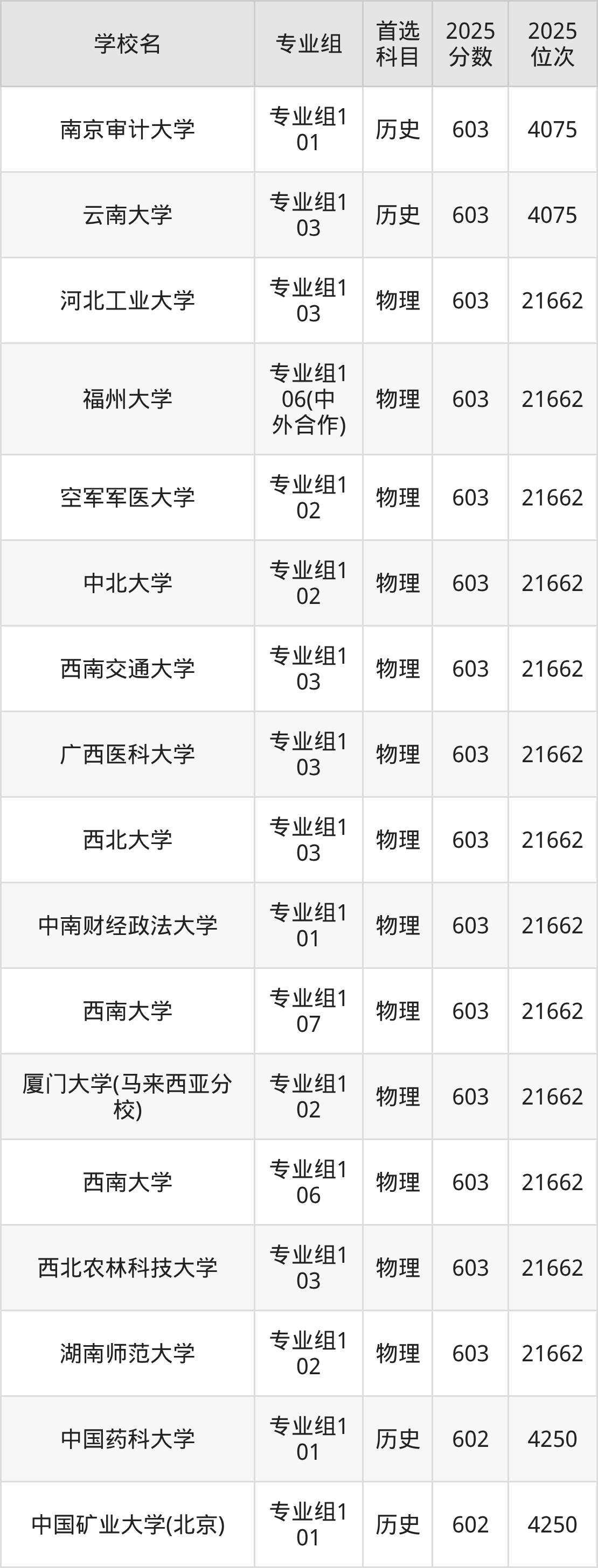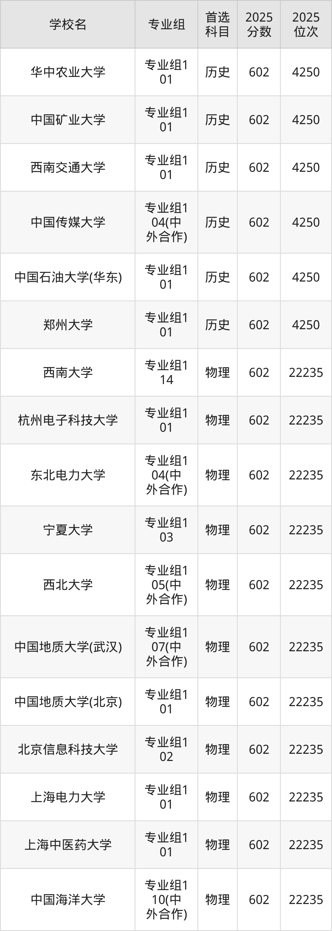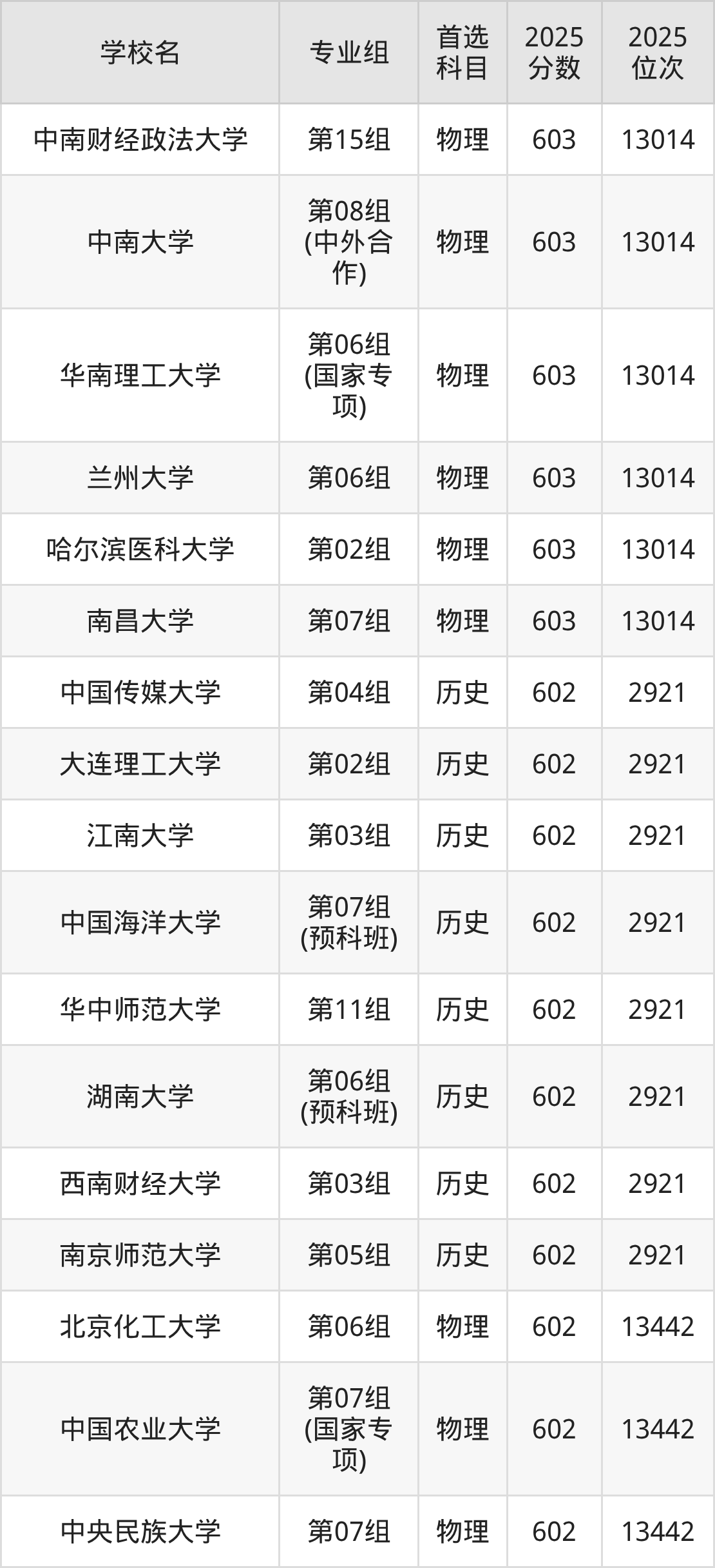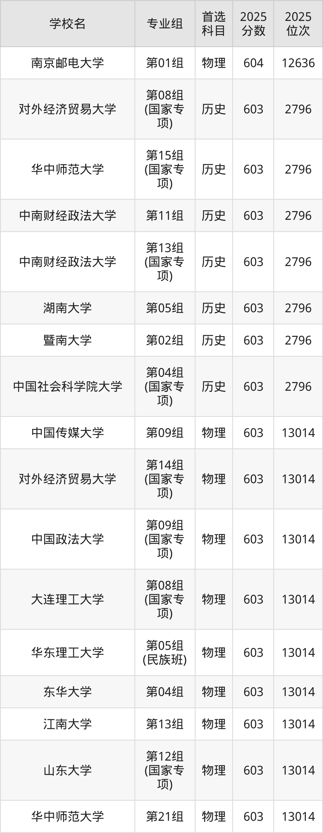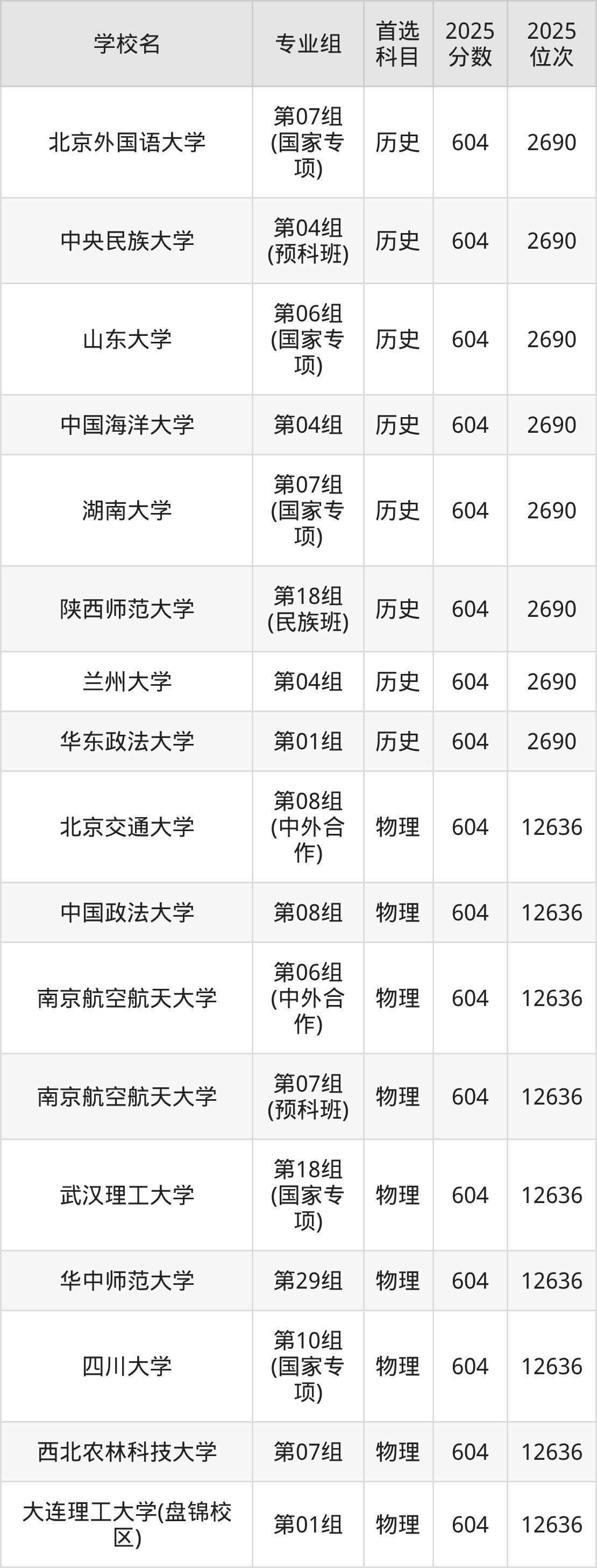 2025年在湖北高考历史类录取分数线是604分的大学有北京邮电大学、北京外国语大学、中央民族大学、山东大学、中国海洋大学、湖南大学、陕西师范大学、兰州大学、华东政法大学。物理类录取分数线是604分的大学有北京交通大学、中国政法大学、南京航空航天大学、武汉理工大学、华中师范大学、四川大学、西北农林科技大学、大连理工大学(盘锦校区)、南京邮电大学。