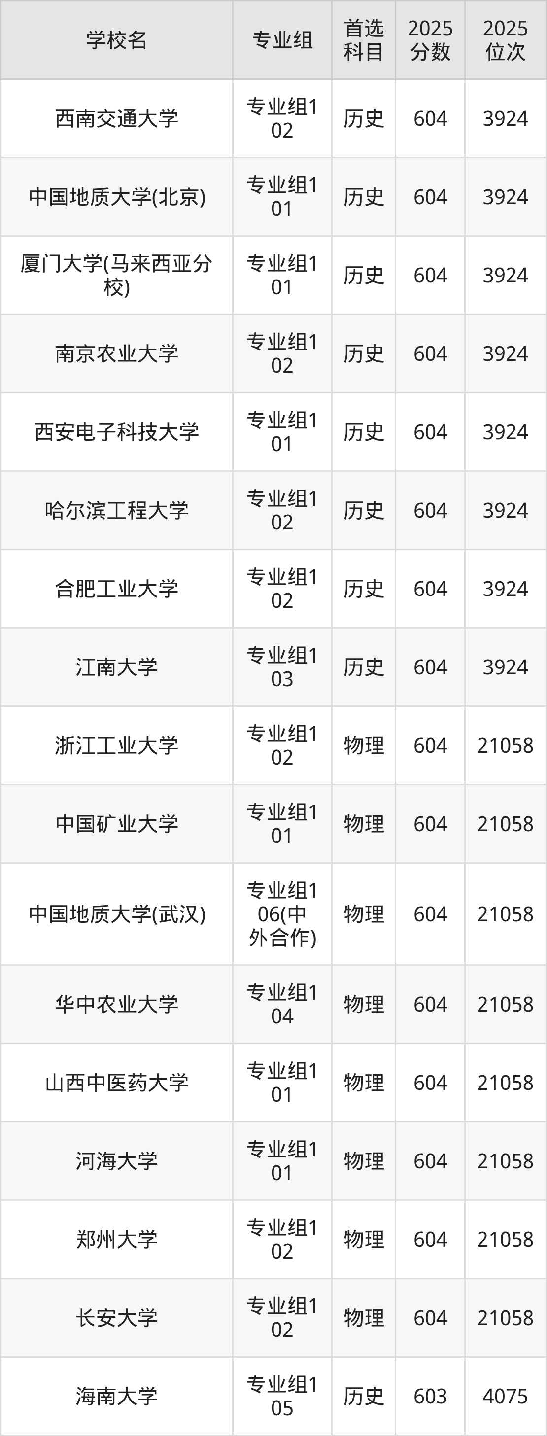 四川高考历史类604分对应的位次排名是3924名,物理类604分对应的位次排名是21058名,因此建议2026年位次排在这附近的同学考虑这些大学。
