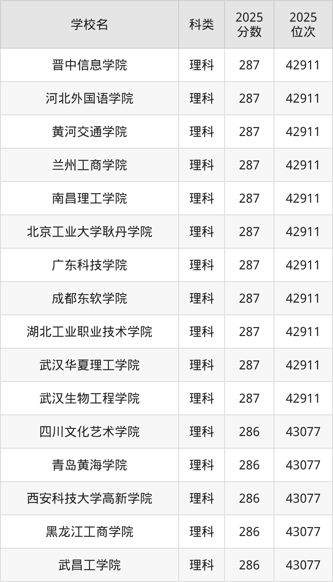 285分可以冲一冲的大学:晋中信息学院287分、河北外国语学院287分、黄河交通学院287分、兰州工商学院287分等;