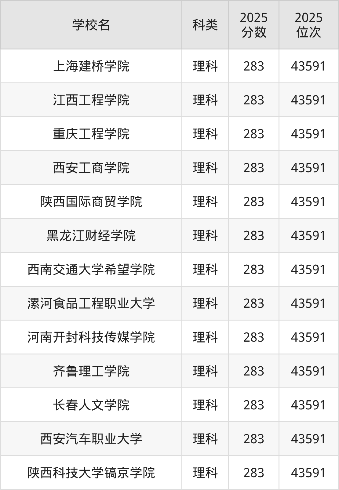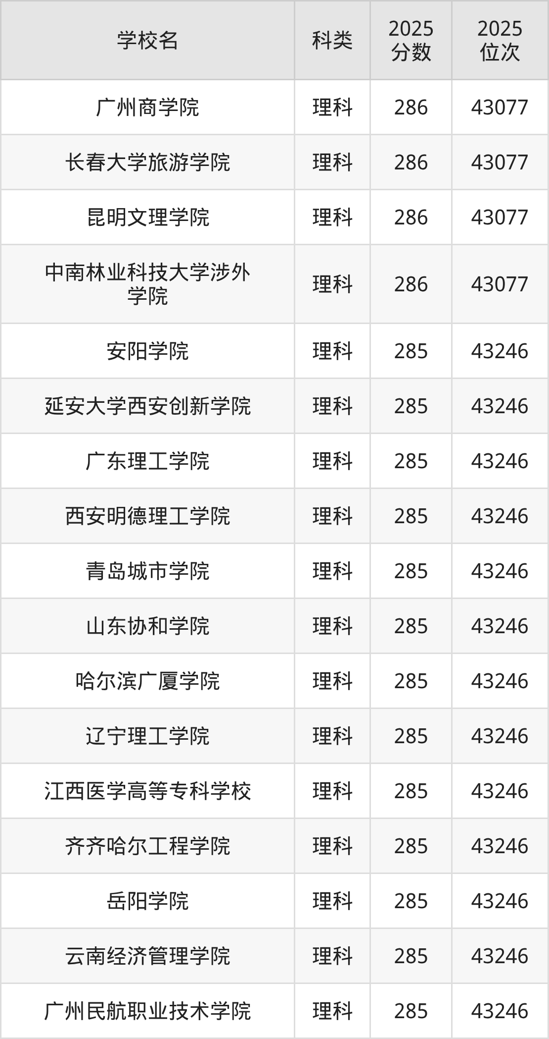 2025年在新疆高考录取分数线是285分的大学一共有13所,分别是安阳学院、延安大学西安创新学院、广东理工学院、西安明德理工学院、青岛城市学院、山东协和学院、哈尔滨广厦学院、辽宁理工学院、江西医学高等专科学校、齐齐哈尔工程学院等。