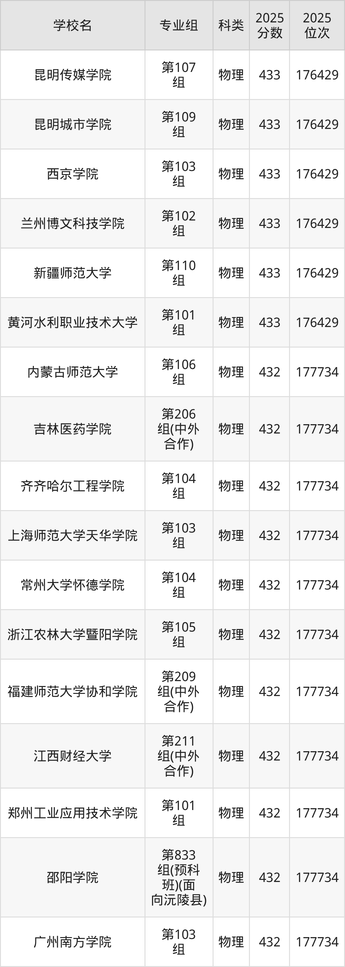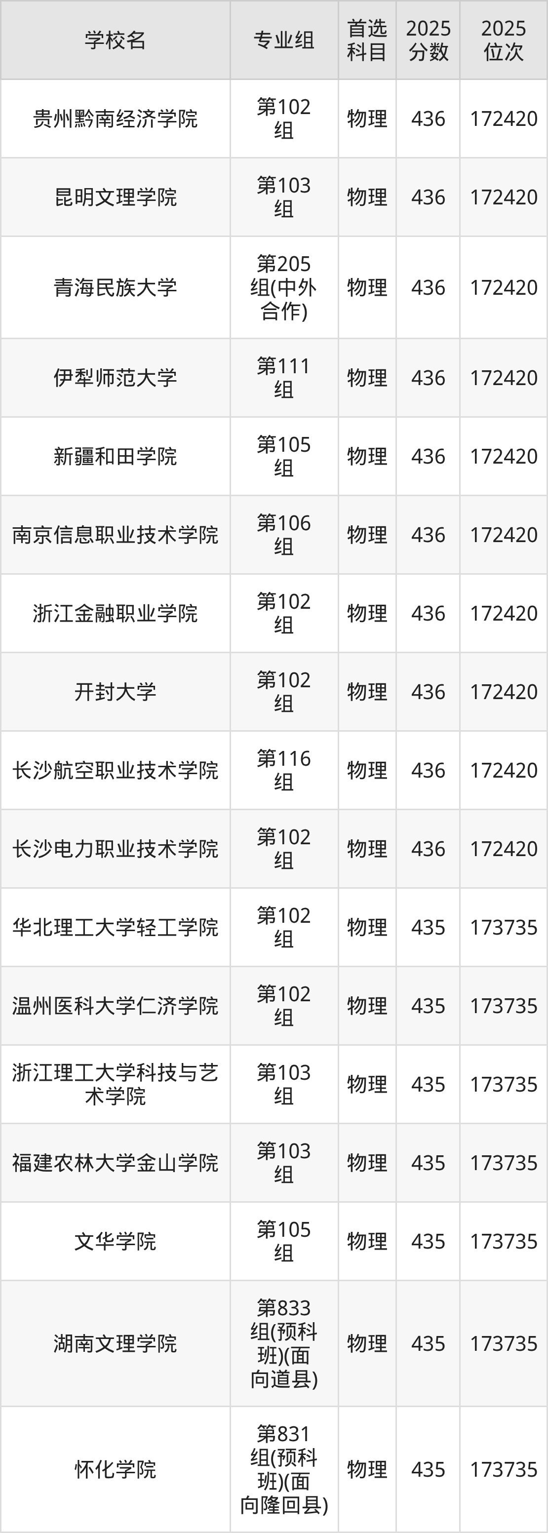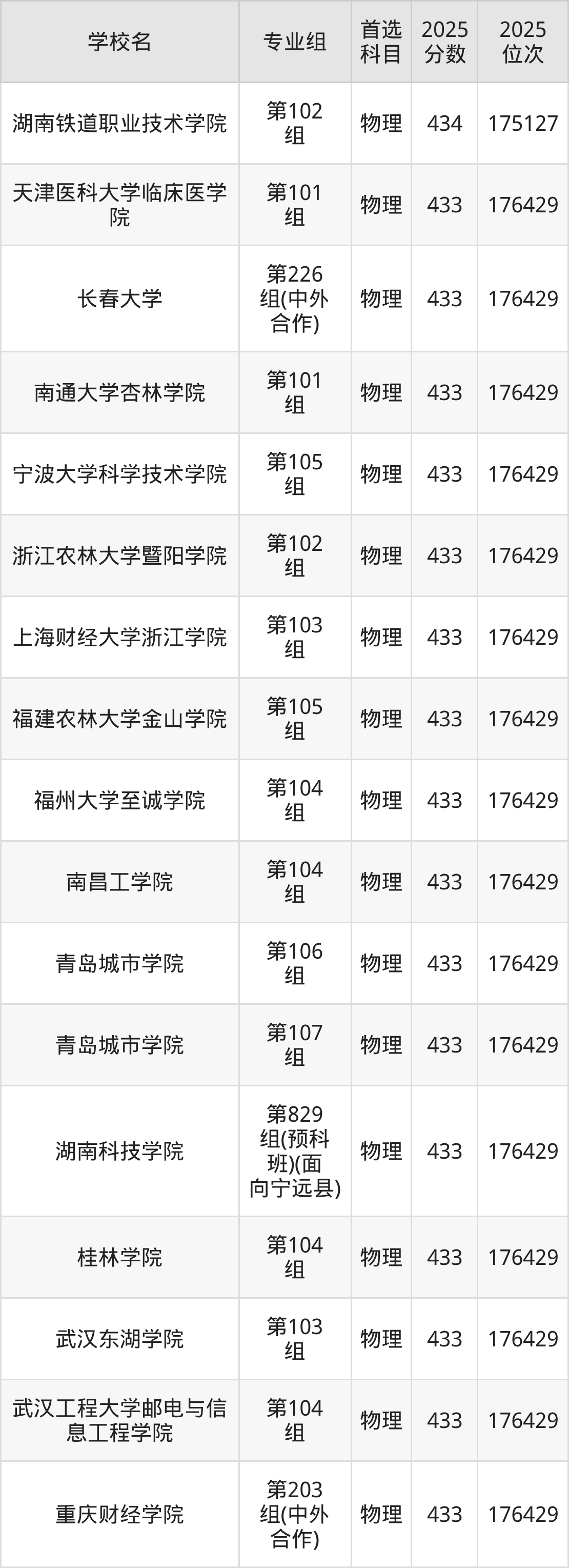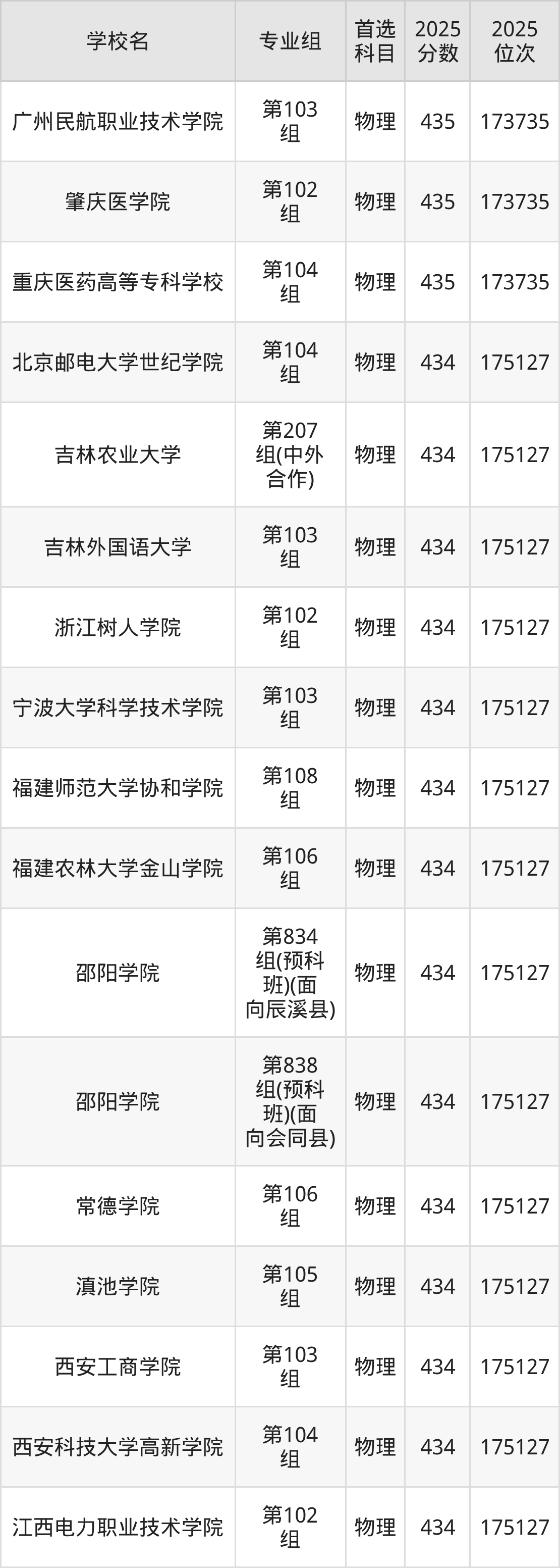 湖南物理类434分对应的位次排名是175127名,因此建议2026年位次排在这附近的考生考虑这些大学。
